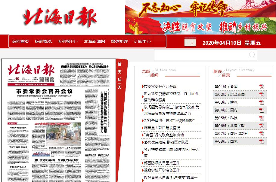 北海日?qǐng)?bào)電子版,北海日?qǐng)?bào)數(shù)字報(bào)刊平臺(tái)。《北海日?qǐng)?bào)》創(chuàng)刊于1984年10月1日,由中共北海市委主管主辦。日?qǐng)?bào)以宣傳黨的路線、方針、政策,宣傳鄧小平理論為宗旨,客觀報(bào)道重大新聞事件,傳播政治、經(jīng)濟(jì)、文化等方面的新聞信息,正確引導(dǎo)輿論,反映群眾呼聲,進(jìn)行輿論監(jiān)督,為改革開放和兩個(gè)文明建設(shè)創(chuàng)造良好的輿論環(huán)境。