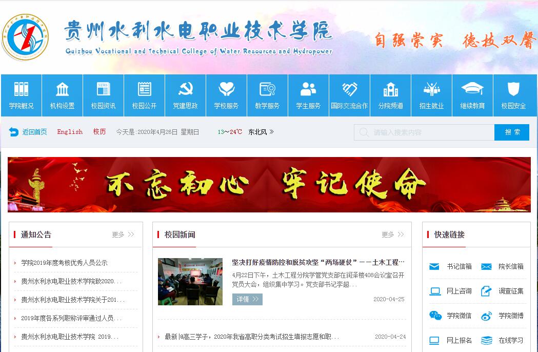 貴州水利水電職業(yè)技術(shù)學(xué)院是經(jīng)貴州省人民政府批準、國家教育部正式備案成立的全日制公辦普通高職院校,前身為1956年創(chuàng)建的貴州省水利電力學(xué)校,隸屬于貴州省水利廳。新校區(qū)位于貴州(清鎮(zhèn))職教城,占地面積600畝,規(guī)劃建筑面積31.4萬平方米,是一所蘊含濃郁水文化特色的節(jié)水節(jié)能、環(huán)保生態(tài)的現(xiàn)代化智慧校園。經(jīng)過六十多年的建設(shè)發(fā)展,學(xué)院現(xiàn)已成為一所以高職為主、中職為輔、成人繼續(xù)教育協(xié)調(diào)發(fā)展、水利水電特色鮮明的高等職業(yè)院校,目前學(xué)院在校學(xué)生1萬余人。建校以來,學(xué)院面向地方和水利電力行業(yè)培育了數(shù)萬名水利電力類的應(yīng)用型合格人才,為貴州水利水電事業(yè)做出了積極貢獻,被貴州省水利廳授予“貴州水利人才搖籃”殊榮,學(xué)院先后榮獲“全國學(xué)校德育工作先進集體”、“全國水利系統(tǒng)先進單位”、“全國水利文明單位”等近百項各級各類表彰及榮譽稱號,畢業(yè)生就業(yè)率長期穩(wěn)定在98%以上,贏得了良好的辦學(xué)聲譽。學(xué)院堅持社會主義辦學(xué)方向,全面貫徹黨的教育方針,落實立德樹人根本任務(wù),秉承“自強崇實、德技雙馨”校訓(xùn),堅持“德育為先、能力為重、全面發(fā)展”和“嚴在當(dāng)嚴處、愛在細微中”的育人理念,對學(xué)生在政治思想、生活學(xué)習(xí)、工作就業(yè)等全面關(guān)心基礎(chǔ)上實行嚴格的教育管理和規(guī)范要求,強調(diào)“全員、全程、全方位”育人,搭建思政教學(xué)主渠道、黨課教育、道德講堂、校園文化周、志愿者服務(wù)、社團活動等各類豐富多彩的育人平臺,始終把“培養(yǎng)什么人”放在學(xué)院各項工作的首位,育人成效顯著,被教育部、人社部共同授予“全國學(xué)校德育工作先進集體”。學(xué)院目前開設(shè)有水利工程類、電力工程類、土木工程類、管理工程類四大專業(yè)群,高、中職共計三十多個專業(yè),始終大力推行工學(xué)結(jié)合、產(chǎn)教融合、校企合作人才培養(yǎng)模式,與貴州水投集團公司、貴州建工集團、中天城投物管公司、帝豪花園酒店等省內(nèi)外企業(yè)廣泛開展深度校企合作,舉辦訂單班,推行"雙主體"育人,推進項目化教學(xué)課程改革,高標準建設(shè)以水工綜合實訓(xùn)中心——“大禹館”和建筑工程實訓(xùn)中心——“魯班館”為代表的、能滿足各專業(yè)實訓(xùn)教學(xué)需要的校內(nèi)實訓(xùn)基地和實訓(xùn)室,彰顯“做、學(xué)、教”一體化的職教特色,學(xué)生在全省全國技能大賽中屢獲佳績,先后獲得“全國職業(yè)院校技能大賽國家級一等獎、省級二等獎、省級三等獎”等獎項,學(xué)院以水利人才培養(yǎng)的突出成績榮獲水利部、人社部共同授予“全國水利系統(tǒng)先進單位”。學(xué)院高度注重教師隊伍建設(shè),現(xiàn)有教職員工411人,其中專任教師298人,高級職稱教師72人,碩士研究生以上學(xué)歷111人,學(xué)院先后涌現(xiàn)出“全國優(yōu)秀教師”、“全國職業(yè)教育先進個人”、“全國職教名師”、“全國水利職教名師”、“全省優(yōu)秀教師”、“全省優(yōu)秀教育工作者”等一大批先進典型。近年來,學(xué)院積極響應(yīng)國家“一帶一路”倡議,大力推進國際交流與合作,實現(xiàn)國際化辦學(xué),招收孟加拉國、泰國、柬埔寨等國的留學(xué)生在校學(xué)習(xí),學(xué)院先后與泰國、柬埔寨、馬來西亞、臺灣等多所高校建立校際合作關(guān)系,每年也組織優(yōu)秀學(xué)生到境外大學(xué)進行交流學(xué)習(xí);在柬埔寨開辦的“柬埔寨·馬德望省理工學(xué)院中國·貴州水利水電職業(yè)技術(shù)學(xué)院亞龍絲路學(xué)院”正式掛牌,成為貴州省第一個“走出去”辦學(xué)的高職院校;與哥斯達黎加國家技術(shù)i研究中心簽署《共建中國·貴州水利水電職業(yè)技術(shù)學(xué)院哥斯達黎加絲路學(xué)院協(xié)議》,再次開啟境外辦學(xué)創(chuàng)新性實踐。學(xué)院高度重視精準扶貧工作,專門成立“脫貧攻堅辦公室”,充分發(fā)揮職業(yè)教育助力脫貧攻堅的優(yōu)勢。精準資助,采取減免費用、設(shè)立獎學(xué)金和助學(xué)金、提供勤工助學(xué)崗位等多種資助方式,幫助家庭經(jīng)濟困難學(xué)生完成學(xué)業(yè);送教下鄉(xiāng),為貧困村民提供技能培訓(xùn),提升就業(yè)能力和薪酬水平;“校農(nóng)結(jié)合”,拓展與貧困農(nóng)村的幫扶合作,助推貧困地區(qū)產(chǎn)業(yè)發(fā)展;主動作為,攜手政府和企業(yè)共同舉辦“全免費訂單職業(yè)教育精準脫貧班”,創(chuàng)造為廣大學(xué)子“拎包就讀”的政策條件,搭建“招生——培養(yǎng)——就業(yè)”直通車。學(xué)院與河海大學(xué)、華北水利水電大學(xué)、南昌工程學(xué)院聯(lián)辦成人大專、本科教育,同時是全國電工進網(wǎng)作業(yè)許可證培訓(xùn)考試基地、貴州省第十一國家職業(yè)技能鑒定站、水利行業(yè)特有工種職業(yè)技能鑒定站。學(xué)院將繼續(xù)堅持新時代中國特色社會主義辦學(xué)方向,積極貫徹黨的教育方針,踐行社會主義核心價值觀,全面落實立德樹人根本任務(wù),不斷深化教育教學(xué)