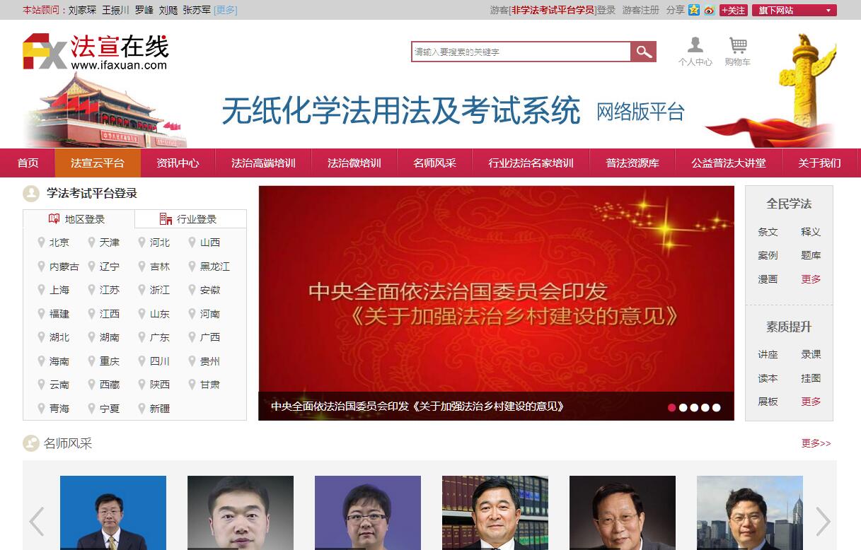 法宣在線(www.faxuan.net),國(guó)家工作人員在線普法學(xué)習(xí)考試平臺(tái),無(wú)紙化學(xué)法用法及考試系統(tǒng)。提供法治培訓(xùn)講座、普法視頻、法治公開課、七五普法等在線法治宣傳教育資料。國(guó)家工作人員在線學(xué)法考試平臺(tái)暨《無(wú)紙化學(xué)法用法及考試系統(tǒng)》網(wǎng)絡(luò)版平臺(tái) ,是在全國(guó)普法辦《無(wú)紙化學(xué)法用法及考試系統(tǒng)》十多省份數(shù)百萬(wàn)人在線使用的基礎(chǔ)上取長(zhǎng)補(bǔ)短,并結(jié)合4G 移動(dòng)網(wǎng)絡(luò)的普及運(yùn)用,采用云計(jì)算 + 云負(fù)載 + 移動(dòng)端技術(shù)開發(fā)的,是目前國(guó)內(nèi)唯一一套能夠?qū)崿F(xiàn)千萬(wàn)級(jí)學(xué)員在線、百萬(wàn)級(jí)考生同時(shí)考試的無(wú)紙化學(xué)法用法及考試系統(tǒng)的升級(jí)換代產(chǎn)品?!稛o(wú)紙化學(xué)法用法及考試系統(tǒng)》網(wǎng)絡(luò)版平臺(tái),除嚴(yán)格按照國(guó)家普法規(guī)劃要求設(shè)置了幾十門學(xué)法“公共課程、行業(yè)課程”外,還特別添加了“法治高端培訓(xùn)、法治微講座、行政執(zhí)法資格證”等諸多精品課程,是領(lǐng)導(dǎo)干部、公務(wù)員、企業(yè)管理人員必備的學(xué)習(xí)資源庫(kù)。目前已有山西、內(nèi)蒙古、吉林、黑龍江、河南、湖北、湖南、福建、江蘇、山東、廣東、廣西、海南、四川、貴州、云南、陜西、青海、寧夏、新疆等20?。ㄖ陛犑?、自治區(qū))的組織、宣傳、司法、人社、國(guó)資等部門聯(lián)合發(fā)文實(shí)施無(wú)紙化學(xué)法用法及普法考試工作,注冊(cè)用戶770多萬(wàn)人。