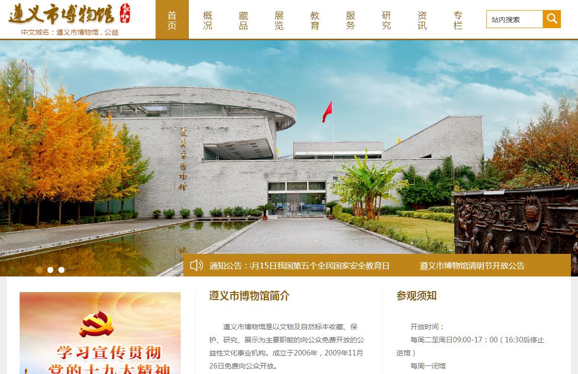 遵義市博物館是以文物及自然標(biāo)本收藏、保護(hù)、研究、展示為主要職能的向公眾免費(fèi)開放的公益性文化事業(yè)機(jī)構(gòu)。成立于2006年,2009年11月26日免費(fèi)向公眾開放?;A(chǔ)陳列《遵義之美》,共分資源富市、文化瑰寶、紅色熱土、多彩民俗、國酒之鄉(xiāng),輝煌成就六個(gè)部分,向公眾展示遵義秀美的山川、深厚的歷史、革命的傳統(tǒng)、濃郁的風(fēng)情、飄香的美酒、輝煌的成就。博物館坐落于遵義市匯川區(qū)人民路與珠海路交匯處,總占地面積14873平方米,建筑面積8201平方米。建筑整體設(shè)計(jì)體現(xiàn)了中國傳統(tǒng)的天圓地方理念。外墻用本地天然青石加工的表面凹凸紋青石磚進(jìn)行裝飾,既富有地域特色,又充滿現(xiàn)代氣息。內(nèi)部設(shè)有電子監(jiān)控系統(tǒng)、中央空調(diào)系統(tǒng)、消防安全系統(tǒng)、配電照明系統(tǒng)、語音導(dǎo)覽系統(tǒng)、無線團(tuán)隊(duì)講解系統(tǒng)等先進(jìn)設(shè)備。崛起的遵義市博物館,為遵義市增加了一個(gè)文化亮點(diǎn),也為廣大市民提供了了解遵義歷史和進(jìn)行文化休閑娛樂的最佳場所。