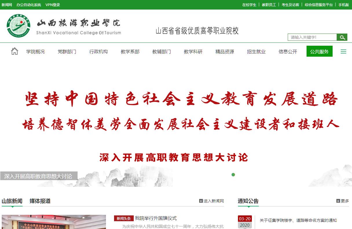 山西旅游職業(yè)學院前身是山西省計劃統(tǒng)計學校,始建于1980年,至今已有39年的辦學歷史。1983年學院成立山西大學分校和山西財經學院分院,并在此基礎上成立山西經濟管理學院。1985年院校分開辦學。1991年,學校成為當時全省125所中專學校中首批7所國家級重點中專之一。2001年學校與山西財經大學聯(lián)合組建山西財經大學經濟信息學院,開始舉辦高職教育。2004年1月,根據山西省產業(yè)結構調整的迫切要求和新興支柱產業(yè)發(fā)展對旅游專門人才的大量需求,在省委省政府的安排下,我院被正式批準升格為高職院校,成立山西旅游職業(yè)學院。省發(fā)展和改革委員會為主管部門,省教育廳為教育教學業(yè)務管理部門,省旅游局為旅游業(yè)務指導部門。2008年學院通過首輪高職院校人才培養(yǎng)工作水平評估驗收,成績良好;2008年1月,學院作為理事長單位牽頭組建成立了山西旅游職業(yè)教育集團;2014年,學院在山西省高職人才培養(yǎng)工作水平評估中獲得優(yōu)秀等級;同年,學院成為全省18所由政府補貼的高校畢業(yè)生創(chuàng)業(yè)培訓定點單位之一;2015年由省旅游局牽頭由學院主導的現代學徒制人才培養(yǎng)模式試點建設工作獲國家教育部立項,我院成為山西旅游行業(yè)現代學徒制模式技術技能型人才培養(yǎng)試點主要實施單位。2018年學院被省教育廳、省財政廳確立為山西省優(yōu)質高等職業(yè)院校建設單位。學院位于省城太原高校云集的學府區(qū),緊鄰太原鐵路客運南站。學院占地面積382畝,校舍建筑面積10.48萬平方米。館藏紙質圖書資料43.9萬冊。專任教師252人,在校生5108人。優(yōu)越的辦學條件為建設優(yōu)秀的高職高專院校奠定了堅實的物質基礎。學院教學系部有7系2部1院,開設旅游管理系、酒店管理系、旅游文化與藝術系、旅游外語系、國際經濟與貿易系、經濟管理系、計算機科學系、思想政治教學研究部、公共課教學部9個教學系部和成人教育學院,開設有旅游管理、導游、酒店管理、烹飪工藝與營養(yǎng)、應用韓語、空乘服務、寶玉石鑒定與加工、文物修復與保護等31個高職專業(yè),其中導游、酒店管理為央財支持專業(yè)和省級特色專業(yè),旅游管理為省級重點專業(yè)、會計電算化為省級品牌專業(yè)。2018年學院烹飪工藝與營養(yǎng)專業(yè)、酒店管理專業(yè)、導游專業(yè)成為山西省高等職業(yè)教育骨干專業(yè)。學院擁有校內實習實訓室62個,其中央財支持實習實訓基地1個(寶玉石鑒定與營銷實習實訓基地);省級示范實習實訓基地5個(工程造價實訓基地、導游專業(yè)實訓基地、旅游管理專業(yè)實訓基地、航空服務專業(yè)實訓基地、酒店管理專業(yè)實訓基地);校辦生產性實習實訓基地1個(學院五臺山酒店實習實訓基地)。自成立以來,已累計培養(yǎng)大中專學生2萬余名,為我省產業(yè)結構轉型和地方經濟發(fā)展做出了積極貢獻。學院連續(xù)22年被評為省直文明單位標兵單位,連續(xù)20年被評為省級文明單位。