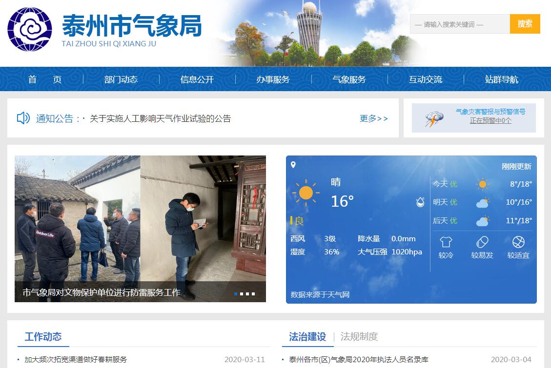 泰州市氣象局于96年10月籌建,97年1月經(jīng)中國氣象局批準,在原縣級泰州市氣象局的基礎(chǔ)上,升格組建地級氣象局?,F(xiàn)內(nèi)設(shè)辦公室、人事教育處、業(yè)務(wù)法規(guī)處等三個科級行政處室和氣象臺、專業(yè)氣象臺、防雷中心、財務(wù)核算中心等四個科級業(yè)務(wù)單位,轄靖江、泰興、姜堰、興化四個縣級市氣象局。全市氣象部門現(xiàn)有在職職工81人(含內(nèi)退4人)。其中35歲以下35人,占43%,本科以上學(xué)歷33人,占41%,中級職稱人員為41名,高級職稱人員為5人,省局“1050”培養(yǎng)對象1人,省“333”第三層次學(xué)科帶頭人1人。市局在職職工32人(其中內(nèi)退1人),35歲以下19人,本科以上學(xué)歷20人,中級職稱人員14人,高級職稱人員3人。其主要職責(zé):(一)制定地方氣象事業(yè)發(fā)展規(guī)劃、計劃,并負責(zé)本行政區(qū)域內(nèi)氣象事業(yè)發(fā)展規(guī)劃、計劃及氣象業(yè)務(wù)建設(shè)的組織實施;負責(zé)本行政區(qū)域內(nèi)重要氣象設(shè)施建設(shè)項目的審查;對本行政區(qū)域內(nèi)的氣象活動進行指導(dǎo)、監(jiān)督和行業(yè)管理。(二)組織管理本行政區(qū)域內(nèi)氣象探測資料的匯總、分發(fā);依法保護氣象探測環(huán)境;管理本行政區(qū)域內(nèi)涉外氣象活動。(三)在本行政區(qū)域內(nèi)組織對重大災(zāi)害性天氣跨地區(qū)、跨部門的聯(lián)合監(jiān)測、預(yù)報工作,及時提出氣象災(zāi)害防御措施,并對重大氣象災(zāi)害作出評估,為本級人民政府組織防御氣象災(zāi)害提供決策依據(jù);管理本行政區(qū)域內(nèi)公眾氣象預(yù)報、災(zāi)害性天氣警報以及農(nóng)業(yè)氣象預(yù)報、城市環(huán)境氣象預(yù)報、火險氣象等級預(yù)報等專業(yè)氣象預(yù)報的發(fā)布。(四)組織管理雷電災(zāi)害防御工作,會同有關(guān)部門指導(dǎo)對可能遭受襲擊的建筑物、構(gòu)筑物和其它設(shè)施安裝的雷電災(zāi)害防護裝置的檢測工作。(五)制定人工影響天氣作業(yè)方案,并在本級人民政府的領(lǐng)導(dǎo)和協(xié)調(diào)下,管理、指導(dǎo)和組織實施人工影響天氣作業(yè)。(六)負責(zé)向本級人民政府和同級有關(guān)部門提出利用、保護氣候資源和推廣應(yīng)用氣候資源區(qū)劃等成果的建議;組織對氣候資源開發(fā)利用項目進行氣候可行性論證。(七)組織開展氣象法制宣傳教育,負責(zé)監(jiān)督有關(guān)氣象法規(guī)的實施,對違反《中華人民共和國氣象法》有關(guān)規(guī)定的行為依法進行處罰,承擔(dān)有關(guān)行政復(fù)議和行政訴訟。(八)統(tǒng)一領(lǐng)導(dǎo)和管理本行政區(qū)域內(nèi)氣象部門的計劃財務(wù)、機構(gòu)編制、人事勞動、科研和培訓(xùn)及業(yè)務(wù)建設(shè)等工作;會同市人民政府對本市氣象機構(gòu)實施以部門為主的雙重管理;協(xié)助地方黨委和人民政府做好當(dāng)?shù)貧庀蟛块T的精神文明建設(shè)和思想政治工作。(九)承擔(dān)江蘇省氣象局和泰州市人民政府交辦的其它事項。