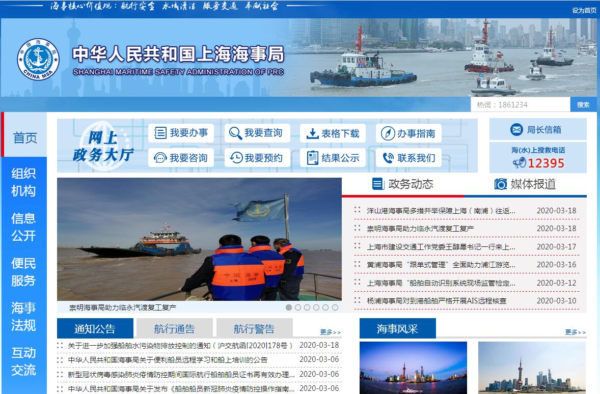 中華人民共和國上海海事局(原交通部上海海上安全監(jiān)督局,1986年5月8日成立)于1999年6 月18日成立,為交通運輸部直屬行政機構(gòu),正廳級。其主要職責(zé)是:(一)貫徹和執(zhí)行國家水上交通安全、航海保障、船舶和水上設(shè) 施檢驗、環(huán)境保護(hù)、海洋管理等方面的法律、法規(guī)和規(guī)章,實施有關(guān)多邊和雙邊國際條約,結(jié)合本轄區(qū)實際情況,制定實施細(xì)則,并監(jiān)督執(zhí)行。(二)管理或負(fù)責(zé)規(guī)定區(qū)域內(nèi)國際航行船舶和國內(nèi)航行船舶的 船舶登記,以及船舶法定配備的操作性手冊與文書審核簽發(fā)工作; 負(fù)責(zé)轄區(qū)內(nèi)外國籍船舶管理工作和審理外國籍船舶(包括港澳地 區(qū)船舶〕進(jìn)入本轄區(qū)未開放水域或港口的申請,并按規(guī)定程序上報 審批;負(fù)責(zé)口岸的海事管理工作。(三)按照授權(quán),負(fù)責(zé)船舶檢驗機構(gòu)、引航機構(gòu)、船員服務(wù)機構(gòu)、 海員外派機構(gòu)和培訓(xùn)機構(gòu)的監(jiān)督管理工作;負(fù)責(zé)轄區(qū)航運公司安 全與防污染監(jiān)督管理工作,以及船舶所有人、經(jīng)營人實施有關(guān)法 律、法規(guī)、國際公約的指導(dǎo)和管理工作。(四)按照授權(quán),負(fù)責(zé)船員、引航員、磁羅經(jīng)校正人員和海上設(shè) 施工作人員適任資格的注冊、培訓(xùn)、考試和發(fā)證管理、船員服務(wù)薄 和海員出入境證件發(fā)放及管理、船員專業(yè)與特殊培訓(xùn)管理及其考 試發(fā)證工作。(五)負(fù)責(zé)轄區(qū)內(nèi)重大水上交通事故、船舶重大污染事故處置 及調(diào)查處理的組織、指揮和協(xié)調(diào)工作;負(fù)責(zé)組織、指導(dǎo)或具體實施 轄區(qū)船舶防臺、水上搜尋救助及水上交通事故、污染事故、水上交 通違法案件的調(diào)查處理工作。(六)管理、指導(dǎo)或具體負(fù)責(zé)轄區(qū)內(nèi)“船旗國”“港口國”和“沿岸 國”管理、船舶安全檢查、國際航線船舶進(jìn)出口岸查驗、國內(nèi)航行船舶進(jìn)出港報告、強制引航監(jiān)督、船舶保安和防抗海盜、船舶載運危 險貨物及其他貨物的安全監(jiān)督、靠泊安全監(jiān)督、防治船舶污染水域 監(jiān)督等工作。(七)管理、指導(dǎo)或具體負(fù)責(zé)轄區(qū)內(nèi)“沿岸國”管理、海區(qū)(或水 域)巡邏、通航環(huán)境管理與通航秩序維護(hù)、水上水下施工作業(yè)審核 及監(jiān)督管理、錨地和重要水域劃定、港區(qū)岸線使用審核、航行警 (通)告發(fā)布等工作。(八)負(fù)責(zé)港口建設(shè)費、船舶油污損害賠償基金等 非稅收入的征收管理工作。(九)按照授權(quán),負(fù)責(zé)監(jiān)督管理或指導(dǎo)規(guī)定區(qū)域內(nèi)的船舶及水 上設(shè)施檢驗工作;負(fù)責(zé)東海轄區(qū)海上巡航執(zhí)法和航海保障的行政 管理和執(zhí)法監(jiān)督工作;負(fù)責(zé)轄區(qū)海事公安工作。(十)負(fù)責(zé)管理、指導(dǎo)本局機關(guān)和所屬分支機構(gòu)的海事業(yè)務(wù)、法制、規(guī)劃計劃、基本建設(shè)、財務(wù)會計、固定資產(chǎn)、規(guī)費征收、干部人事、勞動工資、技術(shù)裝備、科技教育、政務(wù)信息、黨群、審計、紀(jì)檢監(jiān) 察、精神文明建設(shè)、宣傳等工作。(十一)承辦交通運輸部及交通運輸部海事局交辦的其他事項。