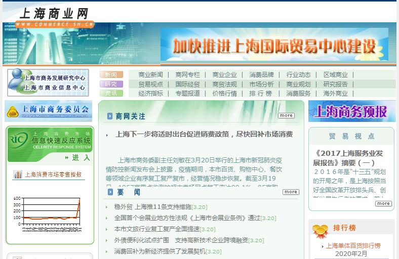 上海商業(yè)網(wǎng)由上海市商務(wù)發(fā)展研究中心、上海市商業(yè)信息中心主辦。上海市商務(wù)發(fā)展研究中心,1992年在原上海市人民政府財(cái)貿(mào)辦公室研究室基礎(chǔ)上成立,是市政府經(jīng)委直屬事業(yè)單位。作為市政府決策咨詢成員單位,“中心”是上海市從事商貿(mào)經(jīng)濟(jì)理論研究、商業(yè)決策咨詢研究、商貿(mào)產(chǎn)業(yè)發(fā)展規(guī)劃、商貿(mào)信息統(tǒng)計(jì)分析、商貿(mào)產(chǎn)業(yè)和消費(fèi)市場數(shù)據(jù)庫建設(shè)等工作的專業(yè)研究機(jī)構(gòu)和信息機(jī)構(gòu)?!爸行摹北局鵀檎?、企業(yè)和社會服務(wù)的宗旨,及時向國家有關(guān)部門和上海市政府提供決策咨詢服務(wù),積極參與上海商業(yè)改革與發(fā)展的一系列重大政策制訂和決策咨詢研究,接受上海市各區(qū)(縣)和外省市政府部門、工商企業(yè)和社會各界委托編制商貿(mào)業(yè)發(fā)展戰(zhàn)略研究和產(chǎn)業(yè)規(guī)劃、重大項(xiàng)目可行性研究,主導(dǎo)建立健全官方多層次信息系統(tǒng)和信息網(wǎng)絡(luò),舉辦各類學(xué)術(shù)活動和行業(yè)交流活動,開展專業(yè)市場調(diào)研,提供信息刊物、咨詢報(bào)告等?!爸行摹蹦壳皳碛?0名專業(yè)人員,云集了一批商業(yè)專家和來自綜合經(jīng)濟(jì)、戰(zhàn)略管理、營銷策劃、商業(yè)統(tǒng)計(jì)、信息技術(shù)等各領(lǐng)域的海內(nèi)外高級人才?!爸行摹睋碛胸S厚的理論研究積淀和實(shí)踐經(jīng)驗(yàn)、全面而及時的消費(fèi)市場和商貿(mào)業(yè)數(shù)據(jù)資源、先進(jìn)的信息系統(tǒng)和分析軟件,形成了一系列獨(dú)到的研究方法、分析技術(shù)和研究成果。