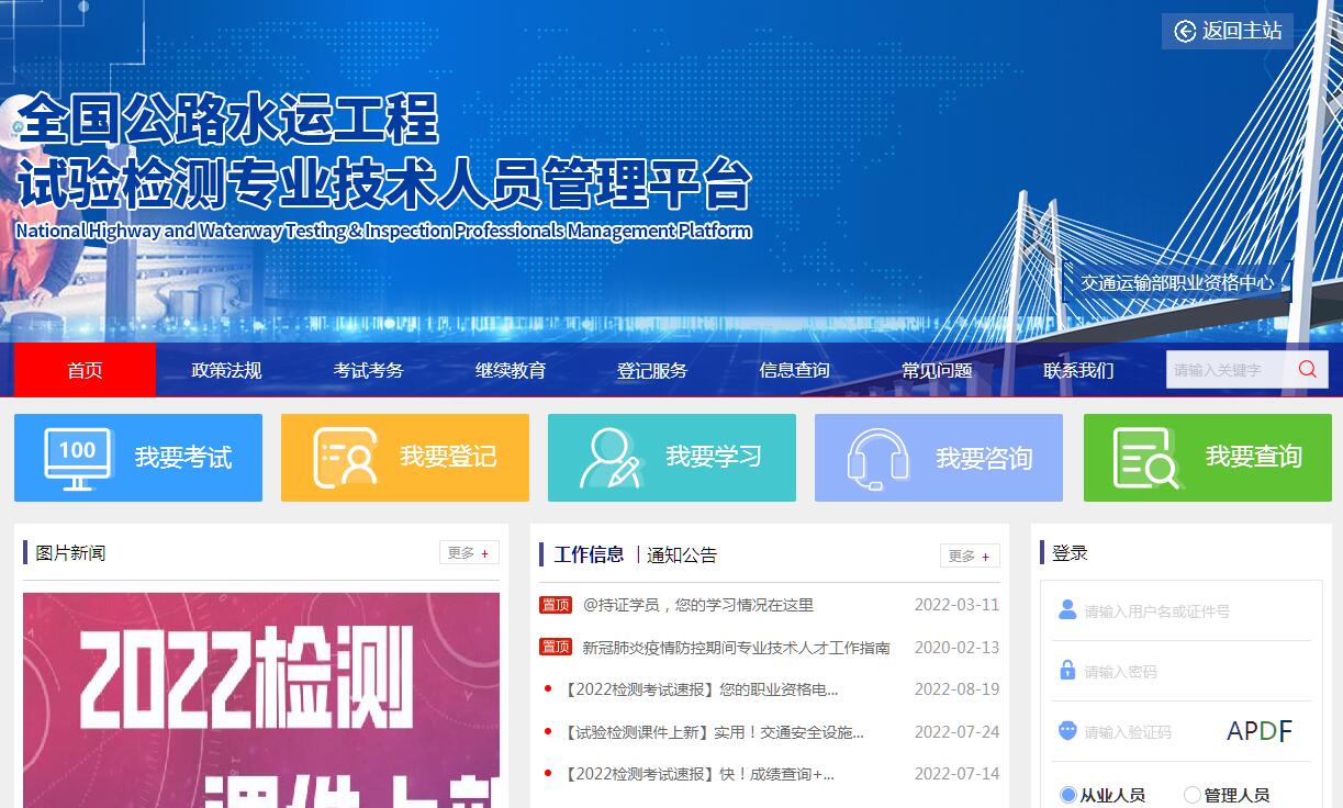 | 網(wǎng)站名稱: | 全國公路水運工程試驗檢測專業(yè)技術(shù)人員管理平臺 | ||