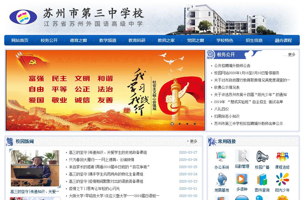 蘇州市第三中學(xué)校創(chuàng)辦于1906年,是一所文化底蘊(yùn)深厚的百年名校,為江蘇省四星級(jí)高中、江蘇省文明單位。孫中山先生為學(xué)校題詞,章太炎、梁?jiǎn)⒊?、蔡元培等曾來學(xué)校講學(xué)。學(xué)校培養(yǎng)了航天專家王禮恒、“骨髓移植之父”陸道培等八位院士和著名教育家于漪、著名作家蘇童等眾多的文化名人。2006年,為表彰學(xué)校科技創(chuàng)新教育的突出成就,國(guó)際小行星命名委員會(huì)將編號(hào)5013小行星命名為“蘇州三中星”。諾貝爾獎(jiǎng)獲得者李政道博士贊譽(yù)蘇州三中:“凝聚姑蘇靈氣,匯成全國(guó)驕傲?!碧K州三中擁有優(yōu)秀的教師群體?,F(xiàn)有170多位專任教師,博士、碩士學(xué)歷(學(xué)位)的教師占40%,特級(jí)教師、名教師、市學(xué)科帶頭人、市優(yōu)秀教育工作者和市德育工作者占50%。他們具有先進(jìn)的教育理念、踏實(shí)的教學(xué)作風(fēng)、精湛的教育藝術(shù)和良好的團(tuán)隊(duì)合作精神,立志成為蘇州市最負(fù)責(zé)的教師群體。蘇州三中教師倡導(dǎo)從容、有容的“蘇式教育”,教育質(zhì)量?jī)?yōu)異,歷屆高三學(xué)生的高考成績(jī)?cè)谔K州市名列前茅。蘇州三中具有豐富的校園生活。學(xué)校建有以多語種為龍頭的五大課程基地,開設(shè)外語、人文、科學(xué)、藝術(shù)、法律等五大類上百門選修課程,并為學(xué)生提供走進(jìn)名企、走上社會(huì)、動(dòng)手實(shí)踐、國(guó)內(nèi)研學(xué)、出國(guó)修學(xué)等多種實(shí)踐和考察學(xué)習(xí)的機(jī)會(huì),大大拓展了學(xué)生的知識(shí)寬度和國(guó)際視野。學(xué)校有廣播社、攝影社、航模社、心理社、魔術(shù)社、話劇社、搖滾社、動(dòng)漫社、義工社、野外運(yùn)動(dòng)社等20多個(gè)學(xué)生社團(tuán),為豐富學(xué)生校園生活、培養(yǎng)學(xué)生領(lǐng)袖才能創(chuàng)造了條件。蘇州三中具有鮮明的辦學(xué)特色。2009年起,學(xué)校先后開設(shè)日語、德語、法語、韓語、西班牙語等語種,2011年學(xué)校增名“江蘇省蘇州外國(guó)語高級(jí)中學(xué)?!?,2014年建有江蘇省高中多語種課程基地。同時(shí),日本的“中日小大使”、德國(guó)的“學(xué)校:塑造未來的伙伴”、加拿大倫敦國(guó)際學(xué)校、美國(guó)南麓私立學(xué)校等一批國(guó)際項(xiàng)目,為學(xué)生搭建多元成才的立交橋。此外,科技創(chuàng)新教育、陽光少年評(píng)選、女子籃球等辦學(xué)特色,也構(gòu)成了校園亮麗的風(fēng)景?!白鲎钬?fù)責(zé)的教育,創(chuàng)最國(guó)際的名校?!边@不僅是蘇州三中最響亮的口號(hào),更是蘇州三中孜孜追求的目標(biāo)。目前,蘇州三中正朝著質(zhì)量?jī)?yōu)異、特色鮮明、省內(nèi)一流、全國(guó)聞名、有國(guó)際影響力的現(xiàn)代化名校邁進(jìn)。