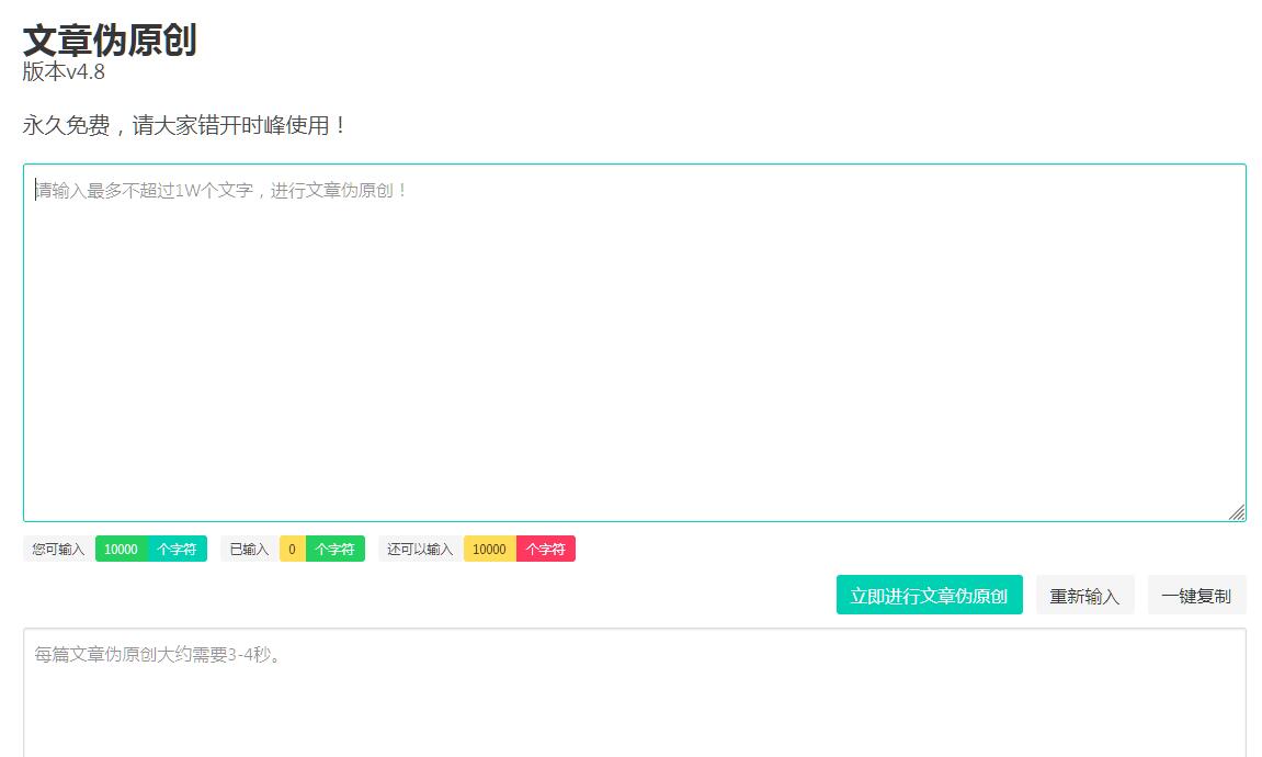 | 網(wǎng)站簡(jiǎn)介: 本站為大家提供免費(fèi)的文章偽原創(chuàng)工具,訪問網(wǎng)頁(yè)直接就可在線生成偽原創(chuàng)文章,不限制次數(shù),1W字以內(nèi),是當(dāng)前行業(yè)內(nèi)比較好用的ai偽原創(chuàng)工具。 |