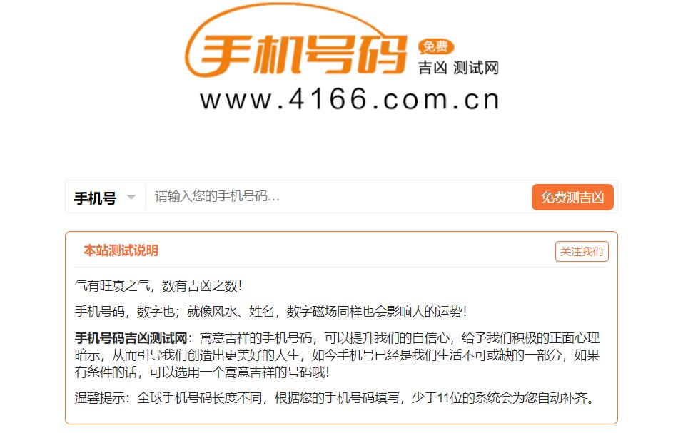 | 網(wǎng)站簡介: 號令天下(www.4166.com.cn)手機(jī)號碼吉兇測試網(wǎng),為您提供:免費(fèi)手機(jī)電話號碼八星排盤、易經(jīng)五行 及 運(yùn)勢分析,手機(jī)號碼測吉兇查詢就上號令天下手機(jī)號碼吉兇測試網(wǎng),超準(zhǔn)! |