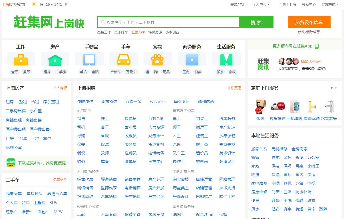 趕集網(wǎng)成立于2005年,是為用戶提供招聘求職、房屋租售、二手買賣、生活服務(wù)等各種分類信息服務(wù)的網(wǎng)站。2015年11月,趕集網(wǎng)與58同城合并,2016年5月8日,58集團(tuán)正式成立,趕集網(wǎng)成為58集團(tuán)子品牌。趕集網(wǎng)在為用戶提供高質(zhì)量生活服務(wù)信息的同時(shí),更會(huì)深入服務(wù)環(huán)節(jié),依托趕集積累的豐厚服務(wù)資源,運(yùn)用創(chuàng)新思維優(yōu)化服務(wù)鏈條,從而推動(dòng)中國(guó)生活服務(wù)O2O的高速發(fā)展。趕集網(wǎng)智能的整合了生活全領(lǐng)域服務(wù)信息,通過PC端及移動(dòng)互聯(lián)網(wǎng)端的全平臺(tái)覆蓋,為用戶提供招聘求職、房屋租售、車輛買賣、二手物品買賣、寵物票務(wù)、教育培訓(xùn)、及本地生活等全方位的生活及商務(wù)服務(wù)類信息,幫助用戶安全便捷的找到所需生活服務(wù)信息,解決生活難題。趕集網(wǎng)總部位于北京,在上海、廣州、深圳、天津設(shè)有分公司,分站遍布全國(guó)近400個(gè)城市。目前,趕集網(wǎng)新增信息量三季度合計(jì)超2億條,APP日活峰值超400萬,作為中國(guó)較早一批起步移動(dòng)化戰(zhàn)略的互聯(lián)網(wǎng)公司,趕集網(wǎng)有近80%的流量來自移動(dòng)互聯(lián)網(wǎng)。