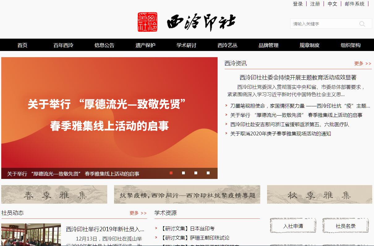 西泠印社創(chuàng)立于清光緒三十年(1904年),是我國現(xiàn)存歷史最悠久的文人社團(tuán),也是海內(nèi)外成立最早的金石篆刻專業(yè)學(xué)術(shù)團(tuán)體。西泠印社社址坐落于浙江省杭州市西湖景區(qū)孤山西麓,南至白堤,西近西泠橋,北鄰里西湖,占地面積7088.86平方米,建筑總面積1749.77平方米,為國家重點(diǎn)文物保護(hù)單位。社址內(nèi)包括多處明清古建筑遺址,園林精雅,景致幽絕,人文景觀薈萃,摩崖題刻隨處可見,有“湖山最勝”之譽(yù)。西泠印社由浙派篆刻家丁仁、王禔、吳隱、葉銘等召集同人發(fā)起創(chuàng)建。1913年,近代藝壇巨擘吳昌碩出任首任社長(zhǎng),盛名之下,天下印人翕然向風(fēng),東瀛名家河井荃廬、長(zhǎng)尾雨山渡海來歸,一時(shí)精英云集,入社者均為精擅篆刻、書畫、鑒藏、考古、文史等之卓然大家。截止2018年5月,西泠印社現(xiàn)有社員約506人,分布于中國境內(nèi)近30個(gè)?。ㄊ校┳灾螀^(qū)、香港、澳門特別行政區(qū)、臺(tái)灣地區(qū)和日本、韓國、新加坡、馬來西亞、法國、捷克、加拿大等國家。創(chuàng)立以來,西泠印社始終以一種現(xiàn)代意義的社團(tuán)組織形式從事古典的藝術(shù)探索,以寬松的運(yùn)作理念主張藝術(shù)的多元性,延續(xù)著創(chuàng)社以來每年春秋兩季雅集、逢五、逢十周年慶典和社員不定期聚會(huì)的社團(tuán)運(yùn)行模式。每年以孤山社址為中心,公祭印學(xué)先賢、舉辦社員作品和藏品展覽、開展學(xué)術(shù)研討和交流等活動(dòng),詩詞吟詠、筆墨酬唱、賞鑒珍藏、品茗清談均無不可,在傳統(tǒng)文化土壤日漸衰微的當(dāng)代文化環(huán)境下,依然生動(dòng)完好地保存著具有傳統(tǒng)文人氣質(zhì)的文化形態(tài)。除金石篆刻與書畫藝術(shù)的創(chuàng)作研習(xí)之外,西泠印社在文物收藏與研究、編輯出版、對(duì)外文化交流等領(lǐng)域均有重要建樹,藉海內(nèi)外社員與各界賢達(dá)之力,對(duì)各類文物遺存博采旁搜,藉資考古,位于孤山西泠橋畔的中國印學(xué)博物館為我國惟一的印學(xué)專業(yè)博物館,西泠印社印學(xué)圖書館則專收一切考論金石、古器、書畫等之書籍,供同人鑒賞研究之用。西泠印社還搜輯、考訂、出版了大量印譜、碑帖與印學(xué)研究著作,刊行海內(nèi)外。西泠印社還著力于篆刻藝術(shù)的傳承、普及與推揚(yáng),自上世紀(jì)80年代以來,連續(xù)舉辦篆刻作品評(píng)展、國際篆刻書法作品展等大型專業(yè)賽事,近年來還舉辦了西泠印社國際藝術(shù)節(jié)、“百年西泠·中國印”、“百年西泠·西湖風(fēng)”、“百年西泠·金石緣”等大型國際性藝術(shù)選拔和創(chuàng)作、展覽、研討活動(dòng),在海內(nèi)外印學(xué)界產(chǎn)生廣泛影響。西泠印社于2004年經(jīng)國家民政部批準(zhǔn)注冊(cè)登記。 2006年,“金石篆刻(西泠印社)”成為首批國家級(jí)非物質(zhì)文化遺產(chǎn)代表作。2009年,由西泠印社領(lǐng)銜申報(bào)的“中國篆刻藝術(shù)”成功入選聯(lián)合國教科文組織 “人類非物質(zhì)文化遺產(chǎn)代表作”,進(jìn)一步確立了西泠印社作為篆刻傳承代表組織和國際印學(xué)中心的地位。時(shí)至今日,西泠印社秉承“保存金石、研究印學(xué),兼及書畫”之宗旨,融詩書畫印于一體,已成為海內(nèi)外研究金石篆刻歷史最悠久、成就最高、影響最廣的藝術(shù)團(tuán)體,在國際印學(xué)界享有崇高地位,有“天下第一名社”之盛譽(yù)。西泠印社社務(wù)委員會(huì)成立于2003年1月,是中共杭州市委直屬相當(dāng)正局級(jí)的事業(yè)單位,歸口中共杭州市委宣傳部管理,為從事公益服務(wù)的事業(yè)單位。西泠印社社務(wù)委員會(huì)主要職責(zé)如下:1、承擔(dān)西泠印社社團(tuán)的日常事務(wù),組織開展學(xué)術(shù)研究、學(xué)術(shù)交流、教育和宣傳活動(dòng),支持和促進(jìn)社團(tuán)的藝術(shù)創(chuàng)作;2、負(fù)責(zé)國家重點(diǎn)文物保護(hù)單位孤山社址、“西泠印社”品牌和西泠印社文物藏品、藝術(shù)資料等的保護(hù)和管理;3、承擔(dān)金石篆刻國家及世界非物質(zhì)文化遺產(chǎn)保護(hù)和傳承的相關(guān)工作;4、承擔(dān)市委、市政府交辦的其他工作西泠印社社務(wù)委員會(huì)設(shè)6個(gè)內(nèi)設(shè)機(jī)構(gòu)(相當(dāng)正處級(jí)),分別為:黨委辦公室(社委會(huì)辦公室)、監(jiān)察室、社團(tuán)事務(wù)處、藝術(shù)創(chuàng)研處、文物管理處、信息處。