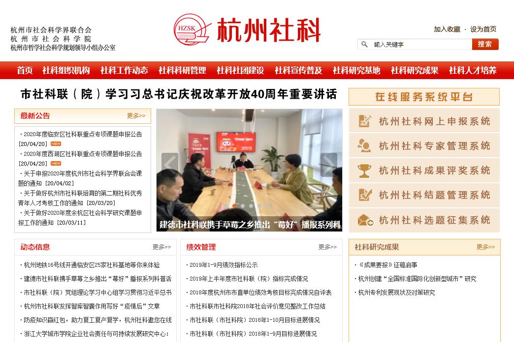 杭州市社會科學(xué)界聯(lián)合會(以下簡稱市社科聯(lián))是在市委領(lǐng)導(dǎo)下的學(xué)術(shù)性群眾團(tuán)體;杭州市社會科學(xué)院(以下簡稱市社科院)是市政府直屬的從事社會科學(xué)研究的綜合性學(xué)術(shù)機(jī)構(gòu)。市社科聯(lián)與市社科院合署辦公,實行“兩塊牌子、一套班子”。其主要職能是:1、研究鄧小平理論和“三個代表”重要思想與中國現(xiàn)代化,研究經(jīng)濟(jì)社會文化發(fā)展中的重大課題。2、組織和推動全市社會科學(xué)知識的普及和社會科學(xué)成果的推廣應(yīng)用等工作;加強(qiáng)與人文社會科學(xué)教學(xué)、科研單位聯(lián)絡(luò),組織社會科學(xué)協(xié)作網(wǎng)絡(luò);參與和組織各種學(xué)術(shù)活動與開展對外學(xué)術(shù)交流。3、向市委、市政府報送學(xué)術(shù)研究和思想理論方面的重要信息,報送重大研究成果、對策性建議;探索和開展社會科學(xué)的咨詢服務(wù)和信息服務(wù),反映社會科學(xué)領(lǐng)域的學(xué)術(shù)活動。4、指導(dǎo)和管理所屬社會科學(xué)類學(xué)術(shù)團(tuán)體的業(yè)務(wù)工作。5、制定全市社會科學(xué)規(guī)劃并組織實施,組織重點課題申報和科研成果鑒定工作;開展社會科學(xué)優(yōu)秀成果評獎和先進(jìn)學(xué)會、先進(jìn)學(xué)會工作者評選。6、承擔(dān)市哲學(xué)社會科學(xué)規(guī)劃領(lǐng)導(dǎo)小組交辦的其他工作。7、承擔(dān)市委、市政府交辦的其他工作。