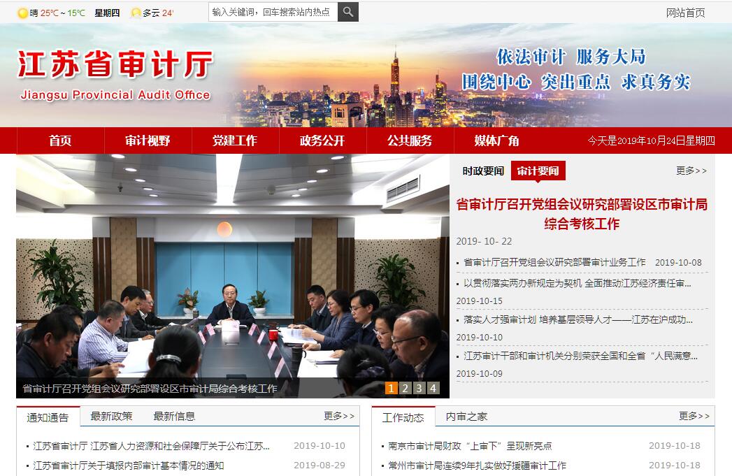 江蘇省審計(jì)廳是省政府組成部門,正廳級(jí)。省委審計(jì)委員會(huì)辦公室設(shè)在省審計(jì)廳,接受省委審計(jì)委員會(huì)的直接領(lǐng)導(dǎo)。江蘇省審計(jì)廳的主要職責(zé)是:(一)主管全省審計(jì)工作。負(fù)責(zé)對(duì)省級(jí)財(cái)政收支和法律法規(guī)規(guī)定屬于審計(jì)監(jiān)督范圍的財(cái)務(wù)收支的真實(shí)、合法和效益進(jìn)行審計(jì)監(jiān)督,對(duì)公共資金、國有資產(chǎn)、國有資源和領(lǐng)導(dǎo)干部履行經(jīng)濟(jì)責(zé)任情況進(jìn)行審計(jì),對(duì)領(lǐng)導(dǎo)干部實(shí)行自然資源資產(chǎn)離任審計(jì),對(duì)國家和省有關(guān)重大政策措施貫徹落實(shí)情況進(jìn)行跟蹤審計(jì)。對(duì)審計(jì)、專項(xiàng)審計(jì)調(diào)查和核查社會(huì)審計(jì)機(jī)構(gòu)相關(guān)審計(jì)報(bào)告的結(jié)果承擔(dān)責(zé)任,并負(fù)有督促被審計(jì)單位整改的責(zé)任。(二)組織起草審計(jì)方面的地方性法規(guī)、規(guī)章草案,擬訂審計(jì)政策,制定審計(jì)指南并監(jiān)督執(zhí)行。制定并組織實(shí)施專業(yè)領(lǐng)域?qū)徲?jì)工作規(guī)劃。參與起草財(cái)政經(jīng)濟(jì)及其相關(guān)地方性法規(guī)、規(guī)章草案。對(duì)直接審計(jì)、調(diào)查和核查的事項(xiàng)依法進(jìn)行審計(jì)評(píng)價(jià),作出審計(jì)決定或提出審計(jì)建議。(三)向省委審計(jì)委員會(huì)提出年度省級(jí)預(yù)算執(zhí)行和其他財(cái)政支出情況審計(jì)報(bào)告。向省長提出年度省級(jí)預(yù)算執(zhí)行和其他財(cái)政收支情況的審計(jì)結(jié)果報(bào)告。受省政府委托向省人大常委會(huì)提出省級(jí)預(yù)算執(zhí)行和其他財(cái)政收支情況的審計(jì)工作報(bào)告、審計(jì)查出問題整改情況報(bào)告。向省委、省政府報(bào)告對(duì)其他事項(xiàng)的審計(jì)和專項(xiàng)審計(jì)調(diào)查情況及結(jié)果。依法向社會(huì)公布審計(jì)結(jié)果。向省委和省政府有關(guān)部門、設(shè)區(qū)市黨委和政府通報(bào)審計(jì)情況和審計(jì)結(jié)果。(四)直接審計(jì)下列事項(xiàng),出具審計(jì)報(bào)告,在法定職權(quán)范圍內(nèi)作出審計(jì)決定,包括省級(jí)有關(guān)重大政策措施貫徹落實(shí)情況;省級(jí)預(yù)算執(zhí)行情況和其他財(cái)政收支,省直各部門(含直屬單位)預(yù)算執(zhí)行情況、決算草案和其他財(cái)政收支;設(shè)區(qū)巿政府預(yù)算執(zhí)行情況、決算草案和其他財(cái)政收支,省級(jí)財(cái)政轉(zhuǎn)移支付資金;使用省級(jí)財(cái)政資金的事業(yè)單位和社會(huì)團(tuán)體的財(cái)務(wù)收支;省級(jí)投資和以省級(jí)投資為主的建設(shè)項(xiàng)目的預(yù)算執(zhí)行情況和決算,省級(jí)重大公共工程項(xiàng)目的資金管理使用和建設(shè)運(yùn)營情況;自然資源管理、污染防治和生態(tài)保護(hù)與修復(fù)情況;省屬國有企業(yè)和金融機(jī)構(gòu)、省政府規(guī)定的省級(jí)國有資本占控股或主導(dǎo)地位的企業(yè)和金融機(jī)構(gòu)境內(nèi)外資產(chǎn)、負(fù)債和損益,省駐外非經(jīng)營性機(jī)構(gòu)的財(cái)務(wù)收支;有關(guān)社會(huì)保障基金、社會(huì)捐贈(zèng)資金和其他基金、資金的財(cái)務(wù)收支;審計(jì)署授權(quán)的國際組織和外國政府援助、貸款項(xiàng)目;法律法規(guī)規(guī)定的其他事項(xiàng)。(五)按規(guī)定對(duì)廳局級(jí)黨政主要領(lǐng)導(dǎo)干部及其他單位主要負(fù)責(zé)人實(shí)施經(jīng)濟(jì)責(zé)任審計(jì)和自然資源資產(chǎn)離任審計(jì)。(六)組織實(shí)施對(duì)國家財(cái)經(jīng)法律法規(guī)、規(guī)章、政策和宏觀調(diào)控措施執(zhí)行情況、財(cái)政預(yù)算管理及國有資產(chǎn)管理使用等與省級(jí)財(cái)政收支有關(guān)的特定事項(xiàng)進(jìn)行專項(xiàng)審計(jì)調(diào)查。(七)依法檢查審計(jì)決定執(zhí)行情況,督促整改審計(jì)查出的問題,依法辦理被審計(jì)單位對(duì)審計(jì)決定提請(qǐng)行政復(fù)議、行政訴訟或省政府裁決中的有關(guān)事項(xiàng)。(八)指導(dǎo)和監(jiān)督內(nèi)部審計(jì)工作,核查社會(huì)審計(jì)機(jī)構(gòu)對(duì)依法屬于審計(jì)監(jiān)督對(duì)象的單位出具的相關(guān)審計(jì)報(bào)告。(九)與設(shè)區(qū)巿黨委政府共同領(lǐng)導(dǎo)設(shè)區(qū)巿審計(jì)機(jī)關(guān)。依法領(lǐng)導(dǎo)和監(jiān)督巿縣審計(jì)機(jī)關(guān)的業(yè)務(wù),組織巿縣審計(jì)機(jī)關(guān)實(shí)施特定項(xiàng)目的專項(xiàng)審計(jì)或?qū)徲?jì)調(diào)查,糾正或責(zé)成糾正市縣審計(jì)機(jī)關(guān)違反國家規(guī)定作出的審計(jì)決定。協(xié)助省級(jí)組織部門管理設(shè)區(qū)巿審計(jì)機(jī)關(guān)負(fù)責(zé)人。(十)指導(dǎo)和推廣信息技術(shù)在全省審計(jì)領(lǐng)域的應(yīng)用。(十一)完成省委、省政府交辦的其他任務(wù)。