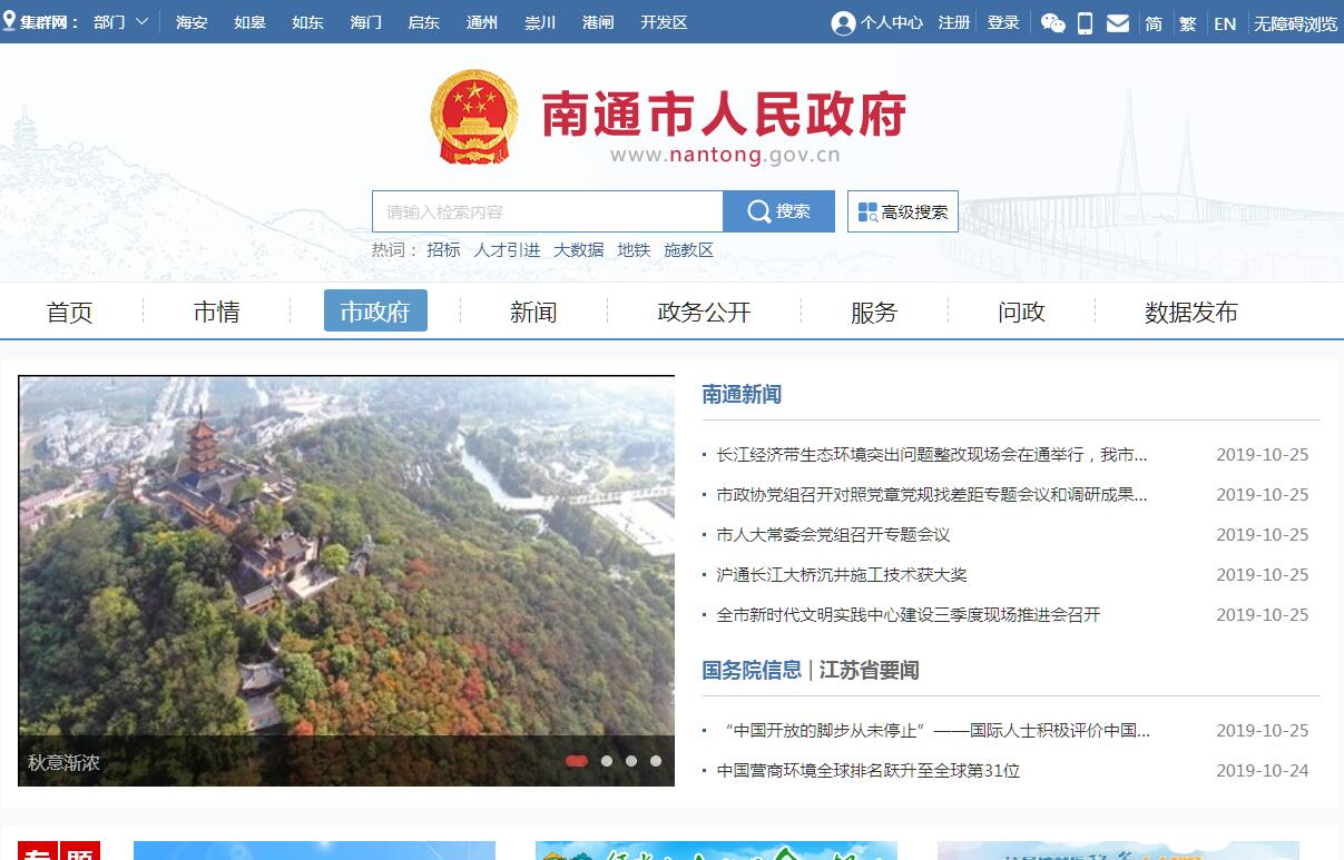 南通,江蘇省地級市,位于江蘇東南部,長江三角洲北翼,簡稱“通”,別稱靜海、崇州、崇川、紫瑯,古稱通州。南通是上海大都市圈北翼門戶城市、中國首批對外開放的14個(gè)沿海城市之一,長三角北翼經(jīng)濟(jì)中心 、現(xiàn)代化港口城市和國家歷史文化名城。東抵黃海,南望長江,與上海、蘇州燈火相邀,西、北與泰州、鹽城接壤,“據(jù)江海之會、扼南北之喉”,被譽(yù)為“北上?!?。南通集“黃金海岸”與“黃金水道”優(yōu)勢于一身,擁有長江岸線226公里,是江蘇長江經(jīng)濟(jì)帶的重要組成部分。因漲沙沖積成洲,南通成陸至今已有5000多年的歷史。自后周顯德三年(956年),南通建城至今已有一千多年歷史。辛亥革命后,改通州為南通縣。1983年,撤銷南通地區(qū),設(shè)立南通市。南通市下轄3區(qū)、1縣,代管4個(gè)縣級市,面積8544平方千米 。在中國近代文化科教史上,南通創(chuàng)辦第一所師范學(xué)校、第一座民間博物苑、第一所紡織學(xué)校、第一所刺繡學(xué)校、第一所戲劇學(xué)校、第一所中國人辦的盲啞學(xué)校和第一所氣象站等“七個(gè)第一”,被稱為“中國近代第一城”。作為中國老齡化最高的城市,南通人口平均壽命達(dá)80.71歲,百歲壽星多達(dá)1031位,2014年5月,南通被國際自然醫(yī)學(xué)會、世界長壽鄉(xiāng)認(rèn)證委員會授予全球首個(gè)“世界長壽之都”。2014年8月,南通成為江蘇省第6個(gè),全國第37個(gè)獲批建設(shè)軌道交通的城市。2017年中國百強(qiáng)城市排行榜中,南通市位列第22位。南通市人民政府網(wǎng)站由南通市人民政府主辦、南通市人民政府辦公室承辦、南通市大數(shù)據(jù)管理局具體建設(shè)管理。南通市人民政府網(wǎng)站是南通市政府面向社會的窗口,是公眾與政府互動的渠道,對于促進(jìn)政務(wù)公開、推進(jìn)依法行政、接受公眾監(jiān)督、改進(jìn)行政管理、全面履行政府職能具有重要意義。南通市人民政府網(wǎng)站是南通市人民政府、市級政府部門、轄市(縣)區(qū)人民政府在國際互聯(lián)網(wǎng)上發(fā)布政府信息和提供在線服務(wù)的綜合平臺,網(wǎng)站第一時(shí)間權(quán)威發(fā)布南通市政務(wù)信息,面向社會提供與政府業(yè)務(wù)相關(guān)的服務(wù),建設(shè)基于互聯(lián)網(wǎng)的政府與公眾互動交流新渠道。南通市人民政府網(wǎng)站于1998年6月開通。歡迎廣大公眾對本網(wǎng)站建設(shè)積極獻(xiàn)計(jì)獻(xiàn)策,提出寶貴意見和建議。