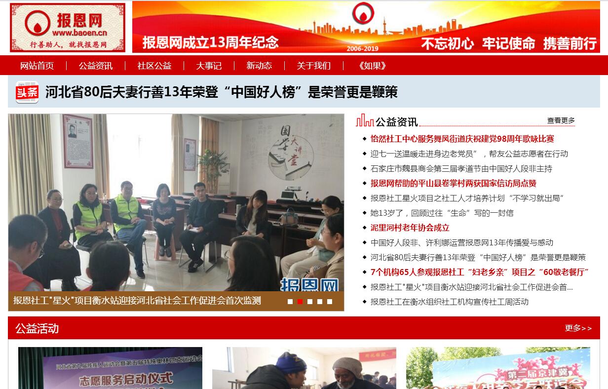 | 網(wǎng)站簡(jiǎn)介: 2006年6月報(bào)恩網(wǎng)公益慈善平臺(tái)誕生。一臺(tái)電腦,一根網(wǎng)線,段非和許利娜兩顆執(zhí)著的心凝聚在一起,架起了這座“愛(ài)的橋梁”,報(bào)恩網(wǎng)立足石家莊,輻射河北,凝聚全國(guó)各地志愿者行善助人!這個(gè)平臺(tái)通過(guò)志愿者走訪孤兒、孤寡老人、貧困殘疾人、寒門(mén)學(xué)子、貧病交加的病人,經(jīng)過(guò)核實(shí)走訪,將貧困信息刊登在報(bào)恩網(wǎng)上,讓更多想奉獻(xiàn)愛(ài)心的人捐款救助他們,幫助寒門(mén)學(xué)子讀書(shū)、幫助病人治病、幫助孤寡老人改善生活等等,總之就是用一顆愛(ài)心感召更多人參與慈善,溫暖弱勢(shì)群體。過(guò)去帶動(dòng)了1500多人行善,幫助了3000多名弱勢(shì)群體,籌集善款470余萬(wàn),幫助過(guò)寒門(mén)學(xué)子讀書(shū)、幫助過(guò)殘疾人安裝假肢、幫助過(guò)盲人老奶奶蓋房子、幫助過(guò)貧困山區(qū)安裝路燈、幫助過(guò)病人籌集善款治病等等,隨緣出現(xiàn)求助的信息就刊登在網(wǎng)上尋找?guī)椭?,?bào)恩網(wǎng)珍惜每一天的時(shí)光努力行善。 |