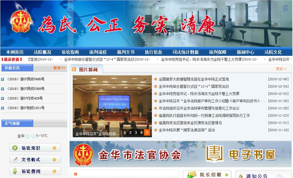 金華古稱婺州,位于浙江省中部,東鄰臺州,南毗麗水,西連衢州,北與杭州、紹興接壤,有著1800多年的歷史和燦爛文化,是一座人文薈萃、教育鼎盛的歷史文化名城;也是山川秀麗,環(huán)境優(yōu)雅的旅游勝地和現(xiàn)代化山水園林城市。歷代名人輩出,有初唐四杰之一的駱賓王、宋代抗金名將宗澤、金元四大名醫(yī)之一朱丹溪、明朝開國文臣之首宋濂、清代戲曲理論家李漁,以及近現(xiàn)代的黃賓虹、邵飄萍、吳晗、艾青、馮雪峰、嚴濟慈等,特別是南宋時期以呂祖謙、陳亮為代表的浙東學派,在中國的哲學和文化史上產(chǎn)生了積極而深遠的影響。金華市中級人民法院現(xiàn)下轄婺城、金東2個區(qū),蘭溪、東陽、義烏、永康4個縣級市和浦江、武義、磐安3個縣共9個基層法院27個人民法庭。全市 27個法庭實現(xiàn)“省級五好法庭”滿堂紅,6個法庭獲得“省級模范五好法庭”稱號。中院現(xiàn)有干警210人,其中碩士研究生31人,本科生149人,共占全院總人數(shù)85.7%。近年來,金華中院認真貫徹落實科學發(fā)展觀和社會主義法治理念,堅持“三個至上”,深入開展“忠誠、為民、公正、廉潔”政法干警核心價值觀教育實踐活動。緊緊圍繞“為大局服務、為人民司法”工作主題,踐行“八項司法”,恪守“為民、公正、務實、清廉”的院訓,依法履行各項法律職能,恪盡職守,艱苦奮斗,開拓創(chuàng)新,努力克服案多人少的矛盾,圓滿完成了各項審判任務,穩(wěn)步推進司法改革、隊伍建設等工作,為我市經(jīng)濟社會和諧發(fā)展做出重要貢獻。2012年,全院共受理各類案件14270件,審結14364件,人均結案數(shù)連續(xù)五年居全省中院第一。因工作成績突出,金華中院先后榮立集體二、三等功,獲省級文明單位稱號,2009~2011年連續(xù)三年在市直機關年終評比中榮記先進單位,2012年被確定為第二批全國司法公開示范法院,被評為全省司法政務工作先進集體,在市機關效能萬人評中名列第4,“三項推進”提名為市重點突破工作,被評為十佳黨政工作創(chuàng)新典范。當前,金華中院蓄勢待發(fā)、追求卓越,在以黨組書記、院長湯海慶為班長的領導班子帶領下,團結一心,銳意進取。近年來,金華法院在立足審判的基礎之上,密切關注社會司法需求,始終堅持能動司法,著力為社會提供優(yōu)質高效的司法保障。2011、2012年相繼開展“三個一百”、“全面工作規(guī)范年”和“三項推進”、“制度執(zhí)行力落實年”活動,收到了良好的社會效果,也積累了一些經(jīng)驗成果。今年法院順勢而為,緊緊圍繞全市經(jīng)濟社會發(fā)展大局和社會司法需求,創(chuàng)新性地提出“三進三促”、“維護公平正義、提升司法公信力”主題實踐活動,繼續(xù)深化能動司法,主動延伸司法服務,提升服務的預見性、主動性、針對性,同時以公正高效實現(xiàn)公信,以親和服務贏取公信,以陽光執(zhí)法促進公信,以提高素質保障公信,真正做到“公信立院”、“公信立庭”、“公信立人”,以優(yōu)質高效權威的司法成果取信于民,惠及于民,實現(xiàn)法官清正、法院清廉、司法清明,力促法院審判執(zhí)行工作更加公正、高效、文明、規(guī)范、廉潔,為推進金華“兩富”現(xiàn)代化都市區(qū)建設營造良好的法治環(huán)境。該活動被列入市人大六屆四次會議決議內(nèi)容,受到上級法院、市委、市政府、人大、政協(xié)、社會各界的充分肯定,為重塑司法公信起了積極作用。金華市中級人民法院將繼續(xù)深入學習貫徹落實黨的十八大精神,堅持服務大局、能動司法,為推動全市經(jīng)濟社會發(fā)展提供有力、高效的司法保障和法律服務?!敖鹑A法院網(wǎng)”開辟有包括法院概況、訴訟指南、審判流程、裁判文書、執(zhí)行信息、司法統(tǒng)計數(shù)據(jù)、審判保障、新聞中心、法院文化等欄目,全面提供金華法院工作的動態(tài)資訊。我們力求通過這個窗口,將金華法院的工作信息暢達于社會,真誠接受您的監(jiān)督并尋求您的支持。我們共同的目標,是實現(xiàn)司法工作的終極理想——公平和正義!金華市中級人民法院將繼續(xù)深入學習貫徹落實黨的十八大精神,堅持服務大局、能動司法,為推動全市經(jīng)濟社會發(fā)展提供有力、高效的司法保障和法律服務?!敖鹑A法院網(wǎng)”開辟有包括法院概況、訴訟指南、審判流程、裁判文書、執(zhí)行信息、司法統(tǒng)計數(shù)據(jù)、審判保障、新聞中心、法院文化等欄目,全面提供金華法院工作的動態(tài)資訊。我們力求通過這個窗口,將金華法院的工作信息暢達于社會,真誠接受您的監(jiān)督并尋求您的支持。我們共同的目標,是實現(xiàn)司法工作的終極理想——公平和正義!期待您們從這里點擊,一如既往地關心、支持、監(jiān)督我們法院各項工作和建設,這是對我們莫大的鼓舞和有力的鞭策,必將推動我們勇往直前,與時俱進,開拓創(chuàng)新,爭創(chuàng)一流工作業(yè)績。同時真誠地歡迎您對法院建設提出寶貴意見和建議,讓我們共同把“金華法院網(wǎng)”建設好、管理好、使用好,全力打造法院與社會交流、融通、互動的資訊平臺。