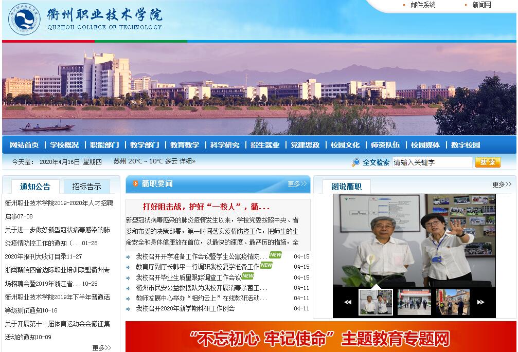 衢州職業(yè)技術(shù)學(xué)院是2002年經(jīng)浙江省人民政府批準(zhǔn)成立的公辦全日制高等職業(yè)院校,主要培養(yǎng)面向生產(chǎn)、建設(shè)、管理、服務(wù)第一線的技術(shù)技能人才。學(xué)校位于浙江省西部、享有“南孔圣地、四省通衢”美譽的國家歷史文化名城衢州市。2012年6月,學(xué)校順利通過教育部高職院校人才培養(yǎng)工作評估。學(xué)校先后被評為國家級節(jié)約型公共機構(gòu)示范單位、浙江省文明單位、浙江省普通高校畢業(yè)生就業(yè)工作優(yōu)秀單位、浙江省治安安全示范單位、浙江省衛(wèi)生先進(jìn)單位。學(xué)校占地面積387畝,建筑面積16萬平方米,固定資產(chǎn)總值達(dá)39937萬元,教學(xué)儀器設(shè)備總值7882余萬元,館藏圖書53萬冊。學(xué)校設(shè)有醫(yī)學(xué)院、藝術(shù)設(shè)計學(xué)院、經(jīng)濟管理學(xué)院、信息工程學(xué)院、機電工程學(xué)院、繼續(xù)教育學(xué)院等6個二級學(xué)院,設(shè)置20個高職專業(yè),形成了裝備制造、電子信息、醫(yī)藥衛(wèi)生、藝術(shù)設(shè)計、財經(jīng)管理等5個專業(yè)群協(xié)調(diào)發(fā)展的格局,光伏工程技術(shù)、藝術(shù)設(shè)計、中央實訓(xùn)基地建設(shè)3個專業(yè)擁有中央財政支持建設(shè),護(hù)理和藝術(shù)設(shè)計2個專業(yè)被列為省高優(yōu)勢專業(yè)建設(shè)項目,助產(chǎn)、計算機應(yīng)用技術(shù)、會計、汽車檢測與維修技術(shù)4個專業(yè)被列為浙江省高?!笆濉碧厣珜I(yè)建設(shè)項目。學(xué)校現(xiàn)有全日制在校學(xué)生6200余人?,F(xiàn)有教職工402人,其中專任教師263人,教授、副教授等高級專業(yè)技術(shù)人員99人,具有碩士及以上學(xué)位(學(xué)歷)教師190人,“雙師素質(zhì)”教師201人,省“151”人才3人、省教學(xué)名師2人、省優(yōu)秀教師2人、省教壇新秀3人、省專業(yè)帶頭人11人、市“115”人才,市首席技師等共42人,形成了一支結(jié)構(gòu)合理、充滿活力的高素質(zhì)專業(yè)化教師隊伍。學(xué)校始終堅持教學(xué)工作中心地位,不斷提高人才培養(yǎng)質(zhì)量?!兑浴靶F蠊渤砷L” 為目標(biāo)的藝術(shù)設(shè)計人才培養(yǎng) 》《計算機應(yīng)用技術(shù)跨專業(yè)復(fù)合型人才培養(yǎng)模式研究與實踐 》獲浙江省教學(xué)成果獎一等獎,教師主持國家社科基金項目1項、教育部人文社科研究規(guī)劃基金項目2項,全國教育科學(xué)十三五規(guī)劃教育部重點研究課題1項,還主持省科技廳、省哲學(xué)社會科學(xué)規(guī)劃課題等省部級項目24項,授權(quán)專利565項;建成省級精品課程5門,省級精品在線開放課程2門,立項省高校新形態(tài)教材建設(shè)項目6項,主編教育部規(guī)劃教材、省級重點教材13部。學(xué)校以“尚德弘毅 知行合一”為校訓(xùn),在人才培養(yǎng)過程中著力體現(xiàn)思想道德、職業(yè)素養(yǎng)、職業(yè)技能和職業(yè)精神的辯證統(tǒng)一。積極推進(jìn)校內(nèi)外生產(chǎn)性實訓(xùn)基地建設(shè),其中機械制造與自動化實訓(xùn)基地為中央財政支持建設(shè)的基地、護(hù)理實訓(xùn)基地為省級示范性實訓(xùn)基地,建有170多個校外實訓(xùn)基地。積極鼓勵學(xué)生參加高水平學(xué)科(技能)競賽,學(xué)生的創(chuàng)新創(chuàng)業(yè)能力不斷提升。2015年以來,學(xué)生在國家級、省級學(xué)科(技能)競賽中獲獎352項,其中一等獎38項。學(xué)校先后確立了地擲球、健美操、攀巖等一批特色體育項目,摘得國家級錦標(biāo)賽類金牌20余枚。近五年,學(xué)生就業(yè)率穩(wěn)中有升,初次就業(yè)率均在95%以上,且就業(yè)層次逐年提高。學(xué)校充分發(fā)揮自身優(yōu)勢主動服務(wù)地方經(jīng)濟社會發(fā)展,近年來組織開展的技術(shù)服務(wù)、社會培訓(xùn)得到社會各屆的高度贊譽。學(xué)校設(shè)有衢州農(nóng)民學(xué)院、衢州女子學(xué)院等社會培訓(xùn)平臺,是浙江省護(hù)理人才培養(yǎng)基地衢州分基地、浙江省家政服務(wù)人才培養(yǎng)培訓(xùn)聯(lián)盟衢州分中心和市養(yǎng)老護(hù)理教育培訓(xùn)中心,先后被評為“全國職工培訓(xùn)示范點”和“全國巾幗家政服務(wù)培訓(xùn)示范基地”,在省內(nèi)外形成廣泛影響。目前,學(xué)校堅持立足衢州、面向市場、服務(wù)區(qū)域經(jīng)濟社會發(fā)展的辦學(xué)定位,以立德樹人、知行合一為導(dǎo)向,以培養(yǎng)具有國際視野、創(chuàng)新精神和實踐能力,富有社會良知和使命感的技術(shù)技能人才為根本任務(wù),努力把學(xué)校辦成辦學(xué)特色鮮明、社會評價優(yōu)良的優(yōu)質(zhì)高職院校。