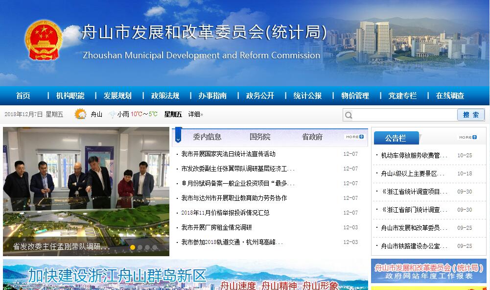 根據(jù)《中共浙江省委辦公廳浙江省人民政府辦公廳印發(fā)〈關(guān)于創(chuàng)新浙江舟山群島新區(qū)行政體制的意見〉的通知》(浙委辦發(fā)〔2013〕57號),設(shè)立舟山市發(fā)展和改革委員會,掛市經(jīng)濟合作與投資促進局、市物價局牌子。市統(tǒng)計局與市發(fā)展和改革委員會合署辦公。市發(fā)展和改革委員會(統(tǒng)計局)是主管新區(qū)(市)國民經(jīng)濟和社會發(fā)展宏觀調(diào)控、指導(dǎo)總體經(jīng)濟體制改革,主管統(tǒng)計、價格工作,指導(dǎo)協(xié)調(diào)招商引資工作的市政府工作部門。其主要職責(zé):(一)研究提出新區(qū)(全市)國民經(jīng)濟和社會發(fā)展戰(zhàn)略、中長期規(guī)劃和年度計劃,負(fù)責(zé)規(guī)劃體制改革,建立健全發(fā)展規(guī)劃體系;負(fù)責(zé)規(guī)劃和計劃的立項、備案、審核、發(fā)布、調(diào)整、評估等綜合管理工作;組織編制、審核、審批區(qū)域發(fā)展規(guī)劃、重點專項規(guī)劃;銜接平衡土地利用總體規(guī)劃、城鄉(xiāng)規(guī)劃等區(qū)域規(guī)劃與專項規(guī)劃之間的關(guān)系;綜合協(xié)調(diào)城市化推進工作。(二)負(fù)責(zé)新區(qū)(全市)社會總需求和總供給等重要經(jīng)濟總量的平衡和重大比例關(guān)系的協(xié)調(diào),提出國民經(jīng)濟發(fā)展和優(yōu)化重大經(jīng)濟結(jié)構(gòu)、實施可持續(xù)發(fā)展戰(zhàn)略的目標(biāo)和政策;引導(dǎo)和促進新區(qū)(全市)經(jīng)濟結(jié)構(gòu)合理化和區(qū)域經(jīng)濟協(xié)調(diào)發(fā)展;組織編制資源合理開發(fā)利用規(guī)劃;牽頭負(fù)責(zé)央企對接工作;承擔(dān)“長三角”地區(qū)合作工作;牽頭負(fù)責(zé)對口援建工作。(三)負(fù)責(zé)宏觀經(jīng)濟的預(yù)測、預(yù)警和信息引導(dǎo),綜合分析新區(qū)(全市)國民經(jīng)濟和社會發(fā)展情況;研究分析財政、金融、價格運行情況,研究提出新區(qū)(全市)運用財政、金融、投資、價格等經(jīng)濟手段進行調(diào)控的政策建議,參與擬訂相關(guān)重大政策,協(xié)調(diào)解決經(jīng)濟運行中的重大問題;負(fù)責(zé)新區(qū)(全市)價格監(jiān)測預(yù)警工作,制定新區(qū)(全市)價格應(yīng)急預(yù)案,并組織實施;研究提出新區(qū)(全市)直接融資的發(fā)展目標(biāo)和政策,負(fù)責(zé)新區(qū)(全市)企業(yè)債券發(fā)行申報和監(jiān)管工作;受市政府委托向市人大提交國民經(jīng)濟和社會發(fā)展計劃的報告。(四)指導(dǎo)推進和綜合協(xié)調(diào)經(jīng)濟體制改革,研究經(jīng)濟體制改革和對外開放的重大問題;提出新區(qū)(全市)經(jīng)濟體制改革的總體規(guī)劃和分階段實施建議;研究擬訂綜合性經(jīng)濟體制改革方案,協(xié)調(diào)有關(guān)專項經(jīng)濟體制改革方案,研究擬訂投資、規(guī)劃、計劃、價格、電力等改革方案并組織實施;指導(dǎo)經(jīng)濟體制改革試點。(五)研究提出全社會固定資產(chǎn)投資總規(guī)模,制定投資和建設(shè)領(lǐng)域的重大政策措施,負(fù)責(zé)規(guī)劃重大項目布局;按權(quán)限負(fù)責(zé)新區(qū)(全市)固定資產(chǎn)投資的綜合管理;提出新區(qū)(全市)財政性建設(shè)資金的規(guī)模和投向,并納入政府投資項目計劃管理;協(xié)調(diào)引導(dǎo)其他投資資金的投向;負(fù)責(zé)重大投資項目及市直單位的基本建設(shè)項目的審批、核準(zhǔn)、審核上報;會同有關(guān)部門負(fù)責(zé)國有基礎(chǔ)設(shè)施資產(chǎn)權(quán)益轉(zhuǎn)讓項目的管理;承擔(dān)政府投資項目的前期儲備、計劃編制、組織實施、協(xié)調(diào)監(jiān)督等綜合管理工作;加強和改進對各類民間投資的宏觀調(diào)控。(六)負(fù)責(zé)新區(qū)(全市)基本建設(shè)和重點(實事)項目的綜合管理;編制新區(qū)(市)重點(實事)建設(shè)項目計劃并組織實施;組織重大建設(shè)項目社會穩(wěn)定風(fēng)險評估審查;負(fù)責(zé)政府投資項目代建制的協(xié)調(diào)管理;負(fù)責(zé)協(xié)調(diào)和管理基本建設(shè)重大項目的前期工作;組織開展新區(qū)(全市)重大項目稽察工作;負(fù)責(zé)政府投資項目及新區(qū)(市)重點建設(shè)項目的竣工驗收;負(fù)責(zé)工程咨詢業(yè)的管理。(七)牽頭研究提出海洋經(jīng)濟發(fā)展戰(zhàn)略、規(guī)劃和政策措施,研究提出海島開發(fā)開放的政策建議;負(fù)責(zé)協(xié)調(diào)海洋經(jīng)濟發(fā)展中的重大問題,綜合協(xié)調(diào)產(chǎn)業(yè)集聚區(qū)規(guī)劃建設(shè);指導(dǎo)協(xié)調(diào)海洋產(chǎn)業(yè)發(fā)展和海洋資源開發(fā),組織協(xié)調(diào)涉海有關(guān)規(guī)劃項目。(八)研究提出新區(qū)(全市)產(chǎn)業(yè)發(fā)展戰(zhàn)略,組織擬訂綜合性產(chǎn)業(yè)政策,并負(fù)責(zé)協(xié)調(diào)產(chǎn)業(yè)發(fā)展重大問題;負(fù)責(zé)新區(qū)(全市)戰(zhàn)略性新興產(chǎn)業(yè)規(guī)劃編制、計劃制定、專項實施和目標(biāo)考核;組織編制高技術(shù)產(chǎn)業(yè)發(fā)展規(guī)劃,推進重大科技成果產(chǎn)業(yè)化;研究提出新區(qū)(全市)重大工業(yè)和高技術(shù)產(chǎn)業(yè)項目并組織實施;負(fù)責(zé)新區(qū)(全市)各類開發(fā)區(qū)(園區(qū))、重大產(chǎn)業(yè)基地發(fā)展規(guī)劃和綜合平衡工
