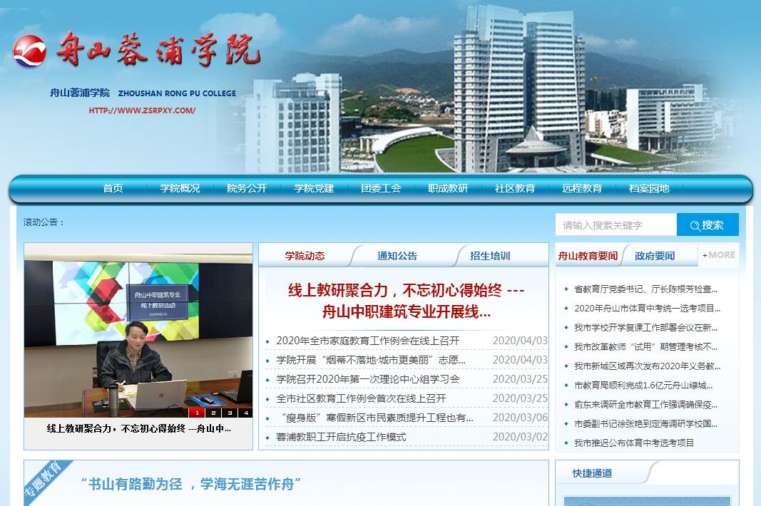 舟山蓉浦學(xué)院成立于2001年6月,由原舟山師范學(xué)校和舟山市成人教育中心合并組建而成。2010年10月,與舟山廣播電視大學(xué)合署辦學(xué)。2017年1月再一次獨立辦學(xué)。舟山蓉浦學(xué)院,源于“蓉浦書院”。清康熙年間,江蘇江陰人繆遂知定海縣事凡二十年,在任期間,筑海塘、興教育、修水利、平海盜,功績卓著,獲全國郡縣考績一等。上任初,繆遂自捐俸銀創(chuàng)辦“蓉浦義學(xué)”,招收平民子弟入學(xué)。定海生員黃灝等感念繆公恩德,為其建生祠,祠成不入,改為“文昌書院”??娝烊ナ篮?,“蓉浦義學(xué)”和“文昌書院”合并,以繆遂的號“蓉浦”命名,史稱“蓉浦書院”。學(xué)院以蓉浦命名,既是為弘揚先賢興學(xué)之美德,也是為我市海洋歷史文化名城添一抹亮色。目前,舟山蓉浦學(xué)院是全市唯一一所從事職成教教研、社區(qū)教育和成人教育工作的公益一類全額撥款事業(yè)單位。學(xué)院現(xiàn)有編制42名,50%以上有高級職稱,內(nèi)設(shè)機構(gòu)4個,分別是辦公室、職成教教研科、社區(qū)教育科、遠程教育科。舟山社區(qū)大學(xué)、舟山市家長學(xué)校總校、舟山市家庭教育指導(dǎo)中心、舟山漁農(nóng)民學(xué)院、舟山老年開放大學(xué)同學(xué)院合署辦公。另外,舟山市家庭教育學(xué)會秘書處、舟山市成職教協(xié)會社區(qū)教育研究會、國家計算機等級考試舟山中心考點等也設(shè)在本院。根據(jù)新區(qū)建設(shè)和教育發(fā)展的實際需要,學(xué)院將事業(yè)發(fā)展定位確定為“兩個中心、兩個基地”,即 “全市職成教教研與教師培訓(xùn)中心”“全市社區(qū)教育研究和指導(dǎo)中心”“市本級社區(qū)教育主要基地”“全市成人教育的示范基地”。學(xué)院立足舟山新區(qū)開發(fā)開放的時代需要和新區(qū)市民精神文化的更高追求,團結(jié)全體教職工,發(fā)揚大干實干和敬業(yè)奉獻精神,力爭在全市營造出更濃厚的全民終身學(xué)習(xí)氛圍。