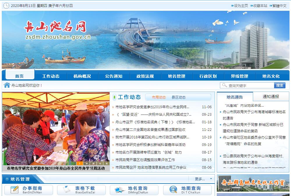 "舟山地名網(wǎng)"是舟山市民政局地名辦對外統(tǒng)一發(fā)布各類信息、提供國內(nèi)外人士在網(wǎng)上辦理有關(guān)事務(wù)的門戶網(wǎng)站,是展示舟山整體形象的窗口,也是舟山市民政局地名辦聯(lián)系群眾、服務(wù)群眾的一座橋梁。門戶網(wǎng)站是一個體系龐大的網(wǎng)站群:包涵著市政府及其50多個所屬部門的綜合信息。主網(wǎng)站設(shè)有6個一級欄目和近200個子欄目,并與50多個市政府委、辦、局子網(wǎng)站和各縣(區(qū))政府網(wǎng)站建立了有效的信息共享機制和復(fù)式鏈接。門戶網(wǎng)站建設(shè)以應(yīng)用為導(dǎo)向,以便民為目的,訪問者可在門戶網(wǎng)站上便捷地查閱信息:工作動態(tài)、機構(gòu)概況、公告通知、政策法規(guī)、地名管理、行政區(qū)劃、界線管理、地名文化等服務(wù)類信息。門戶網(wǎng)站互動功能強大。主任信箱、建議提案、網(wǎng)上投訴、等欄目,構(gòu)筑起市民與政府交流的平臺,為訪問者提供了更大的便利。歡迎登陸"舟山地名網(wǎng)"門戶網(wǎng)站!舟山市民政局地名辦主要職能:宣傳貫徹行政區(qū)劃、界線、地名管理的政策法規(guī);提出全市行政區(qū)劃總體規(guī)劃;承辦鄉(xiāng)鎮(zhèn)(街道)行政區(qū)域的設(shè)立、撤銷、命名、變更和政府駐地遷移及界線變更的審核報批工作;組織和指導(dǎo)行政區(qū)域界線勘定及日常管理工作;指導(dǎo)行政區(qū)域邊界爭議的調(diào)查和調(diào)處工作;編制、實施全市地名規(guī)劃;負責(zé)審批由市直接管理的地名命名、更名、銷名工作,承辦由同級人民政府或上級民政部門審批的地名命名和更名事項的預(yù)審工作;負責(zé)公布、推廣和監(jiān)督標(biāo)準(zhǔn)地名,開展地名信息公共服務(wù),推進全市地名標(biāo)準(zhǔn)化建設(shè);負責(zé)收集、整理地名資料,管理地名檔案;保護和傳承優(yōu)秀地名文化,組織編纂標(biāo)準(zhǔn)地名志、錄、圖、書,開展地名學(xué)術(shù)研究;負責(zé)門(樓)牌、路名牌等地名標(biāo)志的設(shè)置與監(jiān)督管理;查處地名違法違規(guī)等行為;指導(dǎo)有關(guān)部門、下級人民政府及其派出機構(gòu)的地名管理工作;承擔(dān)市地名委員會辦公室日常工作。