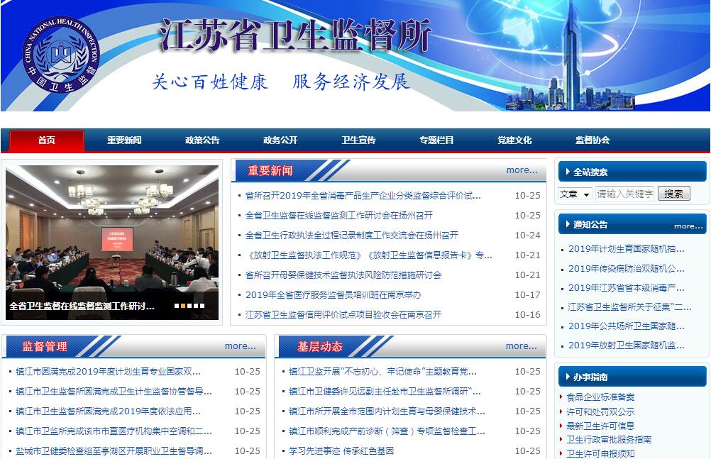 江蘇省衛(wèi)生監(jiān)督所組建于2000年10月,前身為省衛(wèi)生防疫站,是省衛(wèi)生計生委下屬正處級參公管理事業(yè)單位,編制135人,21個處室?,F(xiàn)設辦公室、黨委辦公室、人事處、財務處、稽查處、許可受理處、綜合業(yè)務處(學校衛(wèi)生監(jiān)督處)、信息處、監(jiān)督一處、監(jiān)督二處、監(jiān)督三處、監(jiān)督四處、監(jiān)督五處(計劃生育和母嬰保健監(jiān)督處)等15個處室。具體履行食品安全標準管理、飲用水衛(wèi)生、涉水產(chǎn)品與消毒產(chǎn)品、傳染病防治、公共場所衛(wèi)生、放射衛(wèi)生、職業(yè)衛(wèi)生、醫(yī)療服務、學校衛(wèi)生監(jiān)督、計劃生育和母嬰保健監(jiān)督等行政執(zhí)法職責。江蘇省衛(wèi)生監(jiān)督所貫徹“依法治國,建設社會主義法制國家”方略,依法行政,加大衛(wèi)生監(jiān)督執(zhí)法力度,保障人民群眾的健康權益,促進經(jīng)濟和社會可持續(xù)發(fā)展,以醫(yī)藥衛(wèi)生體制改革為契機,抓住機遇,開拓進取,單位的三個文明建設取得了明顯進步,一直保持“江蘇省文明單位”和“江蘇省精神文明建設工作先進單位”的榮譽稱號,2008年被全國總工會和江蘇省總工會授予了“工人先鋒號”稱號和“江蘇省五一勞動獎狀”,先后多次被衛(wèi)生部授予“全國衛(wèi)生監(jiān)督先進集體”,在歷年各次專項整治、重大突發(fā)事件應急處置和重大活動衛(wèi)生保障中做出了突出貢獻,多次受到國家及省通報表彰或授予榮譽稱號,得到了上級部門的充分肯定,先后獲得“全省衛(wèi)生系統(tǒng)抗非先進集體”、“全省衛(wèi)生系統(tǒng)抗震救災先進集體”、“十運會保障服務貢獻獎”、“全省集貿(mào)市場專項整治工作先進集體”、“全省衛(wèi)生系統(tǒng)法制宣傳教育先進單位”、“省級機關‘六五’普法中期先進單位”、“南京青奧會醫(yī)療衛(wèi)生保障工作表現(xiàn)突出單位”等30多項榮譽稱號。