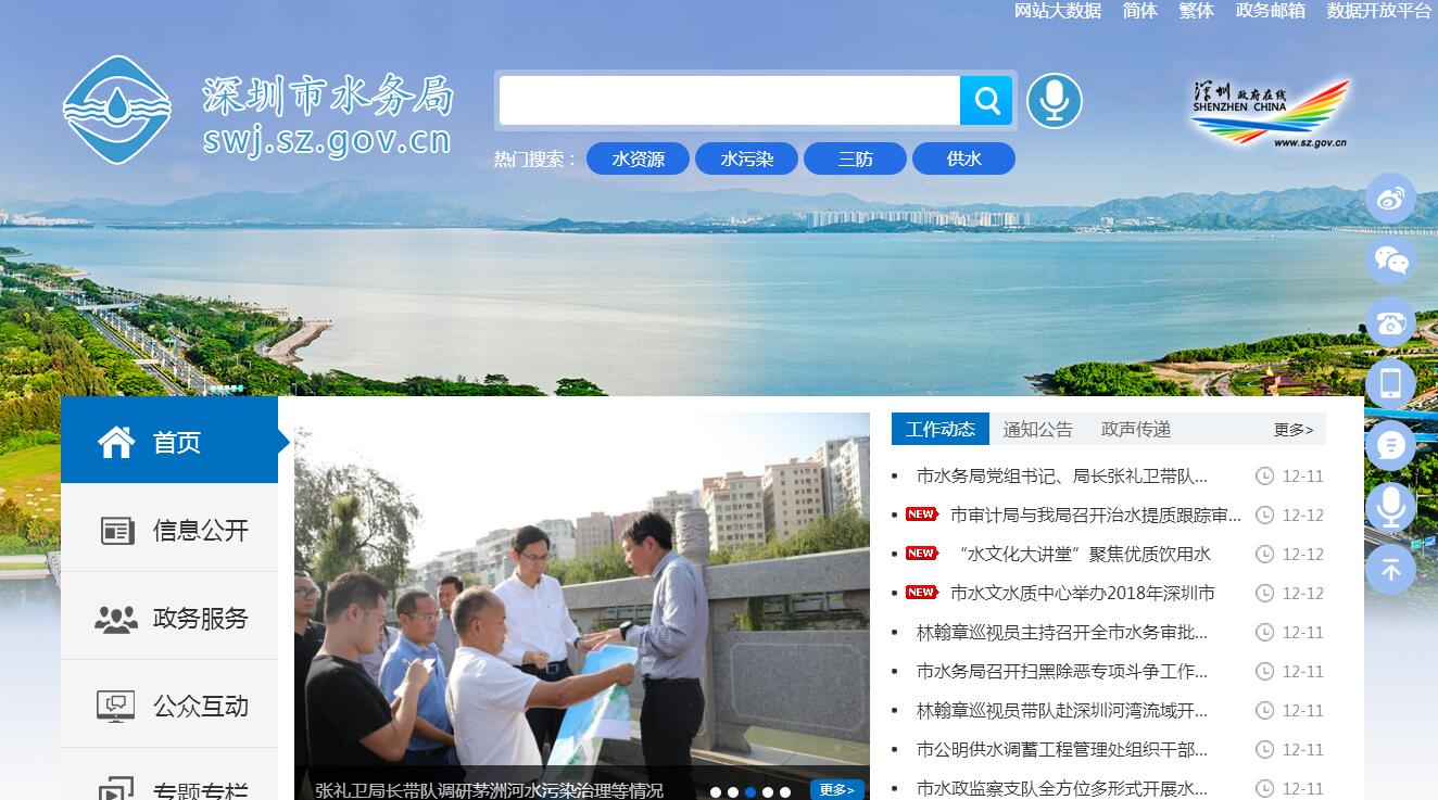 根據(jù)《中共深圳市委 深圳市人民政府關(guān)于印發(fā)〈深圳市人民政府機(jī)構(gòu)改革方案〉的通知》(深發(fā)〔2009〕9號),設(shè)立深圳市水務(wù)局(簡稱市水務(wù)局),為市政府工作部門,由市人居環(huán)境委歸口聯(lián)系。主要職責(zé)如下:(一)貫徹執(zhí)行國家、省、市有關(guān)水行政工作的法律、法規(guī)、規(guī)章和政策;起草有關(guān)法規(guī)、規(guī)章,擬訂相關(guān)政策,經(jīng)批準(zhǔn)后組織實施。(二)擬訂水務(wù)發(fā)展規(guī)劃及水資源、防洪排澇、農(nóng)田水利、供水、排水、節(jié)水、水土保持、污水處理及回用、中水利用、海水利用等專業(yè)規(guī)劃,經(jīng)批準(zhǔn)后組織實施。(三)承擔(dān)生活、生產(chǎn)經(jīng)營和生態(tài)環(huán)境用水保障責(zé)任。實施水資源的統(tǒng)一監(jiān)督管理;根據(jù)全省水資源分配方案,做好跨境水資源規(guī)劃銜接工作;發(fā)布全市水資源公報。(四)負(fù)責(zé)水資源保護(hù)工作。組織水功能區(qū)的劃分,并監(jiān)督實施;監(jiān)測河道、水庫的水量,檢測其水質(zhì),核定其水域納污能力,提出限制排污總量的意見,并協(xié)助做好水源保護(hù)工作。(五)參與全市水污染治理和水環(huán)境保護(hù)政策、規(guī)劃的擬訂工作,承擔(dān)水污染治理工程和水環(huán)境保護(hù)工程的建設(shè)管理和運行監(jiān)管責(zé)任。(六)承擔(dān)城市供水水質(zhì)安全責(zé)任。負(fù)責(zé)水務(wù)企業(yè)的行業(yè)管理,負(fù)責(zé)水務(wù)行業(yè)的特許經(jīng)營管理;負(fù)責(zé)管道直飲水的管理以及原水、供水水質(zhì)日常檢測和管理工作。(七)承擔(dān)水務(wù)工程的建設(shè)管理及其質(zhì)量和安全的監(jiān)督管理責(zé)任;負(fù)責(zé)河道工程修建維護(hù)費的征收管理工作;負(fù)責(zé)政府投資水務(wù)固定資產(chǎn)的監(jiān)管及水務(wù)發(fā)展專項資金的業(yè)務(wù)管理工作。(八)按照分級管理原則,負(fù)責(zé)全市水庫、河道、堤防、河口灘涂、滯洪區(qū)及其他水務(wù)設(shè)施的監(jiān)督管理;負(fù)責(zé)全市大、中、小型水庫、河道、滯洪區(qū)及其他水工程設(shè)施的防洪防風(fēng)安全;負(fù)責(zé)水工程范圍內(nèi)建設(shè)項目審批。(九)負(fù)責(zé)防治水土流失。組織協(xié)調(diào)水土流失的綜合防治、監(jiān)測預(yù)報并定期公告;負(fù)責(zé)審批并監(jiān)督實施建設(shè)項目水土保持方案。(十)負(fù)責(zé)節(jié)約用水工作。擬訂節(jié)約用水政策及有關(guān)標(biāo)準(zhǔn),指導(dǎo)和推動節(jié)水型城市建設(shè)工作。(十一)承擔(dān)全市排水設(shè)施(含污水處理設(shè)施)的建設(shè)管理責(zé)任。負(fù)責(zé)對全市排水運營單位監(jiān)督考核;負(fù)責(zé)污水處理費的征收管理工作;制定運營服務(wù)費的支付標(biāo)準(zhǔn)。(十二)負(fù)責(zé)水政監(jiān)察和水行政執(zhí)法,調(diào)解水事糾紛。(十三)承辦市政府和上級部門交辦的其他事項。