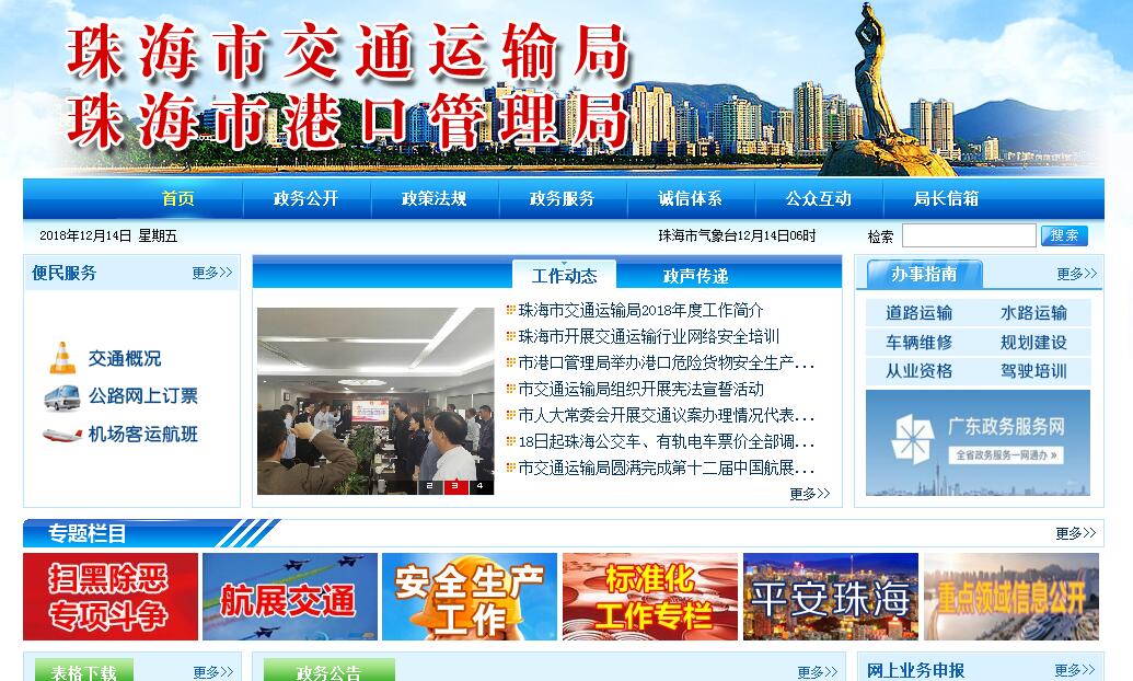 珠海市交通運輸局主要職責(zé):(一)貫徹執(zhí)行國家、省、市有關(guān)交通運輸行業(yè)的方針政策和法律法規(guī),起草交通運輸行業(yè)的地方性法規(guī)、規(guī)章,擬訂有關(guān)政策措施,經(jīng)批準后組織實施。(二)負責(zé)擬訂全市交通運輸發(fā)展戰(zhàn)略和行業(yè)發(fā)展規(guī)劃;組織編制城鄉(xiāng)綜合交通運輸體系規(guī)劃和交通運輸專項規(guī)劃、港口總體規(guī)劃及港區(qū)、作業(yè)區(qū)控制性詳細規(guī)劃,經(jīng)批準后組織實施;參與制定與交通運輸行業(yè)相關(guān)的經(jīng)濟政策和調(diào)控措施;參與擬訂物流業(yè)發(fā)展戰(zhàn)略和規(guī)劃;參與大型公共基礎(chǔ)設(shè)施交通影響評價;承擔(dān)交通基礎(chǔ)設(shè)施建設(shè)項目的前期工作、后期評價工作及有關(guān)規(guī)劃、收費公路立項的申請報批工作。(三)負責(zé)本市行政區(qū)域范圍內(nèi)交通運輸行業(yè)管理,包括城市公共汽車、出租汽車、軌道交通(含地方鐵路)、道路運輸、水路運輸、港口的行業(yè)管理,以及本市事權(quán)內(nèi)的航空運輸、鐵路運輸?shù)男袠I(yè)監(jiān)督管理工作。(四)承擔(dān)道路運輸、水路運輸市場監(jiān)管責(zé)任;組織制定道路、水路運輸有關(guān)政策措施和運營規(guī)范并監(jiān)督實施;指導(dǎo)城鄉(xiāng)客運及有關(guān)設(shè)施規(guī)劃和管理工作;負責(zé)全市公共交通運力投放,協(xié)調(diào)軌道交通運力投放、線網(wǎng)布局和站場管理工作;負責(zé)對城市公共汽車、出租汽車、軌道交通(含地方鐵路)、道路運輸、水路運輸?shù)姆?wù)質(zhì)量和經(jīng)營行為實施監(jiān)督管理。負責(zé)協(xié)調(diào)民航業(yè)法規(guī)、規(guī)章的貫徹實施;負責(zé)制定地方民航業(yè)發(fā)展規(guī)劃;負責(zé)全市民航業(yè)的統(tǒng)籌協(xié)調(diào)與監(jiān)督工作;組織制定航空運輸業(yè)發(fā)展政策并監(jiān)督實施。(五)負責(zé)交通專項資金、交通規(guī)費管理工作;負責(zé)交通運輸行業(yè)上級和本級政府政策性補貼資金、獎勵資金的審核、撥付和使用的監(jiān)督管理;負責(zé)部門預(yù)算編制和內(nèi)部審計等相關(guān)管理工作;負責(zé)交通運輸行業(yè)財政非稅票據(jù)的管理和監(jiān)督使用。(六)負責(zé)交通工程質(zhì)量技術(shù)管理工作;組織審查交通基礎(chǔ)設(shè)施建設(shè)工程項目和技改項目的可行性;參與交通科研項目的鑒定和重要研究成果的推廣應(yīng)用;研究解決交通工程設(shè)計和施工中的工程技術(shù)問題、工程質(zhì)量事故問題,組織審定關(guān)鍵性的工程技術(shù)措施。(七)承擔(dān)交通建設(shè)市場監(jiān)督管理責(zé)任,組織協(xié)調(diào)交通運輸工程建設(shè)、施工許可和工程質(zhì)量、工程造價及安全監(jiān)督工作,指導(dǎo)交通運輸基礎(chǔ)設(shè)施管理和維護工作。(八)負責(zé)指導(dǎo)交通運輸行業(yè)應(yīng)急管理工作,負責(zé)組織協(xié)調(diào)國家重點物資、緊急物資、特種物資以及軍事、搶險救災(zāi)物資的運輸工作;負責(zé)交通運輸應(yīng)急指揮、應(yīng)急處置;負責(zé)國防交通戰(zhàn)備的組織、協(xié)調(diào)管理,參與國防交通保障設(shè)施規(guī)劃建設(shè)工作。(九)制定交通科技政策和交通信息化發(fā)展規(guī)劃;組織重大交通科技項目攻關(guān);承擔(dān)交通信息化項目的規(guī)劃建設(shè)、推廣應(yīng)用和監(jiān)督管理;指導(dǎo)、監(jiān)督交通運輸行業(yè)技術(shù)標準和規(guī)范的實施;指導(dǎo)交通運輸行業(yè)環(huán)境保護和節(jié)能減排工作;組織開展交通運輸對外交流與合作工作。(十)負責(zé)協(xié)調(diào)交通運輸行業(yè)安全生產(chǎn)工作;參與交通運輸行業(yè)安全生產(chǎn)事故的調(diào)查處理工作;負責(zé)交通運輸行業(yè)統(tǒng)計工作。(十一)負責(zé)汽車、摩托車維修業(yè)開業(yè)、變更業(yè)務(wù)的核準和經(jīng)營資質(zhì)管理;監(jiān)督管理營運車輛技術(shù)等級評定、二級維護和綜合性能檢測。(十二)負責(zé)機動車駕駛培訓(xùn)機構(gòu)的核準及駕駛員培訓(xùn)的監(jiān)督管理;負責(zé)交通運輸行業(yè)職業(yè)培訓(xùn)工作。(十三)負責(zé)行政檢查、行政處罰、行政強制等交通運輸綜合行政執(zhí)法工作;指導(dǎo)交通運輸行業(yè)依法行政和普法教育工作;負責(zé)公路“三亂”的治理工作。(十四)指導(dǎo)公路養(yǎng)護和農(nóng)村公路建設(shè)、管理工作。(十五)承辦市人民政府和上級主管部門交辦的其他事項。