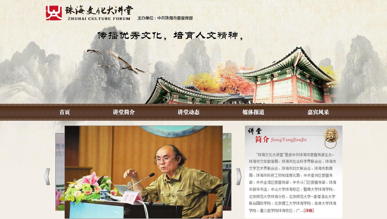 “珠海文化大講堂”是由中共珠海市委宣傳部主辦,珠海市文體旅游局、珠海市社會科學界聯合會、珠海市文學藝術界聯合會、珠海市婦女聯合會、珠海市教育局、珠海市科技工貿和信息化局、中共香洲區(qū)委宣傳部、中共金灣區(qū)委宣傳部、中共斗門區(qū)委宣傳部、珠海市新華書店、中山大學珠海校區(qū)、暨南大學珠海學院、北京師范大學珠海分校、北京師范大學─香港浸會大學聯合國際學院、北京理工大學珠海學院、吉林大學珠海學院、遵義醫(yī)學院珠海校區(qū)、廣東科學技術職業(yè)學院、珠海城市職業(yè)學院協(xié)辦,由珠海格力電器股份有限公司、珠海特區(qū)報社、珠海廣播電視臺、珠海市圖書館承辦的大型公益性文化活動。創(chuàng)辦“珠海文化大講堂”是順應時代潮流之舉,也是珠海建設實踐科學發(fā)展觀先行示范市,構建和諧珠海、文化珠海,提升城市品位,豐富城市人文底蘊,打造城市新的“文化名片”的迫切需求?!爸楹N幕笾v堂”以“求知·鑒賞·交流·分享”為主題,以“傳播優(yōu)秀文化,培育人文精神,共享文明成果,提升城市品位”為宗旨,內容擬設八大板塊:中國傳統(tǒng)文化系列、當代中國國情系列、外國文化風情系列、珠海歷史文化系列、科技教育系列、養(yǎng)生保健文化系列、藝術鑒賞系列、城市人文精神建設系列,涵蓋政治、經濟、文化、生活保健等多個領域,我們每期將挑選市民所喜歡、關心的熱點話題開講。周六下午三點至五點半,市民前往主會場即可與文化名人、學者、大師零距離對話、交流與切磋,共享精神盛宴。主會場設在珠海市圖書館甲棟一樓多功能報告廳。