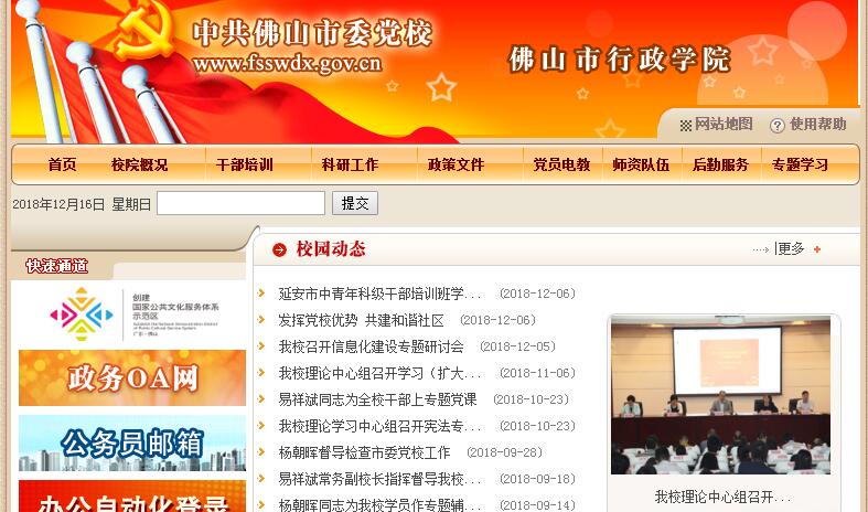 2003年12月,佛山市委、市政府決定整合全市九所干部培訓(xùn)機(jī)構(gòu)(佛山市委黨校及禪城、南海、順德、高明、三水五區(qū)區(qū)委黨校、市政府系統(tǒng)干部培訓(xùn)中心、市經(jīng)濟(jì)管理干部培訓(xùn)中心、市農(nóng)業(yè)干部學(xué)校),組建新的佛山市委黨校,同時掛佛山市行政學(xué)院、佛山市社會主義學(xué)院和佛山市經(jīng)濟(jì)管理干部學(xué)院牌子,實(shí)行四位一體的辦學(xué)體制,主要承擔(dān)全市處級及以下黨政干部、民主黨派骨干、專業(yè)技術(shù)人員、經(jīng)濟(jì)管理干部、農(nóng)村基層干部的培訓(xùn)任務(wù)。2004年1月16日,組合后的市委黨校正式掛牌。4月1日起,校址遷至順德區(qū)大良街道銀峰路現(xiàn)址辦學(xué)。黨校本部校園面積約55000平方米,建筑面積61843.43平方米,擁有大禮堂(845座位)、報告廳(280座位)、會議廳(286座位)、學(xué)術(shù)廳(130座位)及16間教室,可以同時容納2745人上課;已建成干部素質(zhì)能力測訓(xùn)中心、危機(jī)管理教學(xué)實(shí)訓(xùn)室、情景模擬教學(xué)實(shí)驗(yàn)中心、無領(lǐng)導(dǎo)小組討論及觀察室;建有2座學(xué)員樓,共有標(biāo)準(zhǔn)客房362間,單人房和貴賓房187間,合計911個床位,各房間都有電視、電話及網(wǎng)絡(luò)接口,校園內(nèi)提供免費(fèi)WIFI;餐廳有900個餐位。禪城工作站有課室12間,座位約1100個。校圖書館藏書80000冊,報刊雜志200份;電子閱覽室電腦24臺;電教室電腦90臺;辦公電腦232臺;運(yùn)動場、網(wǎng)球場、籃球場及室內(nèi)外文體設(shè)施基本齊全;劃線停車位275個,最多可停車450輛。