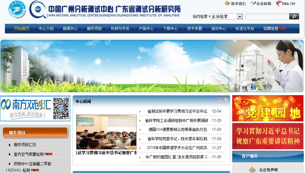 廣東省測試分析研究所(中國廣州分析測試中心)作為以理化分析測試為重點的綜合性研究和服務(wù)機構(gòu),已有50余年歷史。廣東省測試分析研究所成立于1972年,其前身是成立于1960年的廣東省中心實驗站。1985年,經(jīng)國家科委和廣東省人民政府批準(zhǔn),在廣東省測試分析研究所的基礎(chǔ)上建立了國家級的分析測試中心——中國廣州分析測試中心(簡稱中廣測)。中廣測于1990年通過省級計量認(rèn)證,1991年通過國家級計量認(rèn)證,2001年通過中國實驗室國家認(rèn)可。經(jīng)過多年的發(fā)展,中廣測目前已成為通過國家認(rèn)證認(rèn)可(CMA )、國家實驗室認(rèn)可(CNAS)和國家審查認(rèn)可(CAL)的第三方檢測、校準(zhǔn)實驗室和A類檢查機構(gòu),可向社會提供具有證明作用的測試數(shù)據(jù)和結(jié)果。中廣測的管理體系符合ISO/IEC 17025和ISO/IEC 17020的要求,因而也是依據(jù)ISO 9001運作的。根據(jù)中國合格評定國家認(rèn)可委員會與美國、歐盟、日本等國家和地區(qū)的認(rèn)可機構(gòu)達(dá)成的互認(rèn)協(xié)議,中廣測出具的數(shù)據(jù)和結(jié)果可獲得廣泛的國際互認(rèn)。中廣測通過 CMA/CNAS/CAL 認(rèn)可產(chǎn)品/產(chǎn)品類別1500多項,項目/參數(shù)8000多項,32個技術(shù)領(lǐng)域,對所有類型樣品的理化測試幾乎都能承接檢測。實驗室規(guī)模、技術(shù)實力和能力在國內(nèi)同類機構(gòu)中名列前茅。中廣測是國家科委和國家技術(shù)監(jiān)督局授權(quán)的科技成果檢測鑒定國家級機構(gòu),經(jīng)人力資源和社會保障部、全國博士后管理委員會批準(zhǔn)設(shè)立了中廣測博士后科研工作站,是中山大學(xué)-中國廣州分析測試中心(廣東省測試分析研究所)博士后創(chuàng)新實踐基地,是國家民航總局認(rèn)可的貨物航空運輸條件鑒定機構(gòu),是廣東省質(zhì)量技術(shù)監(jiān)督局授權(quán)的輻射劑量法定計量檢定機構(gòu),是廣東省司法廳核準(zhǔn)的司法鑒定機構(gòu)。中廣測是“廣東省化學(xué)危害應(yīng)急檢測技術(shù)重點實驗室”、“廣東省材料理化性能檢測與評價中心”、“廣東省分析測試技術(shù)公共實驗室”和“廣東省化學(xué)事故應(yīng)急檢測技術(shù)研究中心”的依托單位,是廣東省分析測試協(xié)會、廣東省分析測試標(biāo)準(zhǔn)化技術(shù)委員會、廣東核學(xué)會、泛珠三角和廣東省大型科學(xué)儀器協(xié)作共用網(wǎng)管理委員會辦公室的掛靠單位。中廣測設(shè)立了面向技術(shù)領(lǐng)域和行業(yè)領(lǐng)域的技術(shù)機構(gòu),包括綜合分析與逆向工程、食品安全技術(shù)、資源與環(huán)境、分析儀器、物理性能測試技術(shù)等5個研究室,以及輻射劑量計量檢定站、司法鑒定所、校準(zhǔn)實驗室、油品實驗室、藥物實驗室等5個專業(yè)實驗室;并在廣州南沙區(qū)、中山市、汕頭市、韶關(guān)市分別設(shè)立了實驗室,在廣州白云機場設(shè)立了辦事處,在佛山高新區(qū)設(shè)立了工作站。中廣測與中國分析測試協(xié)會聯(lián)合主辦并負(fù)責(zé)編輯出版中國分析測試協(xié)會會刊、中文核心期刊《分析測試學(xué)報》。多年來,中廣測為生產(chǎn)、科研、貿(mào)易、政府管理、訴訟、技術(shù)引進(jìn)、商務(wù)仲裁等活動提供了大量優(yōu)質(zhì)的分析測試技術(shù)服務(wù),為企業(yè)科技創(chuàng)新提供了強有力的分析測試共性技術(shù)支撐,為我國經(jīng)濟(jì)和社會發(fā)展做出了突出的貢獻(xiàn),曾被國務(wù)院和廣東省人民政府授予全國和廣東省先進(jìn)集體榮譽稱號。中廣測積極承擔(dān)國家、地方各級政府和企事業(yè)等單位委托的科研項目。50多年來,在應(yīng)用技術(shù)研究、分析測試新方法和新技術(shù)研究、儀器儀表的研究開發(fā)方面取得了100多項重要的科研成果,其中50多項獲省級以上科技成果獎,發(fā)表論文、出版專著1000多篇(部)。