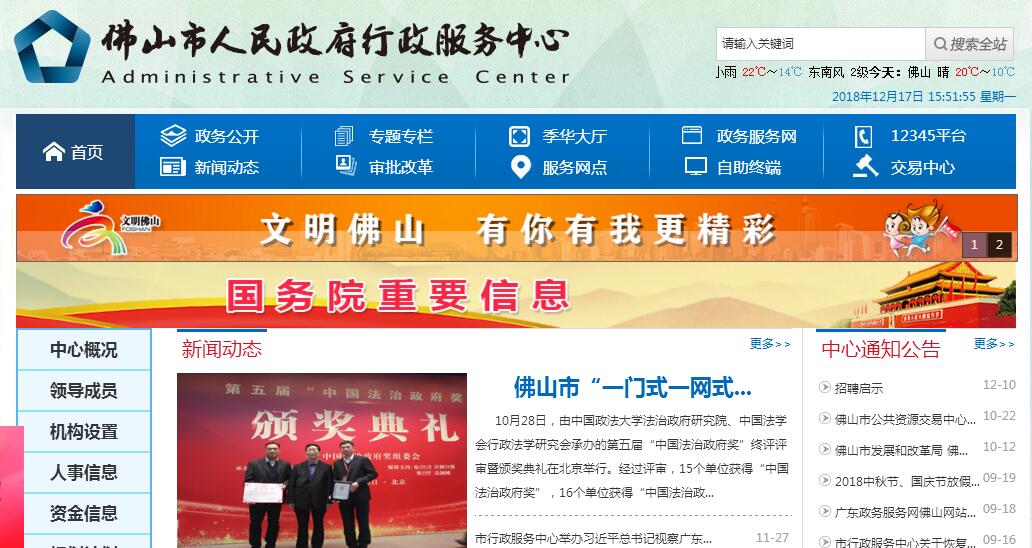 2003年3月,根據(jù)2002年佛山市十一屆人大五次會議提出的1號議案,佛山市人民政府行政服務(wù)中心經(jīng)批準成立,屬參照公務(wù)員管理事業(yè)單位,加掛“佛山市政府12345熱線管理領(lǐng)導(dǎo)小組辦公室”,“佛山市政務(wù)服務(wù)中心”和“佛山市消費投訴和經(jīng)濟違法行為舉報指揮中心”牌子,現(xiàn)設(shè)綜合科、協(xié)調(diào)督辦科、政務(wù)服務(wù)科(加掛“佛山市政府12345熱線管理中心”牌子)和政務(wù)管理科,管理佛山市公共資源交易中心。2011年3月組市公共資源交易中心組建成立,隸屬市行政服務(wù)中心管理。市行政服務(wù)中心現(xiàn)有事業(yè)編21人,專業(yè)技術(shù)雇員編1名,輔助雇員編6名。市行政服務(wù)中心實體大廳現(xiàn)租用禪城區(qū)季華五路公交大廈部分樓層辦公,辦公與服務(wù)場地面積共約10000平方米,中心辦公與服務(wù)場地面積約10000平方米。目前,市行政服務(wù)中心服務(wù)大廳進駐部門32個(其中納入綜合服務(wù)窗口的22個),共設(shè)44個對外服務(wù)窗口,進駐人員84名,進駐事項459項(含自助終端)。十年來,在市委、市政府的高度重視下,我市以深化行政審批制度改革為突破口,以打造統(tǒng)一政務(wù)服務(wù)平臺為依托,不斷推動行政管理體制改革和政務(wù)服務(wù)創(chuàng)新,營造良好的政務(wù)環(huán)境和營商環(huán)境,多項改革舉措走在全省甚至全國前列。2010年以來,我市政務(wù)窗口服務(wù)滿意度在全省一直排在前列。我市積極探索審批制度改革的經(jīng)驗得到省委、省政府充分肯定,2010年,省政府賦予佛山市為行政審批方式創(chuàng)新試點市。2012年12月,以佛山市政府名義上報的“簡政強鎮(zhèn)事權(quán)改革”獲得“中國法治政府提名獎”。2013年9月,南海區(qū)行政審批標準化改革被確定為全省試點,佛山市行政審批制度改革工作再次成為全省推進網(wǎng)上辦事工作的標桿。2014年11月,牽頭編制了《市行政職權(quán)清單》和《市企業(yè)投資管理“三單”》,在全省率先公布實施。2015年8月,在全省率先全面實施“一門式一網(wǎng)式”政府服務(wù)模式改革。2017年5月,佛山市“互聯(lián)網(wǎng)+政務(wù)服務(wù)”示范工程被正式列入國家“互聯(lián)網(wǎng)+政務(wù)服務(wù)”示范工程支持項目。2015年以來,根據(jù)國家和省關(guān)于放管服改革的部署,我市按照“把簡單留給群眾,把復(fù)雜留給信息化”的服務(wù)理念,在禪城區(qū)試點實施自然人“一門式”改革的基礎(chǔ)上,通過標準化、信息化、集約化等手段,大力整合政務(wù)資源、創(chuàng)新服務(wù)模式,打破區(qū)域、層級、部門的行政界限和信息孤島,全面推行“一門式一網(wǎng)式”政府服務(wù)模式改革。以打造“一門通辦、協(xié)同聯(lián)辦、同城通辦”服務(wù)模式、提高政府服務(wù)效能為主要目標,推行“一窗通辦”、“一網(wǎng)通辦”、“一號申請”,從群眾辦事習(xí)慣、互聯(lián)網(wǎng)普及程度等實際出發(fā),通過推動政府服務(wù)資源整合、辦事信息共享、辦事流程優(yōu)化,重構(gòu)政府、市場、社會之間的互動與協(xié)同治理體系,打造貼身貼心服務(wù)的“整體政府”,群眾只要進“一個門”、上“一張網(wǎng)”,就能夠享受無部門界限、無標準差異的政府服務(wù),著力打造“互聯(lián)網(wǎng)+政務(wù)服務(wù)”新模式。中心主要職責(zé):(一)承擔(dān)政務(wù)服務(wù)運行管理職責(zé),統(tǒng)籌行政審批和公共服務(wù)標準化、流程再造和優(yōu)化服務(wù)工作。(二)推進政務(wù)服務(wù)模式改革創(chuàng)新,配合行政審批制度改革相關(guān)工作;(三)統(tǒng)籌推進審批服務(wù)相對集中和窗口綜合服務(wù)工作,為市民和投資者提供“一站式”服務(wù)。(四)負責(zé)進駐中心窗口及人員的日常管理,協(xié)調(diào)、監(jiān)督進駐單位公開、公平、公正辦事,有序、高效運作,優(yōu)質(zhì)、廉潔服務(wù)。(五)負責(zé)全市政務(wù)服務(wù)體系的建設(shè)與管理,指導(dǎo)、協(xié)調(diào)中心之外有關(guān)職能部門的政務(wù)服務(wù)工作。(六)會同監(jiān)察機關(guān)實施行政審批電子監(jiān)察,參與全市政務(wù)服務(wù)的考評和監(jiān)督工作。(七)統(tǒng)籌管理政務(wù)服務(wù)數(shù)據(jù)。(八)負責(zé)佛山市12345行政服務(wù)與行政投訴熱線的規(guī)劃建設(shè)和運作管理,指導(dǎo)各區(qū)開展熱線工作,協(xié)調(diào)、監(jiān)督熱線各級成員單位的有關(guān)工作。(九)會同市政府辦公室開展政府信息公開工作。(十)宣傳和督促落實市政府投資優(yōu)惠政策以及便民利民措施,受理有關(guān)咨詢與投訴。(十一)管理市公共資源交易中心。(十二)指導(dǎo)各區(qū)行政服務(wù)中心工作。(十三)承辦市政府交辦的其他事項。