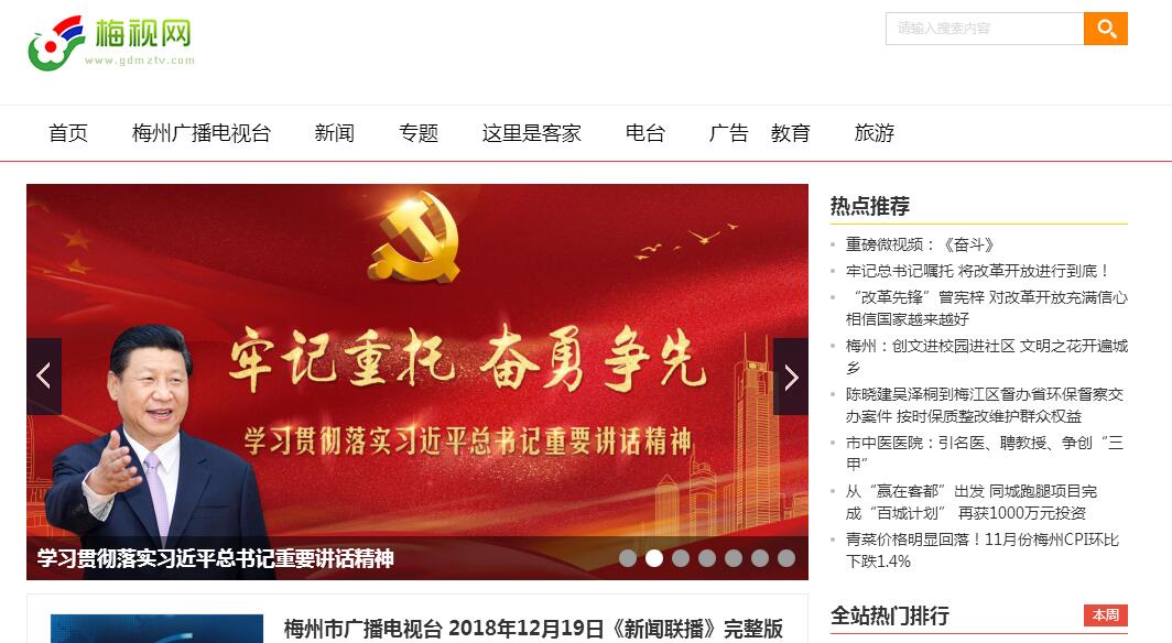 梅視網(wǎng),梅州地區(qū)最大的視頻類網(wǎng)站,梅州市廣播電視臺官方網(wǎng)站?!笆澜缈投肌睆V東梅州是中國歷史文化名城,素有華僑之鄉(xiāng)、文化之鄉(xiāng)、足球之鄉(xiāng)等美譽(yù),也是葉劍英元帥的家鄉(xiāng)。梅州市廣播電視臺地處城市中心、美麗的梅江河畔,廣電大樓高19層,建筑面積24000多平方米,辦公條件舒適。2004年由梅州市電視臺、梅州電臺、梅縣轉(zhuǎn)播臺,廣播電視服務(wù)公司整合而成,集廣播、電視、報紙、網(wǎng)絡(luò)、刊物、文化產(chǎn)業(yè)于一體。梅州市廣播電視臺目前有在職人員500多人,開辦有3套電視頻道和2套廣播頻道,內(nèi)設(shè)有12個部門及下轄廣東客都文化公司等3個單位,固定資產(chǎn)達(dá)到近3億 ,市場占有率及品牌價值均位居全省地級市廣播電視臺前列。日均播出電視節(jié)目50小時,廣播35小時。目前,梅州市廣播電視臺正全力以做大現(xiàn)代傳媒集團(tuán)為目標(biāo),以不懈的創(chuàng)新和追求,提高核心競爭力,并力爭三到五年上市。
