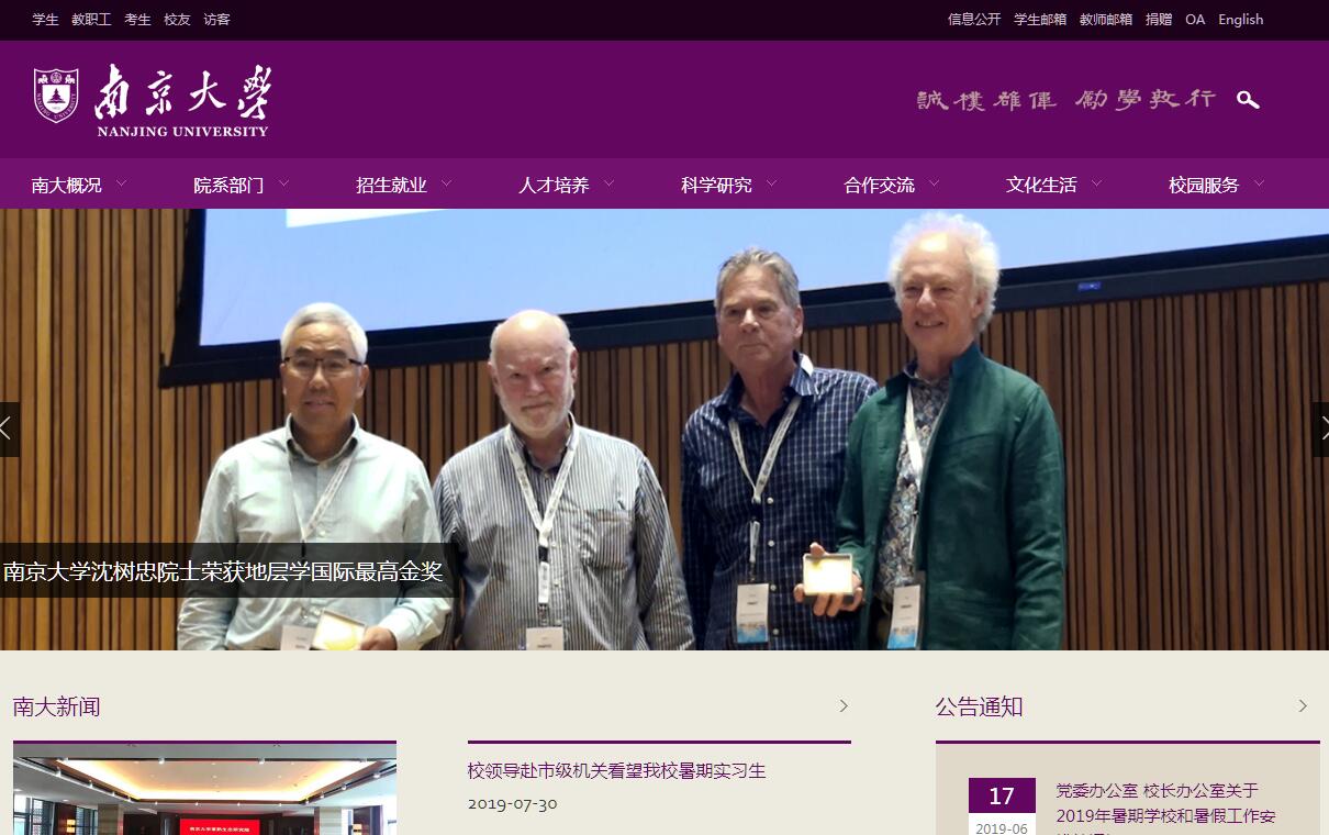 南京大學坐落于鐘靈毓秀、虎踞龍蟠的金陵古都,是一所歷史悠久、聲譽卓著的百年名校。其前身是創(chuàng)建于1902年的三江師范學堂,此后歷經(jīng)兩江師范學堂、南京高等師范學校、國立東南大學、第四中山大學、國立中央大學、國立南京大學等歷史時期,于1950年更名為南京大學。1952年,在全國高校院系調整中,南京大學調整出工學、農(nóng)學、師范等部分院系后與創(chuàng)辦于1888年的金陵大學文、理學院等合并,仍名南京大學。校址從四牌樓遷至鼓樓金大原址。在一個多世紀的辦學歷程中,南京大學及其前身與時代同呼吸、與民族共命運,謀國家之強盛、求科學之進步,為國家的富強和民族的振興做出了重要的貢獻。尤其是改革開放以來,作為教育部直屬的重點綜合性大學,南京大學又在嶄新的歷史機遇中煥發(fā)出新的生機,在教學、科研和社會服務等各個領域保持良好的發(fā)展態(tài)勢,各項辦學指標和綜合實力均位居全國高校前列。1994年,南京大學被確定為國家“211工程”重點支持的大學;1999年,南京大學進入國家“985工程”首批重點建設的高水平大學行列;2006年,教育部和江蘇省再次簽訂重點共建南京大學的協(xié)議;2011年,教育部和江蘇省簽署協(xié)議繼續(xù)重點共建南京大學;2016年,南京大學入選首批國家級雙創(chuàng)示范基地;2017年,南京大學入選A類世界一流大學建設高校名單,15個學科入選世界一流學科建設名單。南京大學目前擁有仙林、鼓樓、浦口三個校區(qū),有29個直屬院系,各類學生總計34580人,其中本科生13196人、碩士研究生12195人、博士研究生6036人、外國留學生3153人。全校設本科專業(yè)86個,專業(yè)碩士學位授權點24個,專業(yè)博士學位授權點1個,碩士學位授權一級學科10個,碩士學位授權二級學科點(不含一級學科覆蓋點)6個,博士學位授權一級學科41個,博士學位授權二級學科點(不含一級學科覆蓋點)2個,博士后流動站38個,國家級人才培養(yǎng)基地12個;有一級學科國家重點學科8個,二級學科國家重點學科13個,江蘇高校優(yōu)勢學科建設工程二期項目立項學科與重點序列學科20個;有國家實驗室(籌)1個,國家級2011協(xié)同創(chuàng)新中心2個,國家重點實驗室7個,教育部重點實驗室8個,江蘇高校協(xié)同創(chuàng)新中心5個,江蘇省重點(工程)實驗室10個,國家工程技術研究中心1個,國家地方聯(lián)合工程研究中心1個,教育部工程中心2個,環(huán)境保護部工程技術研究中心1個,國防科工局國防重點學科實驗室1個,國家測繪地理信息局重點實驗室1個,江蘇省工程中心10個,教育部人文社會科學重點研究基地4個,國家高端智庫建設培育單位1個。學校擁有一支高素質的師資隊伍,其中包括中國科學院院士29人,中國工程院院士3人,中國科學院外籍院士1人,第三世界科學院院士4人,俄羅斯科學院院士1人,加拿大皇家科學院院士1人,“千人計劃”創(chuàng)新人才31人、創(chuàng)業(yè)人才14人、“外專千人計劃”入選者4人,“萬人計劃”科技創(chuàng)新領軍人才10人、哲學社會科學領軍人才3人、百千萬工程領軍人才2人、教學名師2人,教育部“長江學者獎勵計劃”特聘教授97人、講座教授25人,國家杰出青年基金獲得者117人,國家級教學名師10人,國務院學位委員會學科評議組成員22人,國家級有突出貢獻的中青年科學、技術、管理專家27人,國家重點研發(fā)計劃、國家科技重大專項、重大科學研究計劃、“973計劃”、863計劃等重大項目首席科學家76人次,“青年千人計劃”入選者113人,“萬人計劃”青年拔尖人才8人,教育部“新世紀優(yōu)秀人才支持計劃”入選者238人,“百千萬人才工程”國家級人選34人。春風化雨、桃李芬芳。在過去的一個多世紀中,南京大學始終堅持育人為本,在各個歷史階段培養(yǎng)和造就了眾多中華英才,他們在各自的領域建功立業(yè)、成就卓著。改革開放以來,南京大學在教育教學改革中進行了多方面的探索,形成了許多重要的教育思想和教學理念,在國內外高等教育界產(chǎn)生了重要的影響。當前,南京大學提出了“辦中國最好的本科教育”的奮斗目標,堅持“學科建設與本科教學融通,通識教育與個性化培養(yǎng)融通,拓寬基礎與強化實踐融通,學會學習與學會做人融通” 的人才培養(yǎng)理念,不斷深化創(chuàng)新人才培養(yǎng)機制改革,積極為社會各行各業(yè)培養(yǎng)具有創(chuàng)新精神、實踐能力和國際視野的未來領軍人才和拔尖創(chuàng)新人才。南京大學的前身即“以科學名世”,格物致知、追求真理的科學精神和傳統(tǒng)始終貫穿于南京大學的發(fā)展史中,成為南京大學辦學最重要的特色。一代又一代的南大人孜孜求索、攀高攻堅、為國爭光、為民造福,涌現(xiàn)出一大批優(yōu)秀的科研成果,蜚聲國內外學界。今日南京大學以“加強應用、注重基礎、發(fā)展邊緣、促進聯(lián)合”為方針,以“基礎研究面向國際學術前沿,應用研究面向國家戰(zhàn)略需求和國民經(jīng)濟建設主戰(zhàn)場、致力于解決關系國計民生的重大理論和現(xiàn)實問題”為指導思想,調整科研布局、加強科研組織,整體提高原創(chuàng)科研能力與水平,將南京大學建成我國重要的科學研究中心。自上個世紀初建校以來,南京大學就一直是開展國際交流與合作最活躍的中國大學之一,與世界上眾多一流大學和高水平科
