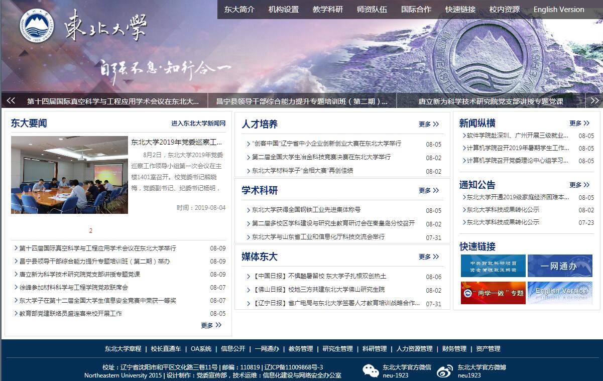 東北大學(xué)始建于1923年4月26日,是一所具有愛國主義光榮傳統(tǒng)的大學(xué)。1928年8月至1937年1月,著名愛國將領(lǐng)張學(xué)良將軍兼任校長。1949年3月,在東北大學(xué)工學(xué)院和理學(xué)院(部分)的基礎(chǔ)上成立沈陽工學(xué)院。1950年8月,定名為東北工學(xué)院,1993年3月,復(fù)名為東北大學(xué),1997年1月原沈陽黃金學(xué)院并入東北大學(xué),1998年9月劃轉(zhuǎn)為教育部直屬高校。學(xué)校是國家首“211工程”和“985工程”重點建設(shè)的高校,2017年9月,經(jīng)國務(wù)院批準(zhǔn),進入一流大學(xué)建設(shè)行列。在90余年的辦學(xué)歷程中,東北大學(xué)始終堅持與國家發(fā)展和民族復(fù)興同向同行,形成了“自強不息、知行合一”校訓(xùn)精神。歷史上,東北大學(xué)師生曾是“一二·九”運動的主力和先鋒,在建設(shè)時期,學(xué)校先后研發(fā)出國內(nèi)第一臺模擬電子計算機、第一臺國產(chǎn)CT、第一塊超級鋼以及釩鈦磁鐵礦冶煉新技術(shù)、鋼鐵工業(yè)節(jié)能理論和技術(shù)、控軋控冷技術(shù)、混合智能優(yōu)化控制技術(shù)等一大批高水平科研成果,興辦了第一個大學(xué)科學(xué)園,培育了東軟、東網(wǎng)等高新技術(shù)企業(yè),在技術(shù)創(chuàng)新、轉(zhuǎn)移和產(chǎn)學(xué)研合作方面形成了自己的辦學(xué)特色。東北大學(xué)坐落在東北中心城市遼寧省沈陽市,在河北省秦皇島市設(shè)有東北大學(xué)秦皇島分校。學(xué)校占地總面積255萬平方米,建筑面積168萬平方米。學(xué)?,F(xiàn)有教職工4538人,其中專任教師2711人。有中國科學(xué)院和中國工程院院士4人,海外院士4人,國家“千人計劃”入選者22人,青年千人計劃10人。國家“高層次人才特殊支持計劃”入選者8人,教育部“長江學(xué)者獎勵計劃”特聘教授、講座教授27人,國家杰出青年基金獲得者23人,海外及港澳學(xué)者合作研究基金獲得者16人,教育部新世紀(jì)優(yōu)秀人才102人,國家“百千萬人才工程”入選者14人。國家自然科學(xué)基金創(chuàng)新群體4個,教育部創(chuàng)新團隊3個。學(xué)校設(shè)有100多個研究機構(gòu),其中國家重點實驗室3個,國家工程(技術(shù))研究中心4個,國家工程實驗室3個。設(shè)有國家級協(xié)同創(chuàng)新中心2個,遼寧省協(xié)同創(chuàng)新中心3個。學(xué)校學(xué)科涵蓋哲學(xué)、經(jīng)濟學(xué)、法學(xué)、教育學(xué)、文學(xué)、理學(xué)、工學(xué)、管理學(xué)、藝術(shù)學(xué)等門類。設(shè)有68個本科專業(yè),其中國家級特色專業(yè)15個;有179個學(xué)科有權(quán)招收和培養(yǎng)碩士研究生(另設(shè)10個專業(yè)學(xué)位授權(quán)點),109個學(xué)科有權(quán)招收和培養(yǎng)博士研究生;有17個博士后流動站;3個一級學(xué)科國家重點學(xué)科,4個二級學(xué)科國家重點學(xué)科,1個國家重點(培育)學(xué)科,共涵蓋16個二級學(xué)科。學(xué)校以一流為目標(biāo)、以改革為動力推進學(xué)科布局優(yōu)化和調(diào)整,高峰引領(lǐng)、高原支撐、卓越促進、特色牽動,可持續(xù)發(fā)展的學(xué)科建設(shè)格局正在形成。東北大學(xué)具備培養(yǎng)學(xué)士、碩士、博士和博士后的完整教育體系。學(xué)校全日制在校生45000余人,其中本科生29872人,碩士研究生11364人,博士研究生3850人。學(xué)校圍繞立德樹人的根本任務(wù),在拔尖創(chuàng)新型人才培養(yǎng)、教學(xué)理念更新、教學(xué)方法研究、培養(yǎng)模式探索等方面取得了豐碩成果?!笆濉币詠恚瑬|北大學(xué)共獲得國家級教學(xué)成果獎3項,國家級精品視頻公開課11門,國家級精品資源共享課課程15門,國家級精品在線開放課程(慕課)6門,國家級“十二五”規(guī)劃教材18種。獲得全國優(yōu)秀博士學(xué)位論文提名5篇。學(xué)生獲得創(chuàng)新創(chuàng)業(yè)競賽國際大獎497項、國家級獎勵1967項、優(yōu)秀創(chuàng)新創(chuàng)業(yè)項目1580項,專利384項,共有56家學(xué)生創(chuàng)業(yè)企業(yè)落地。學(xué)生生源質(zhì)量、畢業(yè)生就業(yè)率及就業(yè)質(zhì)量保持較高水平。學(xué)校堅持服務(wù)國家戰(zhàn)略和區(qū)域發(fā)展的科研方向,鼓勵自由探索,推動協(xié)同創(chuàng)新,基礎(chǔ)研究水平穩(wěn)步提高,技術(shù)創(chuàng)新的競爭力不斷增強?!笆濉币詠?,學(xué)校承擔(dān)各類科技項目6387項,獲各類科技獎勵279項,其中國家級獎勵14項,省部級一等獎58項;獲得國家專利1499項,其中發(fā)明專利1127項;被三大檢索收錄的論文共14644篇。主(承)辦國際、國內(nèi)學(xué)術(shù)會議161次,其中國際會議65次。學(xué)校在技術(shù)創(chuàng)新和成果轉(zhuǎn)化方面形成了獨特的比較優(yōu)勢,探索出了一條政產(chǎn)學(xué)研用相結(jié)合的有效途徑,實現(xiàn)了學(xué)科、人才、科研、產(chǎn)業(yè)良性互動發(fā)展。2016年,學(xué)校高新技術(shù)產(chǎn)業(yè)銷售收入110億元,科技產(chǎn)業(yè)綜合指標(biāo)名列全國高校第三位。學(xué)校堅持面向新一代信息技術(shù)、新材料、生命健康等領(lǐng)域,新建云計算科技園、新材料產(chǎn)業(yè)園、健康產(chǎn)業(yè)園,推進云計算和大數(shù)據(jù)產(chǎn)業(yè)快速發(fā)展,推動遼沈地區(qū)裝備制造業(yè)創(chuàng)新升級,為東北大學(xué)服務(w