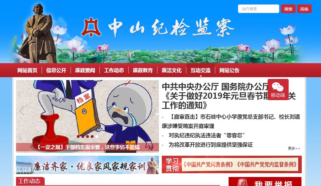 中山紀(jì)檢監(jiān)察網(wǎng)是中山市紀(jì)委、監(jiān)察局(預(yù)防腐敗局)的綜合性政務(wù)門戶網(wǎng)站。網(wǎng)址為 www.zsjjjc.gov.cn。中山紀(jì)檢監(jiān)察網(wǎng)于2007年建立以來,在黨風(fēng)廉政建設(shè)宣傳中發(fā)揮了重要作用。2010年4月,中山市紀(jì)委(監(jiān)察局)從頁面設(shè)計、欄目設(shè)計到功能設(shè)計對網(wǎng)站進行全面提升,把網(wǎng)站打造成內(nèi)容新穎、形式活潑、特色鮮明、功能完備、具有一定影響力的紀(jì)檢監(jiān)察門戶網(wǎng)站。2011年7月,中山紀(jì)檢監(jiān)察網(wǎng)改版升級成功并正式開通運行。改版升級后的中山紀(jì)檢監(jiān)察網(wǎng)立足中山,面向全國,以突出中山特色,以打造中山市反腐倡廉的社會窗口、紀(jì)檢監(jiān)察工作的學(xué)習(xí)園地、廣大黨員干部的良師益友為宗旨,在大力宣傳黨中央反腐倡廉方針政策的同時,大力弘揚本土廉政文化,引導(dǎo)全市各界,尤其是各級紀(jì)檢監(jiān)察機關(guān)和廣大紀(jì)檢監(jiān)察干部充分關(guān)注和利用好這個陣地,大力宣傳和及時報道本地區(qū)、本部門開展黨風(fēng)廉政建設(shè)和反腐敗工作的做法和經(jīng)驗,把中山紀(jì)檢監(jiān)察網(wǎng)辦成我市黨風(fēng)廉政建設(shè)和反腐敗工作的窗口和平臺,在全社會營造反腐倡廉的良好氛圍。2015年3月,為進一步完善網(wǎng)站功能,提升網(wǎng)站影響力,根據(jù)中央紀(jì)委、省紀(jì)委的有關(guān)要求,結(jié)合中山紀(jì)檢監(jiān)察網(wǎng)站建設(shè)實際,我們對中山紀(jì)檢監(jiān)察網(wǎng)進行升級改版,具體完善首頁欄目模式,優(yōu)化首頁版塊設(shè)置,提升網(wǎng)站后臺功能,突出紀(jì)檢監(jiān)察主業(yè),增強互動溝通,切實增強信息的時效性和實效性,進一步強化網(wǎng)站作為委局門戶網(wǎng)站的綜合效能。新版網(wǎng)站在欄目設(shè)置上進行了較大的修改和創(chuàng)新,對以往的欄目進行整合和修改,形成現(xiàn)有的“信息公開”、“廉政要聞”、“工作動態(tài)”、“廉政教育”、“廉政文化”、“互動交流”等6個一級欄目和領(lǐng)導(dǎo)機構(gòu)、組織機構(gòu)、黨風(fēng)政風(fēng)、紀(jì)律審查、宣傳預(yù)防、綜合信息、基層動態(tài)、廉政風(fēng)范、廉政史鑒、案件警示、廉潔微小說、廉潔微廣播、廉潔微視頻等21個二級欄目。努力將中山紀(jì)檢監(jiān)察網(wǎng)打造成為黨風(fēng)廉政建設(shè)和反腐敗工作信息的權(quán)威發(fā)布平臺、反腐倡廉的宣教平臺、黨員干部的學(xué)習(xí)平臺、溝通市民的綜合平臺。歡迎對中山紀(jì)檢監(jiān)察網(wǎng)提出寶貴的建議和意見。