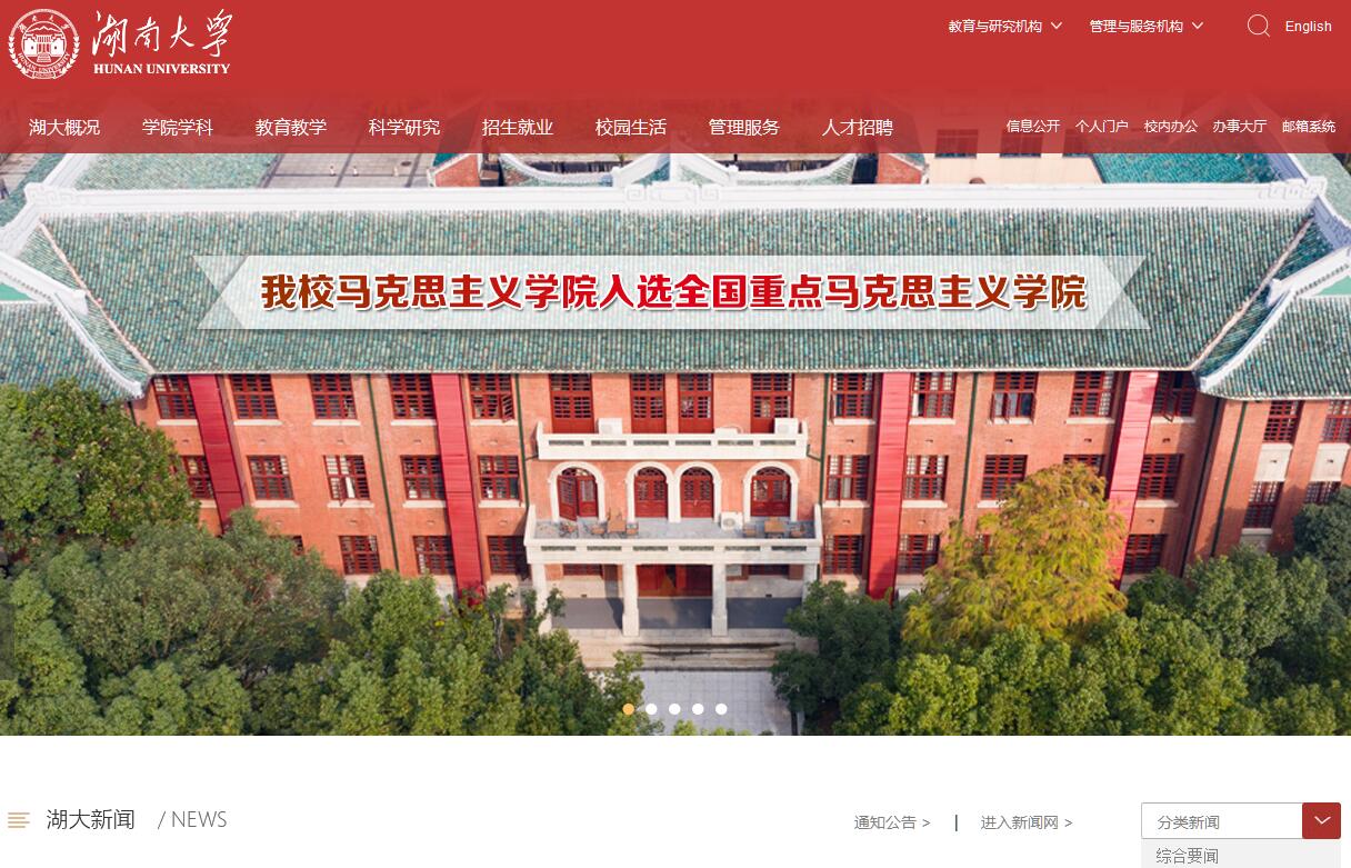 湖南大學坐落在中國歷史文化名城長沙,校區(qū)位于湘江之濱、岳麓山下,享有"千年學府,百年名校"之譽。學校是國家教育部直屬的全國重點綜合性大學,是國家"211工程"、"985工程"重點建設高校,是國家“世界一流大學建設高?!薄W校辦學起源于宋太祖開寶九年(公元976年)創(chuàng)建的岳麓書院,歷經(jīng)宋、元、明、清等朝代的變遷,始終保持著文化教育的連續(xù)性。1903年改制為湖南高等學堂,1926年定名湖南大學,1937年成為國民政府教育部十余所國立大學之一。中華人民共和國成立后,中共一大代表、教育家李達為新中國第一任湖南大學校長,毛澤東同志親筆題寫了校名。1953年全國院系調整,學校曾先后更名為中南土木建筑學院和湖南工學院,1959年恢復湖南大學原稱。1963年起隸屬國家機械工業(yè)部,1978年列為全國重點大學,1998年調整為教育部直屬高校。2000年,湖南大學與湖南財經(jīng)學院合并組建成新的湖南大學。在長期的辦學歷程中,學校繼承和發(fā)揚"傳道濟民、愛國務實、經(jīng)世致用、兼容并蓄"的優(yōu)良傳統(tǒng),積淀了以校訓"實事求是、敢為人先"、校風"博學、睿思、勤勉、致知"為核心的湖大精神,形成了"基礎扎實、思維活躍、適應能力強、綜合素質高"的人才培養(yǎng)特色。新中國成立以來,學校為國家和社會培養(yǎng)了一大批高級專門人才,許多畢業(yè)生成長為著名的專家學者、企業(yè)家和優(yōu)秀的黨政管理人才,師生中先后有35人當選為學部委員和"兩院"院士。學?,F(xiàn)有全日制在校學生36000余人,其中本科生20000余人,研究生15000余人。畢業(yè)生初次就業(yè)率一直保持在95%以上,居在湘高校第一,并穩(wěn)居部屬高校第一方陣。學校設有研究生院和23個學院,學科專業(yè)涵蓋哲學、經(jīng)濟學、法學、教育學、文學、歷史學、理學、工學、管理學、醫(yī)學、藝術學等11大學科門類。擁有27個博士學位授權一級學科,1個博士專業(yè)學位授權,36個碩士學位授權一級學科,20個碩士專業(yè)學位授權,建有國家重點學科一級學科2個、國家重點學科二級學科14個,博士后科研流動站25個。目前學校7個學科進入ESI前1%,其中工程學學科2018年1月躋身ESI全球前1‰。7個學科入選國防特色學科,化學、機械工程學科入選教育部世界一流學科建設行列。學?,F(xiàn)有教職工近4000人,其中專任教師1950余人,教授、副教授1400余人,院士7人,"千人計劃"38人,"萬人計劃"學者20人、"長江學者"特聘教授、講座教授、青年學者18人,國家杰出青年基金獲得者20人,國務院學位委員會學科評議組成員6人。入選國家百千萬人才工程23人、國家創(chuàng)新人才推進計劃中青年創(chuàng)新領軍人才2人,教育部新世紀優(yōu)秀人才支持計劃入選者134人,湖南省"百人計劃"學者53人,湖南省"芙蓉學者獎勵計劃"特聘教授、講座教授14人,享受政府特殊津貼專家208人,國家教學名師4人,國家自然科學基金創(chuàng)新研究群體4個,教育部"長江學者與創(chuàng)新團隊發(fā)展計劃"創(chuàng)新團隊8個,湖南省自然科學基金創(chuàng)新研究群體11個。學校設有國家工科(化學)基礎課教學基地、國家理科(化學)基礎科學研究與教學人才培養(yǎng)基地、國家示范性軟件學院教學基地、全國大學生文化素質教育基地,擁有7個國家級教學團隊、6門雙語教學示范課程、6個人才培養(yǎng)模式創(chuàng)新實驗區(qū)、4個國家級實驗教學示范中心、5個"卓越計劃"國家級試點專業(yè)、4個國家級大學生校外實踐基地、1個國家級虛擬仿真實驗教學中心。近五年,學校獲得國家級教學成果二等獎2項,國家精品視頻公開課10門、國家級精品資源共享課21門。學校設有2個國家重點實驗室、2個國家工程技術研究中心、2個國家級國際聯(lián)合研究中心、1個國家級國際科技合作基地、1個國家工程實驗室、1個國家國防科工局國防重點學科實驗室、5個教育部重點實驗室、4個教育部工程技術研究中心、3個教育部高等學校學科創(chuàng)新引智基地。建有20個湖南省重點實驗室、2個湖南省工程技術研究中心、17個湖南省省級社會科學研究基地。學校參與組建國家“2011協(xié)同創(chuàng)新中心”3個。學校建有國家級大學科技園和“兩山一湖”創(chuàng)新創(chuàng)業(yè)基地,在長沙高新區(qū)麓谷建立了產(chǎn)學研基地,建立了56個高水平校地企產(chǎn)學研平臺,與32 個?。ㄊ校灾螀^(qū))和上千家企業(yè)建立了產(chǎn)學研合作關系。學校運營管理的國家超級計算長沙中心是國家設立的第三家國家超級計算中心,已為高校、科研機構、政府和企事業(yè)等近數(shù)百家用戶單位提供高性能計算、云計算及大數(shù)據(jù)處理服務。目前,學校已與世界上160余所高校和科研機構建立了學術合作與交流關系,每年聘請的長短期外國專家達300多人次,全年招收來自90多個國家和地區(qū)的各類留學生,以及港澳臺學生1000余人,建立學生海外實習基地。近年來,近2000名學生赴國(境)外合作院校交流學習或聯(lián)合培養(yǎng)。學校與韓國湖南大學、加拿大里賈納大學、美國科羅拉多州立大學合作成立了孔子學院,成為湖南省在海外建立孔子學院數(shù)量最多的高校。學校校園占地面積153.196萬平方米,校舍建筑面積104.593萬平方米。擁有藏書690余萬冊,其中中外文數(shù)據(jù)庫128個。全網(wǎng)支持下一代互