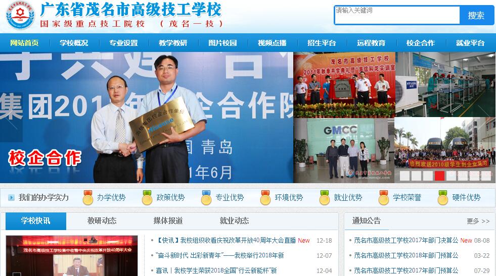 茂名市高級技工學(xué)校于1988年經(jīng)廣東省人民政府批準(zhǔn)成立,是茂名市人民政府直屬、茂名市人力資源和社會保障局主管的國家級重點(diǎn)公辦技工院校。學(xué)校堅(jiān)持以科學(xué)發(fā)展觀為統(tǒng)領(lǐng),全面貫徹黨的教育方針,堅(jiān)持以培養(yǎng)高技能人才為目標(biāo),秉承“厚德、博學(xué)、強(qiáng)技、創(chuàng)新”的校訓(xùn),堅(jiān)持“高端引領(lǐng)、注重內(nèi)涵、校企合作、勤儉辦學(xué)、穩(wěn)步發(fā)展”的辦學(xué)理念,辦學(xué)規(guī)模不斷擴(kuò)大,辦學(xué)水平不斷提高,在校學(xué)生已突破10000人規(guī)模,自創(chuàng)辦以來,為社會培養(yǎng)輸送了80000多名各級各類技能型人才。學(xué)校地處茂名市政治、經(jīng)濟(jì)、文化教育中心區(qū),地理位置優(yōu)越,交通便利,環(huán)境優(yōu)雅,師資力量雄厚,教學(xué)經(jīng)驗(yàn)豐富,教學(xué)設(shè)備先進(jìn),生活設(shè)施完善,學(xué)習(xí)環(huán)境舒適。開設(shè)有模具制造、數(shù)控加工、機(jī)電一體化、汽車維修、汽車維修(新能源汽車方向)、工業(yè)機(jī)器人應(yīng)用與維護(hù)、3D打印技術(shù)應(yīng)用、無人機(jī)技術(shù)應(yīng)用、電氣自動化、烹飪(中式烹調(diào))、烹飪(中西式面點(diǎn))、建筑施工、電子技術(shù)應(yīng)用、計(jì)算機(jī)網(wǎng)絡(luò)應(yīng)用、計(jì)算機(jī)廣告制作(平面設(shè)計(jì))、計(jì)算機(jī)動畫制作、幼兒教育、會計(jì)、電子商務(wù)、商務(wù)文秘、服裝制作與營銷(時(shí)裝設(shè)計(jì))、農(nóng)機(jī)使用與維修、農(nóng)村電氣技術(shù)、農(nóng)村經(jīng)濟(jì)綜合管理等二十多個(gè)專業(yè),開設(shè)中級技工班、高級技工班、高技晉升班、預(yù)備技師班、“高技+大?!彪p學(xué)歷班和短期培訓(xùn)班。專業(yè)設(shè)置齊全,辦學(xué)層次多元化,能夠適應(yīng)經(jīng)濟(jì)社會發(fā)展對技能型人才的需要和滿足廣大學(xué)生報(bào)讀的需求。學(xué)校堅(jiān)持校企合作的辦學(xué)模式,在廣州、深圳、東莞、佛山、中山、惠州等珠三角地區(qū)和茂名地區(qū)500多家大型知名企業(yè)建立了穩(wěn)定的就業(yè)基地,凡我校畢業(yè)生都實(shí)行五年就業(yè)跟蹤服務(wù),把穩(wěn)定就業(yè)作為技工教育的最終目標(biāo),把就業(yè)工作做到學(xué)生滿意、家長滿意和企業(yè)滿意,實(shí)現(xiàn)畢業(yè)生100%就業(yè),得到省市各級領(lǐng)導(dǎo)和社會各界的充分肯定,深受廣大學(xué)生、家長和用人單位的信賴和歡迎。