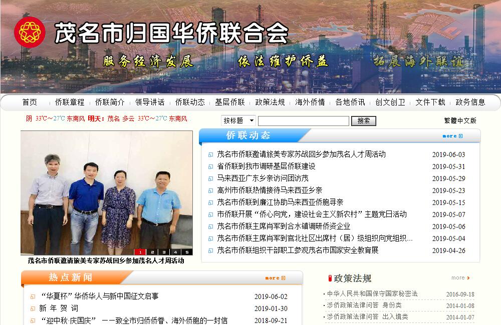 茂名市歸國華僑聯(lián)合會(簡稱茂名市僑聯(lián))成立于1979年,是中共茂名市委領(lǐng)導(dǎo)的由全市歸僑、僑眷組成的人民團體,是黨和政府聯(lián)系廣大歸僑、僑眷和海外僑胞的橋梁與紐帶,是廣東省僑聯(lián)的團體會員、茂名市政協(xié)的組成單位,服務(wù)對象主要是茂名市50多萬歸僑僑眷和60多萬祖籍茂名海外僑胞和港澳同胞。茂名市僑聯(lián)屬下有茂南、電白、信宜、高州、化州5個區(qū)、縣級市僑聯(lián);有信宜東鎮(zhèn)、朱砂、茂南鎮(zhèn)盛等20個鎮(zhèn)級僑聯(lián);金垌鎮(zhèn)馬辣村、朱砂鎮(zhèn)埠頭村、朱砂鎮(zhèn)古令村、東鎮(zhèn)街道旺同村、大成鎮(zhèn)大樟根村、坡心鎮(zhèn)新坡村6個村級僑聯(lián);廣東石油化工學(xué)院僑聯(lián)1個高校僑聯(lián);信宜華僑中學(xué)1個中學(xué)僑聯(lián);茂名市僑聯(lián)青年委員會、茂名市僑聯(lián)留學(xué)人員聯(lián)誼會、茂名市僑聯(lián)法律顧問委員會3個直屬團體;高州市僑商會1個僑商組織。茂名市僑聯(lián)機關(guān)是參照公務(wù)員管理的正處級單位,內(nèi)設(shè)辦公室和經(jīng)濟聯(lián)絡(luò)部,共有干部職工10人?,F(xiàn)任黨組書記、主席肖軍,從國內(nèi)外的知名人士中聘請了31名榮譽主席、32名名譽主席、62名顧問。茂名市僑聯(lián)機關(guān)主辦有《茂名僑報》?!睹麅S報》已成為茂名市僑務(wù)宣傳的主要陣地和全市對外宣傳的重要窗口之一。