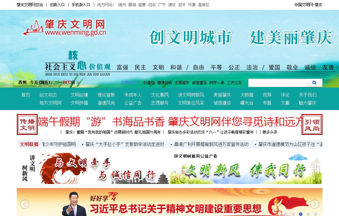 | 網(wǎng)站簡介: 肇慶文明網(wǎng)是肇慶市文明辦(肇慶市精神文明建設(shè)委員會辦公室)主辦的官方網(wǎng)站,是肇慶市宣傳思想文化工作和精神文明建設(shè)的重要窗口。我們倡導(dǎo)文明,我們建設(shè)文明,我們展示文明。網(wǎng)站主要發(fā)布宣傳思想文化和精神文明建設(shè)重要信息,進(jìn)行理論宣傳和形勢政策教育,開展思想道德建設(shè)和精神文明創(chuàng)建活動,傳播文明、引領(lǐng)風(fēng)尚,促進(jìn)社會文明水平和公民文明素質(zhì)的提高肇慶文明網(wǎng)建設(shè)目標(biāo)是成為推動宣傳思想工作和精神文明建設(shè)的工作平臺,傳播文明、引領(lǐng)風(fēng)尚的重要陣地,文明辦網(wǎng)、建設(shè)肇慶特色網(wǎng)絡(luò)文化的示范窗口。 |