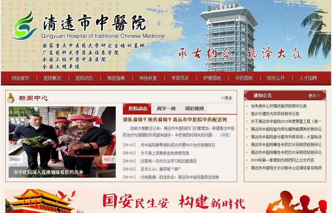 清遠市中醫(yī)院集醫(yī)療、康復、教學、科研、預防、保健等功能為一體。是全國首批通過國家評審的三級甲等中醫(yī)醫(yī)院,粵北地區(qū)唯一一家“三級甲等”中醫(yī)醫(yī)院,廣州中醫(yī)藥大學附屬醫(yī)院、博士后創(chuàng)新實踐基地和研究生培養(yǎng)基地,廣東省聯(lián)合培養(yǎng)研究生示范基地和全國文明單位。建院55年,歷史悠久,具有深厚的中醫(yī)文化底蘊。醫(yī)院占地面積70余畝,建筑面積5萬多平方米。編制床位1000張,實際開放病床700張。年住院病人3萬人次,年門診病人50萬人次。醫(yī)院人才薈萃。有正高職稱和副高職稱90多人;并有廣東省和清遠市名中醫(yī)7人;博士生導師1人,碩士生導師3人,博士后1人,博士8人,碩士70余人,市管拔尖人才2人。醫(yī)療設施完善,設備先進?,F(xiàn)擁有64排螺旋CT、磁共振(MRI)、帶DSA和C型臂多功能數(shù)字化X光機、前列腺電切鏡、雙能X線骨密度檢測儀、胃腸動力檢測儀、超聲內(nèi)鏡等各種內(nèi)鏡、四維彩超及一批先進中醫(yī)特色醫(yī)療設備。成功開創(chuàng)了清遠市多個“高、新、尖”技術(shù)項目:包括直腸癌根治手術(shù),腔鏡手術(shù)和前列腺電切手術(shù);關(guān)節(jié)鏡手術(shù)及各種難度較高的骨科手術(shù)等。其中,利用低溫等離子鏡開展前列腺電切手術(shù)、ERCP內(nèi)鏡治療技術(shù)、雙能X線骨密度檢測技術(shù)是清遠?人不動醫(yī)護動、病人不動管理動”即“三動三不動”管理模式,該模式多次在省內(nèi)外行業(yè)會議及學術(shù)會議作經(jīng)驗介紹;●傳承“名師帶徒”,中醫(yī)精髓薪火相傳;●首創(chuàng)獨具特色的以名老中醫(yī)主導的“多對一”名醫(yī)會診;●清遠首家推出針灸、醫(yī)療性推拿夜診門診服務;●在連續(xù)兩次“中醫(yī)醫(yī)院管理年”檢查評估中,得分居全省前列;近年來,國家衛(wèi)生部王國強副部長、省政府雷于藍副省長(時任 )、省衛(wèi)生廳姚志彬廳長、市委市政府葛長偉書記、 郭峰市長等各級領(lǐng)導非常關(guān)心我院的發(fā)展,多次親臨我院指導工作,對我院在發(fā)揮中醫(yī)藥特色優(yōu)勢和中醫(yī)藥文化建設等方面的工作給予了充分肯定和高度評價。目前,清遠市政府重點工程項目,醫(yī)院新國醫(yī)樓正在建設當中,新樓高19層,地下二層,總建筑面積51250m2,屆時,清遠市中醫(yī)院將以更加嶄新面貌屹立在北江橋頭,為百姓提供更好更優(yōu)質(zhì)的中醫(yī)藥服務。