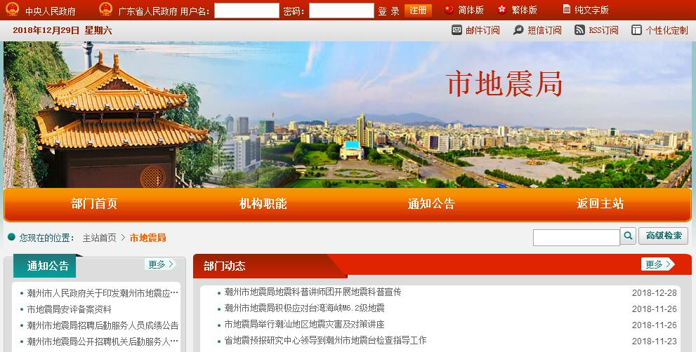 潮州市地震局為市人民政府直屬的正處級事業(yè)單位,賦予防震減災(zāi)工作的行政管理職能。其主要職責:(一)貫徹落實國家和省防震減災(zāi)工作的方針、政策、法規(guī),組織起草有關(guān)地方規(guī)范性文件,并監(jiān)督檢查其執(zhí)行情況。(二)制訂防震減災(zāi)事業(yè)中長期發(fā)展規(guī)劃,編制防震減災(zāi)工作年度計劃,并組織實施;管理監(jiān)督防震減災(zāi)事業(yè)費和專項資金的使用。(三)管理地震監(jiān)測工作,組織和管理群眾測報工作,負責提出地震趨勢意見;保護地震監(jiān)測設(shè)施和地震觀測環(huán)境。(四)承擔在破壞性地震發(fā)生后市政府抗震救災(zāi)指揮機關(guān)辦事機構(gòu)的職責。參與城市總體規(guī)劃中城市抗震防災(zāi)規(guī)劃的審查,會同有關(guān)部門和協(xié)助政府擬定破壞性地震應(yīng)急預(yù)案,綜合防御措施,檢查監(jiān)督其落實。負責震情速報和地震災(zāi)情速報;負責地震災(zāi)害損失評估;參與制定地震災(zāi)區(qū)重建規(guī)劃。(五)管理地震烈度區(qū)劃和震害預(yù)測工作;參與城市總體規(guī)劃中“城市抗震防災(zāi)規(guī)劃”的審查;管理城鎮(zhèn)、經(jīng)濟開發(fā)區(qū)以及重大工程建設(shè)場地的地震安全性評價工作;負責地震安全性評價工作資格審查、認證和任務(wù)登記。會同有關(guān)部門管理海洋地震及地震次生災(zāi)害的防災(zāi)工作。(六)管理以地震動參數(shù)和烈度表述的抗震設(shè)防技術(shù)參數(shù),負責工程抗震設(shè)防設(shè)計規(guī)范技術(shù)標準的審定和修定,參加重點建設(shè)工程抗震設(shè)計的會審,指導(dǎo)和監(jiān)督重大工程以及重要設(shè)施的抗震設(shè)防工作。(七)推進地震科技現(xiàn)代化;組織管理地震科學(xué)技術(shù)研究,科技成果的推廣應(yīng)用;組織開展地震科技工作與交流。(八)會同有關(guān)部門開展防震減災(zāi)宣傳教育工作,普及防震減災(zāi)知識,提高全社會的減災(zāi)意識。(九)管理所屬事業(yè)單位及地方地震臺站,負責市防震抗震領(lǐng)導(dǎo)小組辦公室的日常工作。指導(dǎo)縣區(qū)防震減災(zāi)工作。(十)承辦市委、市人民政府和上級地震局交辦的其他事項。