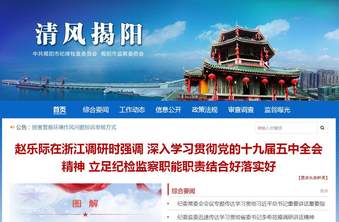 | 網(wǎng)站簡(jiǎn)介: 清風(fēng)揭陽(揭陽廉政網(wǎng))是中共揭陽市紀(jì)委、揭陽市監(jiān)察委官方網(wǎng)站,是全市反腐倡廉建設(shè)的輿論陣地,紀(jì)檢監(jiān)察機(jī)關(guān)工作信息平臺(tái)。 |