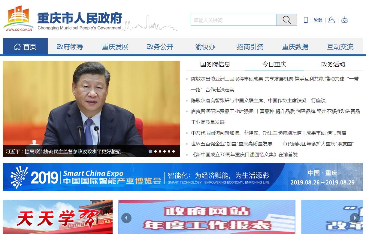 “中國重慶”政府網(wǎng)是重慶市人民政府在互聯(lián)網(wǎng)上建立的門戶網(wǎng)站,由市政府網(wǎng)站和市級各部門、各區(qū)縣(自治縣)人民政府子網(wǎng)站構(gòu)成,于1997年6月18日正式開通。 “中國重慶”政府網(wǎng)開設(shè)概況、政府信息、辦事服務(wù)、互動交流及網(wǎng)站導(dǎo)航等5個欄目,是重慶市人民政府在互聯(lián)網(wǎng)上公開政府信息的總平臺、開展政務(wù)公共服務(wù)的總窗口、與人民群眾互動交流的總渠道?!爸袊貞c”政府網(wǎng)由重慶市人民政府辦公廳主辦,市政府電子政務(wù)辦公室負責具體運行管理。重慶,簡稱渝或巴,是中華人民共和國中西部唯一的直轄市、國家中心城市、超大城市、國際大都市,長江上游地區(qū)的經(jīng)濟、金融、科創(chuàng)、航運和商貿(mào)物流中心,西部大開發(fā)重要的戰(zhàn)略支點、“一帶一路”和長江經(jīng)濟帶重要聯(lián)結(jié)點以及內(nèi)陸開放高地;既以江城、霧都著稱,又以山城揚名。重慶地處中國內(nèi)陸西南部,東鄰湖北、湖南,南靠貴州,西接四川,北連陜西??偯娣e8.24萬平方千米,轄38個區(qū)縣(自治縣);2017年常住人口3075.16萬,地區(qū)生產(chǎn)總值19500.27億元。有中國火鍋之都、中國會展名城、世界溫泉之都之稱。重慶是中國西南地區(qū)融貫東西,匯通南北的綜合交通樞紐。其江北機場居中國內(nèi)陸“十大”空港之一,果園港為渝新歐大通道的起點。重慶地處盆地東部,地形由南北向長江河谷傾斜,地貌以丘陵、山地為主,其山地占76%;氣候冬暖春早,夏熱秋涼,長江自西向東橫貫境內(nèi),流程679公里。重慶是國家歷史文化名城。1189年,宋光宗趙惇先封恭王再即帝位,自詡“雙重喜慶”,重慶由此得名。重慶既是“紅巖精神”起源地,又是巴渝文化發(fā)祥地,“火鍋”、“吊腳樓”等影響深遠;在3000余年歷史中,曾三為國都,四次筑城,史稱“巴渝”;抗戰(zhàn)時期為國民政府陪都。重慶是西南地區(qū)最大的工商業(yè)城市,國家重要的現(xiàn)代制造業(yè)基地。有國家級重點實驗室8個、國家級工程技術(shù)研究中心10個、高校67所,還有中國(重慶)自由貿(mào)易試驗區(qū)、中新(重慶)戰(zhàn)略性互聯(lián)互通示范項目、兩江新區(qū)、渝新歐國際鐵路等戰(zhàn)略項目。