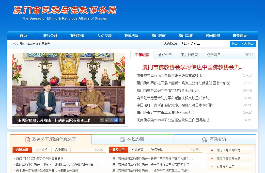 根據(jù)《中共福建省委辦公廳、省人民政府辦公廳關(guān)于印發(fā)〈廈門市人民政府機構(gòu)改革方案〉的通知》(閩委辦〔2010〕87號)和《中共廈門市委、廈門市人民政府關(guān)于廈門市人民政府機構(gòu)改革的實施意見》(廈委〔2010〕40號)文件精神,設(shè)立廈門市民族與宗教事務(wù)局,為市人民政府工作部門,副廳級。其主要職責:(一)貫徹執(zhí)行黨和國家有關(guān)民族、宗教工作的法律法規(guī)和方針政策,組織民族、宗教政策理論和民族、宗教工作重大問題以及難點、熱點問題的調(diào)查研究,提出有關(guān)政策建議。(二)擬訂民族、宗教的地方性法規(guī)、規(guī)章和有關(guān)民族、宗教工作的具體政策,組織、指導(dǎo)民族、宗教政策和法律法規(guī)規(guī)章的宣傳教育工作,負責對全市政府系統(tǒng)民族、宗教工作的業(yè)務(wù)指導(dǎo);組織實施和監(jiān)督檢查民族、宗教法律法規(guī)規(guī)章和政策的貫徹執(zhí)行,協(xié)調(diào)處理民族關(guān)系中的重大事項,促進民族和睦、宗教和諧,保障和維護少數(shù)民族、宗教界合法權(quán)益。(三)負責協(xié)調(diào)推動有關(guān)部門履行民族工作相關(guān)職責,協(xié)調(diào)開展民族團結(jié)進步宣傳教育活動,研究提出協(xié)調(diào)民族關(guān)系的工作建議,促進各民族共同團結(jié)奮斗、共同繁榮發(fā)展。(四)研究分析民族工作方面的問題并提出政策措施建議,協(xié)調(diào)完善城市民族工作配套設(shè)施,聯(lián)系民族社區(qū),協(xié)調(diào)聯(lián)系對口幫扶民族地區(qū)相關(guān)事宜,協(xié)調(diào)、配合有關(guān)部門處理相關(guān)事宜。(五)依法管理宗教事務(wù),依法保護公民宗教信仰自由和正常的宗教活動。指導(dǎo)各區(qū)政府宗教事務(wù)部門依法履行職能、處理宗教事務(wù)重大事件,防范利用宗教進行的非法、違法活動,抵御境外利用宗教進行的滲透活動,指導(dǎo)和幫助宗教界開展對外及對港澳臺地區(qū)的宗教交往活動。(六)指導(dǎo)宗教團體依法依章開展活動,加強自身建設(shè),培養(yǎng)、培訓(xùn)宗教教職人員,辦好宗教院校,引導(dǎo)宗教界開展與社會主義社會相適應(yīng)的各項活動,發(fā)揮宗教界和信教群眾在促進經(jīng)濟社會發(fā)展方面的積極作用。(七)依法依章管理民間信仰活動及場所,對涉及民間信仰的重大問題進行調(diào)研并提出建議,協(xié)助各區(qū)政府及時處理民間信仰方面的重大問題,指導(dǎo)基層民族宗教事務(wù)部門做好民間信仰活動的管理工作。(八)負責聯(lián)系少數(shù)民族干部和宗教界人士,協(xié)助有關(guān)部門做好少數(shù)民族干部的培養(yǎng)、選拔和使用工作。(九)承辦市委、市政府交辦的其他事項。