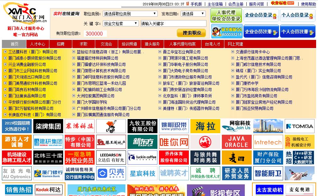 “廈門人才網(wǎng)”由廈門市人才服務(wù)中心(廈門市人事人才公共服務(wù)中心)全資主辦,研發(fā)于上世紀(jì)末, 開通于2000年初。秉承“誠信為上,服務(wù)為本”之理念,以服務(wù)企業(yè)、服務(wù)人才、服務(wù)發(fā)展為使命,堅(jiān)持專業(yè)化、區(qū)域化、品牌化的發(fā)展戰(zhàn)略,整合人才中心、人才市場、人才網(wǎng)優(yōu)勢資源,歷經(jīng)十余年的專心運(yùn)營和精心磨礪,“廈門人才網(wǎng)”已成為實(shí)效突出、品牌卓著、影響廣泛的強(qiáng)有力的人才交流網(wǎng)絡(luò)平臺(tái)。廈門人才網(wǎng)服務(wù)8萬家企業(yè),每天在線存量職位約27萬個(gè),人才庫保有210萬份簡歷,日均頁面瀏覽量400萬PV,各項(xiàng)指標(biāo)位居全國政府人才網(wǎng)站前茅,是中國知名的區(qū)域性人才招聘網(wǎng)站,被譽(yù)為“不落幕的人才交流會(huì)”。廈門市人才服務(wù)中心(廈門市人事人才公共服務(wù)中心)是廈門人力資源和社會(huì)保障局(廈門市公務(wù)員局)所屬事業(yè)單位,是以人才交流、人事代理兩大業(yè)務(wù)體系為主體,以人才交流會(huì)、人事代理服務(wù)、人才網(wǎng)信息服務(wù)、人才流動(dòng)黨員黨建工作為支撐,以傾力打造全方位、多層次、功能齊備的人才服務(wù)體系為目標(biāo),融人才培訓(xùn)、人才派遣、境外人才交流等多種新興業(yè)務(wù)為一體的專業(yè)化、社會(huì)化、信息化、品牌化人才服務(wù)機(jī)構(gòu),每年舉辦交流會(huì)200余場,為3萬多家次用人單位及約百萬人次人才提供供需見面、雙向選擇交流服務(wù);廈門人才網(wǎng)每天在線存量職位約24萬個(gè)(高峰期達(dá)28萬余個(gè));服務(wù)人事代理單位2.1萬余家,代理人員近17萬人,保管各類人才檔案約24萬卷;人才派遣單位達(dá)362家,管理派遣員工約6000人;年均辦理學(xué)歷認(rèn)證近萬份,人才、社會(huì)、經(jīng)濟(jì)效益等綜合成效位居國內(nèi)同行前列,成為區(qū)域內(nèi)人才交流主陣地、人才供需信息發(fā)布主源頭、公共(益)服務(wù)主渠道、人事社會(huì)化綜合服務(wù)主平臺(tái)。近年來,中組部、國家人社部、國家監(jiān)察部以及省市相關(guān)領(lǐng)導(dǎo)多次蒞臨中心視察調(diào)研,并給予積極評價(jià)。中心榮獲“國家人社部首屆優(yōu)質(zhì)服務(wù)窗口”、“福建省創(chuàng)先爭優(yōu)先進(jìn)基層黨組”、“全省中介機(jī)構(gòu)誠信建設(shè)示范點(diǎn)”、“省人事系統(tǒng)先進(jìn)集體”、“市青年文明號”、“廈門市文明單位”等殊榮。
