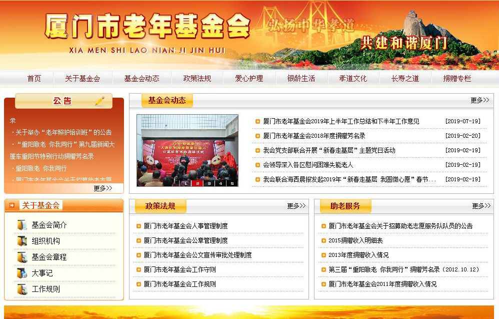 廈門市老年基金會成立于1992年8月,是福建省第一家注冊登記,為老年人服務的公募基金會。創(chuàng)會會長是廈門市政協(xié)原主席林源。基金會的宗旨是,弘揚中華民族敬老、愛老、助老的傳統(tǒng)美德,動員社會各界和海內(nèi)外人士募集資金,資助舉辦老年福利事業(yè)。協(xié)助黨委政府促進我市老齡事業(yè)的發(fā)展。主要業(yè)務范圍;(一)宣傳人口老齡化的形勢,動員社會各界關心老年人、幫助老年人;(二)組織開展各種形式的募捐活動,接受國內(nèi)外企事業(yè)單位、團體、個人及其他組織的捐贈,不斷壯大基金規(guī)模,發(fā)展老齡公益事業(yè);(三)管理和使用基金,開展基金保值增值業(yè)務;(四)投資、創(chuàng)辦和資助各種老年社會福利、文化、教育、體育、衛(wèi)生事業(yè)等項目;(五)獎勵為發(fā)展老齡事業(yè)做出杰出貢獻的團體和個人、老年杰出人物和優(yōu)秀人才;(六)資助城鄉(xiāng)特困老年人;(七)組織和資助開展有益于提高老人生活、生命質(zhì)量的各種活動;(八)開展與港、澳、臺同胞,國內(nèi)外友好團體和人士及相關國際組織的合作和交流活動?;饡猿闪⒁詠?,在福建省民政廳和主管部門省老齡辦的指導下,在一批老領導老同志的關懷和社會各界的大力支持下,在歷屆理事會的領導下,遵循基金會的宗旨,通過政府財政資助,社會各界捐贈、基金增值等方式,籌集了一定數(shù)量的資金,并利用籌集的資金為老年人辦實事、辦好事。2006年榮獲“八閩慈善獎”;2009年榮獲福建省第一批“5A基金會”稱號。創(chuàng)立“助老工程”品牌。從啟動至2010年底,共助養(yǎng)特困老人3733人次;幫助患白內(nèi)障的664位特困老人恢復光明;對身患重病、因病致困、急需救助的老年人及時開展救助,截止2011年6月10日,共救急困難老人133人次,發(fā)放救急配套費30多萬元。開設“溫馨夕陽老人談心熱線”和咨詢中心,招募老醫(yī)學專家、律師志愿者,為老年人提供法律、醫(yī)療、精神和生活等方面的服務。此外,每年春節(jié)老年節(jié)組織送溫暖活動,慰問困難老人和高齡老人達12000多人次。該活動自開展以來累計支出資金900多萬元?!爸瞎こ獭表椖勘蝗罕娮u名為“銀色希望工程”。大力弘揚敬老傳統(tǒng)美德。2010年老年節(jié),基金會與《廈門日報》、市委文明辦等共同發(fā)起了新聞大篷車重陽節(jié)特別行動-“重陽敬老,你我同行”宣傳活動,廣泛宣傳愛心企業(yè)和人士敬老助老的感人事跡,積極營造全社會都來關心老齡慈善事業(yè)的社會氛圍。短短10天就有45家單位和個人為老人慈善捐款116萬多元。資助市老齡辦舉辦的二年一屆的“十佳敬老家庭”評選活動,倡導全社會尊重家中長輩,關心幫助其他老人,并以“十佳敬老家庭”的行動帶動更多的家庭一起尊老、敬老、愛老、助老,促進社會和諧;舉辦孝道文化專題講座,并出版《新輯二十四孝義》。我會編印《新輯二十四孝義》一書,向全市機關、學校、企事業(yè)單位、城鄉(xiāng)各基層組織和愛心人士贈送8000余冊。創(chuàng)建市愛心護理院。隨著我國老齡化社會的形成,老年人特別是高齡有病的老年人缺乏專業(yè)護理,老人護理成為一個廣為關注、亟待解決的社會問題。2005年,經(jīng)市政府批準,基金會向社會募捐,在仙岳山南麓興建廈門市愛心護理院,市愛心護理院占地面積3400平方米,建筑面積1.18萬平方米,總投資3800多萬元,設計300張床位,具備醫(yī)療護理、生活照料、康復保健、心理護理、休閑娛樂、膳食服務和臨終關懷等功能。本著“幫天下兒女盡孝,給世上父母解難,為黨和政府分憂”的宗旨,市愛心護理院主要接納需要提供半護理、全護理服務的老年人。市愛心護理院的建成,成為了全市中具有示范作用的養(yǎng)老服務機構(gòu),并先后被中國老齡事業(yè)發(fā)展基金會、福建省老齡事業(yè)發(fā)展基金會確定為全國、省“愛心護理工程”試點單位。2009年10月,中國老齡事業(yè)發(fā)展基金會批復廈門市愛心護理院為“全國愛心護理工程建設基地”,為推動我市老年護理事業(yè)的發(fā)展做出了貢獻,資助老年文化體育活動。為滿足和豐富老年人的精神文化生活,提高老年人生活幸福指數(shù),基金會在省、市老齡辦的指導下,積極參與和資助涉老組織開展各項文化、體育活動?;饡闪⒁詠恚矒艹?07.09萬元資助市老年體育協(xié)會、市老年學學會、市老年大學、市老朋友藝術團、市老年藝術協(xié)會、市老年交誼舞協(xié)會、市老年戰(zhàn)士合唱團、市老干部集郵協(xié)會、市老年書畫研究會等老年組織開展豐富多彩的文化、體育、作品展示、“健康大講堂”和學術研討等活動。與此同時,撥出226.22萬元資助基層老年活動場所的建設,為部分有困難的基層老年活動場所配置文體活動器材,改善活動條件。廈門市老年基金會是個很有作為的組織。面對老齡化社會,基金會將在廈門市委、市政府和主管部門的領導下,堅持基金會的宗旨,進一步解放思想,轉(zhuǎn)變觀念,創(chuàng)新工作方法,不斷提高管理和服務水平,為老齡事業(yè)發(fā)展做出更大的貢獻。基金會向多年來熱心贊助和關心我市老年福利事業(yè)的單位和個人致以崇高敬意和表示衷心感謝!