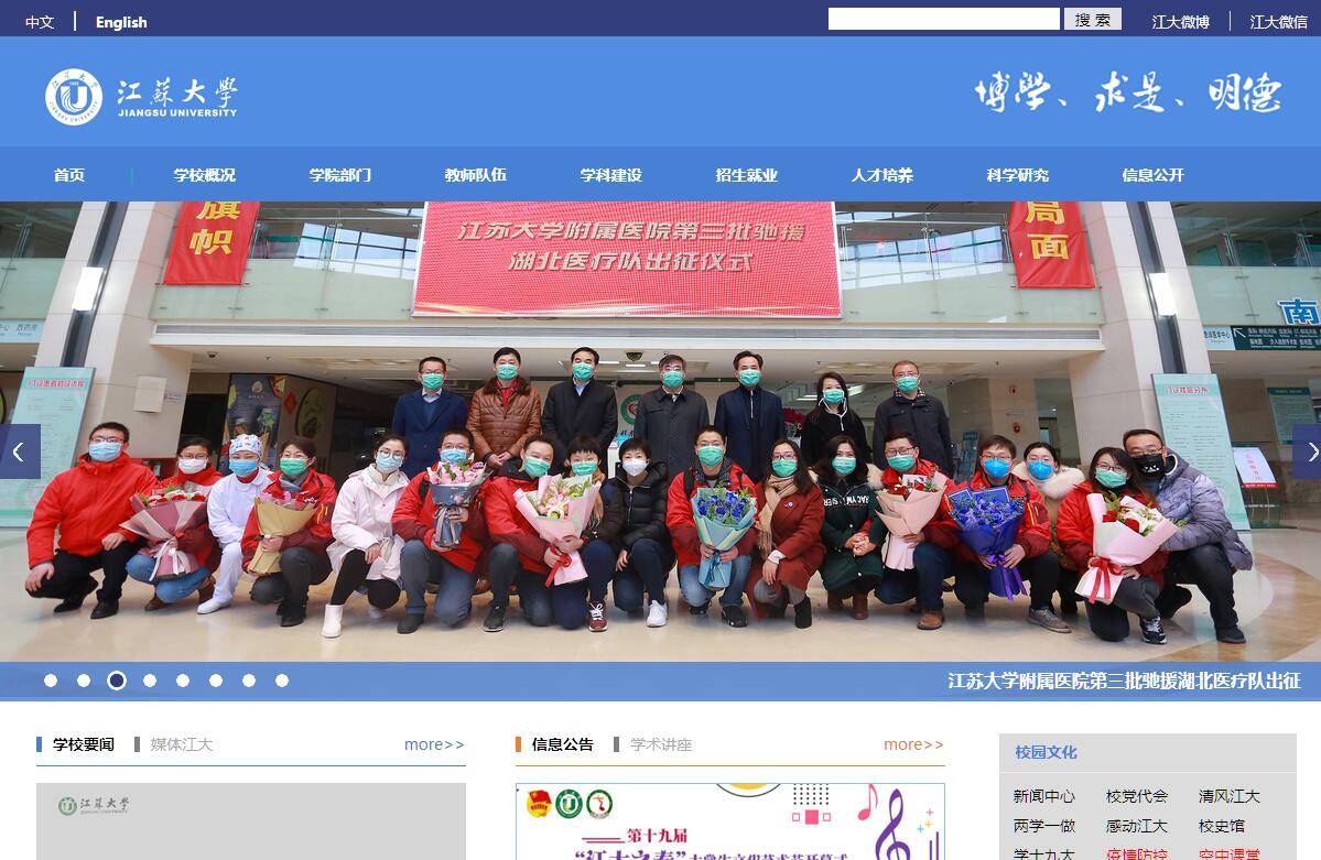 江蘇大學(xué)坐落在素有“天下第一江山”美譽的國家歷史文化名城——江蘇省鎮(zhèn)江市。學(xué)校是2001年8月經(jīng)教育部批準(zhǔn),由原江蘇理工大學(xué)、鎮(zhèn)江醫(yī)學(xué)院、鎮(zhèn)江師范??茖W(xué)校合并組建的重點綜合性大學(xué),是江蘇省人民政府和農(nóng)業(yè)農(nóng)村部共建高校、首批江蘇省高水平大學(xué)建設(shè)高校、全國本科教學(xué)工作水平優(yōu)秀高校、首批全國50所畢業(yè)生就業(yè)典型經(jīng)驗高校、全國創(chuàng)新創(chuàng)業(yè)典型經(jīng)驗高校和首批全國來華留學(xué)生質(zhì)量認(rèn)證高校。學(xué)校具有百年辦學(xué)歷史,文化底蘊深厚。原江蘇理工大學(xué)的前身鎮(zhèn)江農(nóng)業(yè)機械學(xué)院,是為貫徹毛澤東同志關(guān)于“農(nóng)業(yè)的根本出路在于機械化”的重要指示,1960年由南京工學(xué)院(現(xiàn)東南大學(xué))分設(shè)獨立建校的,辦學(xué)歷史可追溯到1902年劉坤一、張之洞等在南京創(chuàng)辦的三江師范學(xué)堂。學(xué)校作為國內(nèi)最早設(shè)立農(nóng)機專業(yè)、最早系統(tǒng)開展農(nóng)機教育的高校,堅持立足江蘇、服務(wù)行業(yè),始終以推動我國農(nóng)業(yè)機械化、現(xiàn)代化為使命,培養(yǎng)了我國第一批農(nóng)機本科、碩士和第一位農(nóng)機博士、博士后,為我國農(nóng)業(yè)裝備人才培養(yǎng)、科技創(chuàng)新,為推動農(nóng)民增收、農(nóng)業(yè)發(fā)展和農(nóng)村穩(wěn)定作出了積極的貢獻,形成了“工中有農(nóng),以工支農(nóng)”的鮮明辦學(xué)特色和獨特的文化情懷。學(xué)校辦學(xué)起點較高,綜合實力一直位居全國百強之列。早在1978年,學(xué)校就被國務(wù)院確定為全國88所重點大學(xué)之一,1981年成為全國首批具有博士、碩士、學(xué)士學(xué)位授予權(quán)的高校。近年來,學(xué)校聚焦內(nèi)涵發(fā)展,深入實施“高水平、有特色、國際化”發(fā)展戰(zhàn)略,國內(nèi)外辦學(xué)影響進一步擴大。THE、USNews、ARWU等國際權(quán)威世界大學(xué)排名,學(xué)校均躋身top1000?!?018中國大學(xué)評價》,學(xué)校綜合排名列全國第39位。學(xué)校辦學(xué)規(guī)模較大,辦學(xué)條件優(yōu)良。學(xué)科涵蓋工學(xué)、理學(xué)、醫(yī)學(xué)、管理學(xué)、經(jīng)濟學(xué)、哲學(xué)、法學(xué)、文學(xué)、教育學(xué)、歷史學(xué)、藝術(shù)學(xué)等11大學(xué)科門類。設(shè)有25個學(xué)院,89個本科專業(yè)。專任教師2550人(具有海外經(jīng)歷的比例達25%),集聚了一批以院士、“長江學(xué)者”、“千人計劃”、“國家杰青”、“萬人計劃”等為代表的高層次人才群體。在校生36000余人,其中全日制本科生23000余人,研究生12000余人,學(xué)歷留學(xué)生1800余人。江蘇大學(xué)京江學(xué)院全日制在校生近10000人。校園占地面積3000余畝,各類建筑面積120萬余平方米。教學(xué)科研儀器設(shè)備總值9.8億元。圖書館建筑面積5.1萬平方米,藏書305萬冊,訂閱各類數(shù)據(jù)庫113個,自建特色數(shù)據(jù)庫9個,建有教育部科技查新工作站和國際賽珍珠文獻資源中心。擁有一所集醫(yī)療、教育、科研、預(yù)防為一體的三級甲等附屬醫(yī)院。設(shè)有江蘇大學(xué)出版社和雜志社,出版圖書1500余種,辦有國際、國內(nèi)學(xué)術(shù)期刊11種,其中《江蘇大學(xué)學(xué)報》(自然科學(xué)版)、《排灌機械工程學(xué)報》、《高校教育管理》為全國中文核心期刊,《高校教育管理》、《江蘇大學(xué)學(xué)報》(社會科學(xué)版)分別為CSSCI來源期刊和擴展版來源期刊。學(xué)校辦學(xué)水平較高,擁有一批高水平學(xué)科。工程學(xué)、材料科學(xué)、臨床醫(yī)學(xué)、化學(xué)和農(nóng)業(yè)科學(xué)5個學(xué)科進入ESI排名全球前1%,ESI綜合排名列全國第56位。擁有2個國家重點學(xué)科,1個國家重點(培育)學(xué)科,6個江蘇高校優(yōu)勢學(xué)科,7個江蘇省“十三五”一級重點學(xué)科,2個江蘇省“十三五”一級重點(培育)學(xué)科。擁有14個一級學(xué)科博士點,44個一級學(xué)科碩士點,12個碩士專業(yè)學(xué)位類別,26個工程碩士授權(quán)領(lǐng)域。設(shè)有13個博士后科研流動站。學(xué)校堅持以學(xué)為中心、教為主體,不斷提升人才培養(yǎng)質(zhì)量。近年來,學(xué)校獲國家級教學(xué)成果獎5項,形成了一批以國家特色專業(yè)、國家級精品課程、國家精品視頻公開課、國家精品資源共享課、國家實驗教學(xué)示范中心、國家優(yōu)秀教學(xué)團隊為代表的優(yōu)質(zhì)教學(xué)資源;畢業(yè)生就業(yè)率一直保持在96%以上;學(xué)生在全國大學(xué)生重大賽事中表現(xiàn)搶眼,“挑戰(zhàn)杯”全國大學(xué)生課外學(xué)術(shù)科技作品競賽連續(xù)6屆喜捧“優(yōu)勝杯”,全國大學(xué)生創(chuàng)業(yè)計劃大賽連續(xù)4屆獲得雙金獎,校大學(xué)生男子排球隊屢獲全國冠軍,女子沙灘排球隊獲世界大學(xué)生運動會第7名,女子足球隊獲世界大學(xué)生“五人制”足球錦標(biāo)賽季軍。學(xué)校堅持以貢獻謀發(fā)展,不斷提升科技創(chuàng)新與服務(wù)社會能力?!笆濉币詠恚瑢W(xué)校獲批國家自然基金項目344項(連續(xù)5年居全國高校前50位),國家社科基金項目18項。截至目前,學(xué)