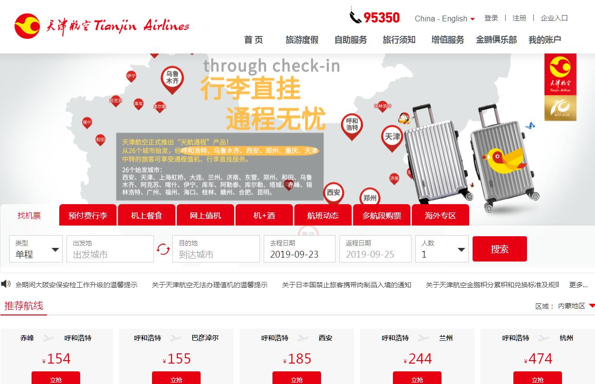 天津航空有限責(zé)任公司(簡(jiǎn)稱“天津航空”)是世界500強(qiáng)海航集團(tuán)的成員企業(yè),于2009年6月8日掛牌成立,由海南航空和天津市政府共同出資組建,扎根環(huán)渤海地區(qū)經(jīng)濟(jì)中心的天津市。心之所想,天航所往。天津航空秉承“從你出發(fā)、親近世界”的品牌定位,致力于提供便捷實(shí)用的產(chǎn)品和服務(wù),以善解人意、熱愛(ài)生活的態(tài)度與旅客共同創(chuàng)造美好的旅行體驗(yàn),讓世界更親近。目前,天津航空擁有以A330、A320、E190等機(jī)型為主的年輕豪華機(jī)隊(duì),總機(jī)隊(duì)規(guī)模近100架,逐步建立起包含天津、西安、呼和浩特、烏魯木齊、貴陽(yáng)等10大樞紐的區(qū)域航線網(wǎng)絡(luò),累計(jì)開(kāi)通國(guó)際國(guó)內(nèi)航線270余條,擁有超過(guò)40條國(guó)際航線,航線網(wǎng)絡(luò)遍布全國(guó),連接日本、韓國(guó)、俄羅斯、泰國(guó)等周邊國(guó)家和地區(qū),直飛英國(guó)、新西蘭、澳大利亞,通航城市130余座,2017年旅客運(yùn)輸量達(dá)到1300余萬(wàn)人次。2017年,天津航空新開(kāi)通天津=重慶=墨爾本、天津=西安=奧克蘭、天津=鄭州=悉尼等洲際航線,進(jìn)一步豐富國(guó)際航線網(wǎng)絡(luò),國(guó)際化轉(zhuǎn)型步伐加快。新時(shí)期,天津航空不斷開(kāi)通、健全覆蓋更多大中型城市的中遠(yuǎn)程航線網(wǎng)絡(luò),構(gòu)建國(guó)內(nèi)國(guó)際航線網(wǎng)絡(luò)布局,滿足人們多元出行需求,打造具備區(qū)域主導(dǎo)競(jìng)爭(zhēng)優(yōu)勢(shì)和一定國(guó)際影響力的航空公司。天津航空官方網(wǎng)站:www.tianjin-air.com,24小時(shí)客戶服務(wù)熱線:95350。