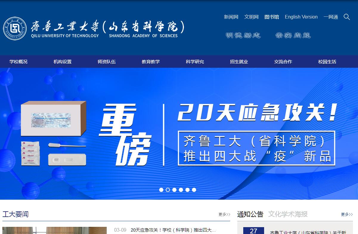 齊魯工業(yè)大學(xué)(山東省科學(xué)院)坐落于國(guó)家歷史文化名城——泉城濟(jì)南,是山東省重點(diǎn)建設(shè)的應(yīng)用研究型大學(xué),同時(shí)也是山東省最大的綜合性自然科學(xué)研究機(jī)構(gòu)。學(xué)校(科學(xué)院)于2017年5月由齊魯工業(yè)大學(xué)和山東省科學(xué)院整合組建而成。齊魯工業(yè)大學(xué)的歷史可追溯到1948年由解放軍膠東軍區(qū)成立的膠東工業(yè)學(xué)校。1978年至2013年為山東輕工業(yè)學(xué)院時(shí)期,2013年更名為齊魯工業(yè)大學(xué),是國(guó)家“產(chǎn)教融合”項(xiàng)目首批建設(shè)高校、山東省首批應(yīng)用型人才培養(yǎng)特色名校、山東省高校協(xié)同創(chuàng)新中心首批立項(xiàng)建設(shè)單位。山東省科學(xué)院前身為始建于1958年的中國(guó)科學(xué)院山東分院,1979年更名為山東省科學(xué)院,是山東省政府直屬事業(yè)單位。新的齊魯工業(yè)大學(xué)(山東省科學(xué)院)匯聚山東省優(yōu)質(zhì)科教資源,實(shí)行校院合一的管理體制,打造科教融合優(yōu)勢(shì)特色,是山東省新型工業(yè)科技創(chuàng)新及人才培養(yǎng)領(lǐng)域的重要力量。學(xué)校(科學(xué)院)占地面積3745畝,現(xiàn)有長(zhǎng)清、彩石、歷城、歷下、菏澤5個(gè)校區(qū),在濟(jì)南、青島、濟(jì)寧、臨沂、菏澤等地設(shè)有研究機(jī)構(gòu),主校區(qū)在濟(jì)南長(zhǎng)清大學(xué)科技園。學(xué)校(科學(xué)院)擁有完善的現(xiàn)代化教學(xué)基礎(chǔ)設(shè)施和實(shí)驗(yàn)設(shè)備。有省部級(jí)以上重點(diǎn)學(xué)科及研究平臺(tái)113個(gè),其中省部共建國(guó)家重點(diǎn)實(shí)驗(yàn)室1個(gè)、省部共建國(guó)家地方聯(lián)合工程實(shí)驗(yàn)室1個(gè)、國(guó)家工程技術(shù)研究中心1個(gè)、國(guó)家超級(jí)計(jì)算濟(jì)南中心1個(gè)、教育部重點(diǎn)實(shí)驗(yàn)室1個(gè)、國(guó)際科技合作基地3個(gè)、國(guó)家產(chǎn)業(yè)技術(shù)創(chuàng)新戰(zhàn)略聯(lián)盟1個(gè)、省級(jí)協(xié)同創(chuàng)新中心2個(gè)、省級(jí)重點(diǎn)學(xué)科9個(gè)、省級(jí)重點(diǎn)實(shí)驗(yàn)室17個(gè)、省級(jí)工程實(shí)驗(yàn)室9個(gè)、省工程技術(shù)研究中心23個(gè)、省級(jí)高校重點(diǎn)實(shí)驗(yàn)室5個(gè)、省產(chǎn)業(yè)技術(shù)創(chuàng)新戰(zhàn)略聯(lián)盟5個(gè)、省國(guó)際合作研究中心6個(gè),省級(jí)社科基地(中心)3個(gè);有省級(jí)實(shí)驗(yàn)教學(xué)示范中心3個(gè),省級(jí)人才培養(yǎng)模式創(chuàng)新實(shí)驗(yàn)區(qū)1個(gè),智能制造省級(jí)新舊動(dòng)能轉(zhuǎn)換實(shí)訓(xùn)基地等學(xué)生實(shí)踐教學(xué)和實(shí)訓(xùn)基地408個(gè)。校舍建筑總面積123萬(wàn)平方米,教學(xué)科研設(shè)備總值10.5億元,圖書館藏書259萬(wàn)冊(cè),電子圖書239萬(wàn)冊(cè)。建有山東教育科研網(wǎng)大學(xué)科技園網(wǎng)絡(luò)節(jié)點(diǎn)和覆蓋全校的千兆以太計(jì)算機(jī)網(wǎng)絡(luò),科學(xué)與藝術(shù)深度融合的齊魯陶瓷玻璃博物館,校園環(huán)境優(yōu)美寧?kù)o,人文藝術(shù)氣息濃郁,為“省級(jí)園林化校園示范單位”。學(xué)校(科學(xué)院)現(xiàn)有專任教師2005人,其中副高級(jí)以上專業(yè)技術(shù)職務(wù)人員946人,具有博士學(xué)位的1002人。有“雙聘”院士(含外籍院士)7人,國(guó)家千人計(jì)劃項(xiàng)目入選者7人,國(guó)家萬(wàn)人計(jì)劃2人,國(guó)家百千萬(wàn)人才工程4人,國(guó)家有突出貢獻(xiàn)的中青年專家1人,中央聯(lián)系專家1人,全國(guó)優(yōu)秀科技工作者1人,泰山學(xué)者攀登計(jì)劃專家1人,泰山學(xué)者特聘教授、海外特聘專家34人,泰山學(xué)者青年專家3人,泰山產(chǎn)業(yè)領(lǐng)軍人才3人。教育部新世紀(jì)優(yōu)秀人才支持計(jì)劃3人,科技部中青年科技創(chuàng)新領(lǐng)軍人才2人,山東省有突出貢獻(xiàn)的中青年專家32人,山東省高端智庫(kù)專家7人,享受國(guó)務(wù)院政府特殊津貼專家22人,全國(guó)師德標(biāo)兵1人,全國(guó)優(yōu)秀教師1人,山東省教學(xué)名師4人。在職在崗的各類省部級(jí)以上高層次人才148人次。學(xué)校(科學(xué)院)現(xiàn)有全日制在校本科生、研究生、留學(xué)生3萬(wàn)余人。設(shè)2個(gè)學(xué)部,20個(gè)教學(xué)單位,12家創(chuàng)新研究機(jī)構(gòu)。共有9個(gè)省部級(jí)重點(diǎn)學(xué)科,14個(gè)碩士學(xué)位授權(quán)一級(jí)學(xué)科,93個(gè)碩士學(xué)位授權(quán)二級(jí)學(xué)科,9個(gè)工程碩士專業(yè)學(xué)位授權(quán)領(lǐng)域,3個(gè)藝術(shù)碩士專業(yè)學(xué)位授權(quán)領(lǐng)域,2個(gè)翻譯碩士專業(yè)學(xué)位授權(quán)領(lǐng)域,1個(gè)金融碩士專業(yè)學(xué)位授權(quán)領(lǐng)域,75個(gè)本科專業(yè)。學(xué)科專業(yè)涵蓋工學(xué)、理學(xué)、文學(xué)、經(jīng)濟(jì)學(xué)、管理學(xué)、法學(xué)、醫(yī)學(xué)和藝術(shù)學(xué)等8個(gè)門類,化學(xué)、工程學(xué)兩個(gè)學(xué)科進(jìn)入ESI世界學(xué)術(shù)機(jī)構(gòu)排名前1%,材料科學(xué)接近前1%。學(xué)校(科學(xué)院)是教育部本科教學(xué)工作水平評(píng)估優(yōu)秀學(xué)校。辦學(xué)70年來(lái),累計(jì)為社會(