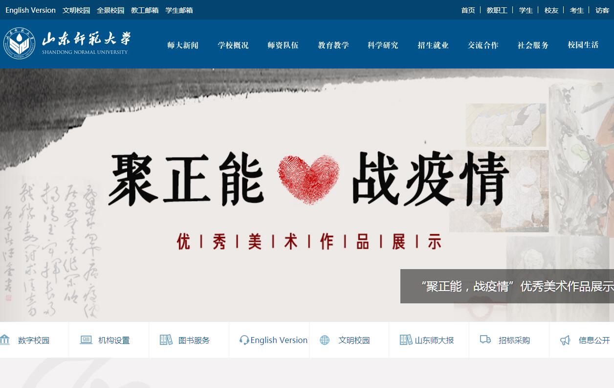 山東師范大學(xué)坐落在歷史文化名城濟(jì)南。建校68年來,學(xué)校植根齊魯文化沃土,汲取泉城人文靈韻,秉承“尊賢尚功、奮發(fā)有為”的校園精神和“弘德明志、博學(xué)篤行”的校訓(xùn),自覺傳承創(chuàng)新齊魯文化,努力彰顯教師教育特色,目前已發(fā)展成為一所學(xué)科專業(yè)齊全、學(xué)位體系完備、師資人才充沛、社會(huì)聲譽(yù)優(yōu)良的綜合性高等師范院校。學(xué)校辦學(xué)歷史可追溯到1902年山東大學(xué)堂內(nèi)設(shè)師范館。1950年10月,在原華東大學(xué)教育學(xué)院和山東省行政干校的基礎(chǔ)上組建山東師范學(xué)院,系新中國(guó)成立后山東省成立最早的本科高校。1952年原齊魯大學(xué)物理、化學(xué)、生物三系并入。1970年9月,學(xué)校機(jī)關(guān)及部分系部遷到聊城辦學(xué)。1974年4月,遷回濟(jì)南。1981年3月,學(xué)校被確定為省屬重點(diǎn)高等學(xué)校;同年8月,更名為山東師范大學(xué)。2012年11月,學(xué)校被確定為山東省首批重點(diǎn)建設(shè)應(yīng)用基礎(chǔ)型人才培養(yǎng)特色名校。2014年3月,學(xué)校被批準(zhǔn)為山東省和教育部共建高校。2017年11月,學(xué)校獲評(píng)第一屆全國(guó)文明校園。目前,學(xué)校在歷下區(qū)和長(zhǎng)清區(qū)兩地辦學(xué),總占地面積近4000畝(約258.78萬平方米),建筑面積137.98萬平方米。設(shè)有1個(gè)國(guó)家級(jí)虛擬仿真實(shí)驗(yàn)教學(xué)中心、1個(gè)國(guó)家級(jí)實(shí)驗(yàn)教學(xué)示范中心、1個(gè)教育部重點(diǎn)實(shí)驗(yàn)室、1個(gè)教育部工程研究中心、1個(gè)教育部人文社科重點(diǎn)研究基地、6個(gè)山東省重點(diǎn)實(shí)驗(yàn)室、1個(gè)山東省工程實(shí)驗(yàn)室、5個(gè)山東省工程技術(shù)研究中心、2個(gè)山東省理論建設(shè)重點(diǎn)研究基地、1個(gè)山東省重點(diǎn)新型智庫(kù)、4個(gè)山東省高等學(xué)校協(xié)同創(chuàng)新中心、7個(gè)省高等學(xué)校實(shí)驗(yàn)教學(xué)示范中心、9個(gè)山東省“十三五”高等學(xué)??蒲袆?chuàng)新平臺(tái)等52個(gè)國(guó)家級(jí)省部級(jí)以上研究培訓(xùn)機(jī)構(gòu)。圖書館館藏書刊437.72萬冊(cè),數(shù)字資源量63TB。現(xiàn)有25個(gè)學(xué)院(部),84個(gè)本科專業(yè),9個(gè)博士后科研流動(dòng)站,14個(gè)博士學(xué)位授權(quán)一級(jí)學(xué)科、33個(gè)碩士學(xué)位授權(quán)一級(jí)學(xué)科、16個(gè)專業(yè)學(xué)位授權(quán)類別,覆蓋十大學(xué)科門類,學(xué)科、專業(yè)學(xué)位數(shù)量居省屬高校前列。有1個(gè)國(guó)家重點(diǎn)學(xué)科、1個(gè)國(guó)家重點(diǎn)(培育)學(xué)科。有4個(gè)學(xué)科進(jìn)入山東省一流學(xué)科立項(xiàng)建設(shè)行列,3個(gè)專業(yè)(群)獲批山東省高水平應(yīng)用型立項(xiàng)建設(shè)重點(diǎn)專業(yè)(群),1個(gè)學(xué)科進(jìn)入基本科學(xué)指標(biāo)數(shù)據(jù)庫(kù)(ESI)學(xué)科排名前1%。在全國(guó)第四輪學(xué)科評(píng)估(2017年)中,24個(gè)學(xué)科參評(píng),其中有13個(gè)學(xué)科進(jìn)入B及以上等次,是山東省屬高校最好成績(jī)。目前,有全日制學(xué)生37724人,其中本科生31699人、研究生5309人、留學(xué)生267人,另有成人教育學(xué)生15550人。學(xué)校成立基礎(chǔ)教育集團(tuán),附屬中學(xué)、第二附屬中學(xué)、附屬小學(xué)是省級(jí)規(guī)范化學(xué)?;蚴痉秾W(xué)校,先后分別被授予中國(guó)百?gòu)?qiáng)中學(xué)、全國(guó)十佳科技教育創(chuàng)新學(xué)校、首批全國(guó)心理健康教育特色學(xué)校、全國(guó)首批青少年校園足(籃)球特色學(xué)校等稱號(hào)。山東師范大學(xué)歷山學(xué)院是2005年經(jīng)教育部和山東省人民政府批準(zhǔn)設(shè)立的全日制普通本科獨(dú)立學(xué)院,2013年遷址青州市辦學(xué),現(xiàn)有學(xué)生8966人,教職工343人,開設(shè)48個(gè)本??茖I(yè),培養(yǎng)10屆畢業(yè)生8000余人,贏得良好社會(huì)聲譽(yù)。承擔(dān)教育部“質(zhì)量工程”全部類別項(xiàng)目,4人獲國(guó)家級(jí)教學(xué)名師獎(jiǎng),獲國(guó)家級(jí)教學(xué)成果獎(jiǎng)14項(xiàng),建成國(guó)家級(jí)教學(xué)團(tuán)隊(duì)2個(gè)、國(guó)家級(jí)專業(yè)綜合改革試點(diǎn)項(xiàng)目1個(gè)、國(guó)家級(jí)特色專業(yè)建設(shè)點(diǎn)9個(gè)、國(guó)家級(jí)精品課程4門、國(guó)家級(jí)精品資源共享課4門、國(guó)家級(jí)雙語教學(xué)示范課程1門、國(guó)家級(jí)人才培養(yǎng)模式創(chuàng)新試驗(yàn)區(qū)1個(gè)、國(guó)家級(jí)大學(xué)生校外實(shí)踐教育基地1個(gè)、國(guó)家“十二五”規(guī)劃教材6部,國(guó)家級(jí)大學(xué)生創(chuàng)新創(chuàng)業(yè)訓(xùn)練計(jì)劃項(xiàng)目834項(xiàng)。是全省最早承擔(dān)“國(guó)培計(jì)劃”的高校,獲全國(guó)普通高等學(xué)校招生工作先進(jìn)單位、全國(guó)普通高校畢業(yè)生就業(yè)工作先進(jìn)集體、教育部首批創(chuàng)新創(chuàng)業(yè)示范性高校、教育部卓越中學(xué)教師培養(yǎng)計(jì)劃實(shí)施院校等榮譽(yù)稱號(hào)。連續(xù)兩年榮獲全國(guó)“互聯(lián)網(wǎng)+”大學(xué)生創(chuàng)新創(chuàng)業(yè)大賽金獎(jiǎng)及先進(jìn)集體獎(jiǎng)