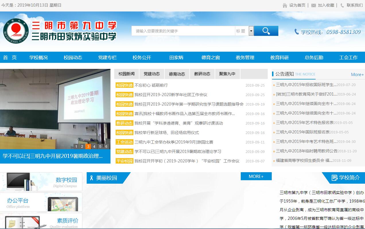 三明市第九中學(三明市田家炳實驗中學)創(chuàng)辦于1959年,前身是三明化工總廠中學,1998年6月從企業(yè)剝離,成為三明市教育局直屬的高級中學,2006年5月被省教育廳確認為省一級達標中學(我省第一所躋身省一級達標中學的企業(yè)剝離學校)。2006年11月由香港著名實業(yè)家田家炳先生慷慨捐資,經(jīng)市教育局同意,被命名為“三明市田家炳實驗中學”。學校現(xiàn)有39個教學班,學生1900多人,教職工169名,特級教師2人,高級教師62人,省市學科帶頭人、教壇新秀、骨干教師27人。2018年3月,學校被確立為省首批示范高中建設(shè)學校。近年來,學校獲得了全國美術(shù)教育特色學校、全國學校藝術(shù)教育工作先進單位、全國青少年普法教育先進單位、省級文明學校、省五一勞動獎狀、省德育工作先進學校、省中小學校藝術(shù)教育工作先進集體、省中學示范圖書館、省依法治校示范學校、省現(xiàn)代教育技術(shù)實驗學校、省科技教育基地學校、省基礎(chǔ)教育學科(美術(shù))教學研究基地學校、省市學校特色發(fā)展項目試點校等多項榮譽。辦學特色鮮明。立足生源實際,因材施教,突出創(chuàng)建美術(shù)教育辦學特色,取得了一定的成效,每年都有近300名學生錄取到高校美術(shù)類本科專業(yè)學習,為全國各大美院、高等院校輸送了一大批品學兼優(yōu)的美術(shù)類學生。連續(xù)七年,美術(shù)類學生專業(yè)、文化本科雙上線人數(shù)列全省高中校第一。宏志班成品牌。2002年7月以來,學校每年面向全市招收一個教學班的品學兼優(yōu)、家庭經(jīng)濟困難的宏志班學生,成立“宏志班獎學助學基金”,保證宏志班學生不因經(jīng)濟困難而輟學。以“特別有禮貌、特別有紀律、特別能吃苦、特別會感恩、特別有志氣、特別有作為”為班訓的宏志班同學在校表現(xiàn)良好,學風特別端正,成為全市學生的榜樣。已畢業(yè)的十屆宏志班學生高考本科上線率為100%,本一上線率達50%以上。校園活動豐富。學校十分注重學生的個性發(fā)展,積極開展豐富多彩的課余活動。學校建有動漫社、書法社、攝影社、意大利語社、模型社、科學制作社、科學dv社、花樣跳繩社、乒乓球社等30多個學生社團,將學生社團活動納入學校的選修課程和校本課程體系中,社團活動逐步課程化。辦學模式創(chuàng)新。作為北京外國語大學PASS留學基地分部,依托北京外國語大學特有的國際教育資源優(yōu)勢,與北京外國語大學合作舉辦國際課程班(面向全市初中畢業(yè)生招生)、留學意大利直通車課程班(面向高考后的高三畢業(yè)生)。2014年12月,首屆直通車課程班學生全部被意大利博洛尼亞大學、那不勒斯美術(shù)學院、比薩大學等高校錄取,并赴意大利留學,成為我市高中首批國際留學生。教學質(zhì)量提升。面向全體學生,實施分層次教學,推行“先學后研、五環(huán)導學”高效課堂教學模式,積極開展課題研究,開發(fā)校本課程,編寫校本教材,教學質(zhì)量顯著提高。近年來,高考成績穩(wěn)中有升,每年高考上線率均在99%以上,本科上線人數(shù)達500人以上,本科上線率達70%以上。學校堅持讓每一個學生走向成功的辦學理念,堅持嚴管理、重創(chuàng)新、求實效、出特色的辦學思路,堅持“三化”(教育教學管理規(guī)范化,辦學模式國際化,教育理念、教育設(shè)施、教育手段現(xiàn)代化)、“三特”(教師有特點、學生有特長、學校有特色)、“三名”(名教師、名學生、名學校)學校發(fā)展新時期的戰(zhàn)略定位。全體師生凝心聚力,正朝著創(chuàng)特色高中、建福建名校的目標邁進。